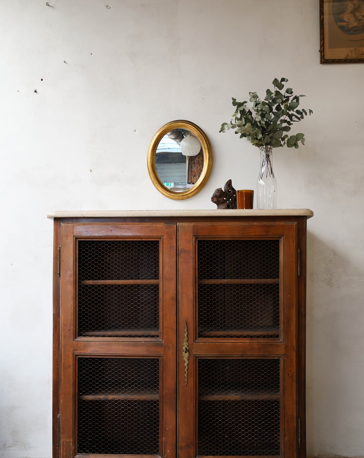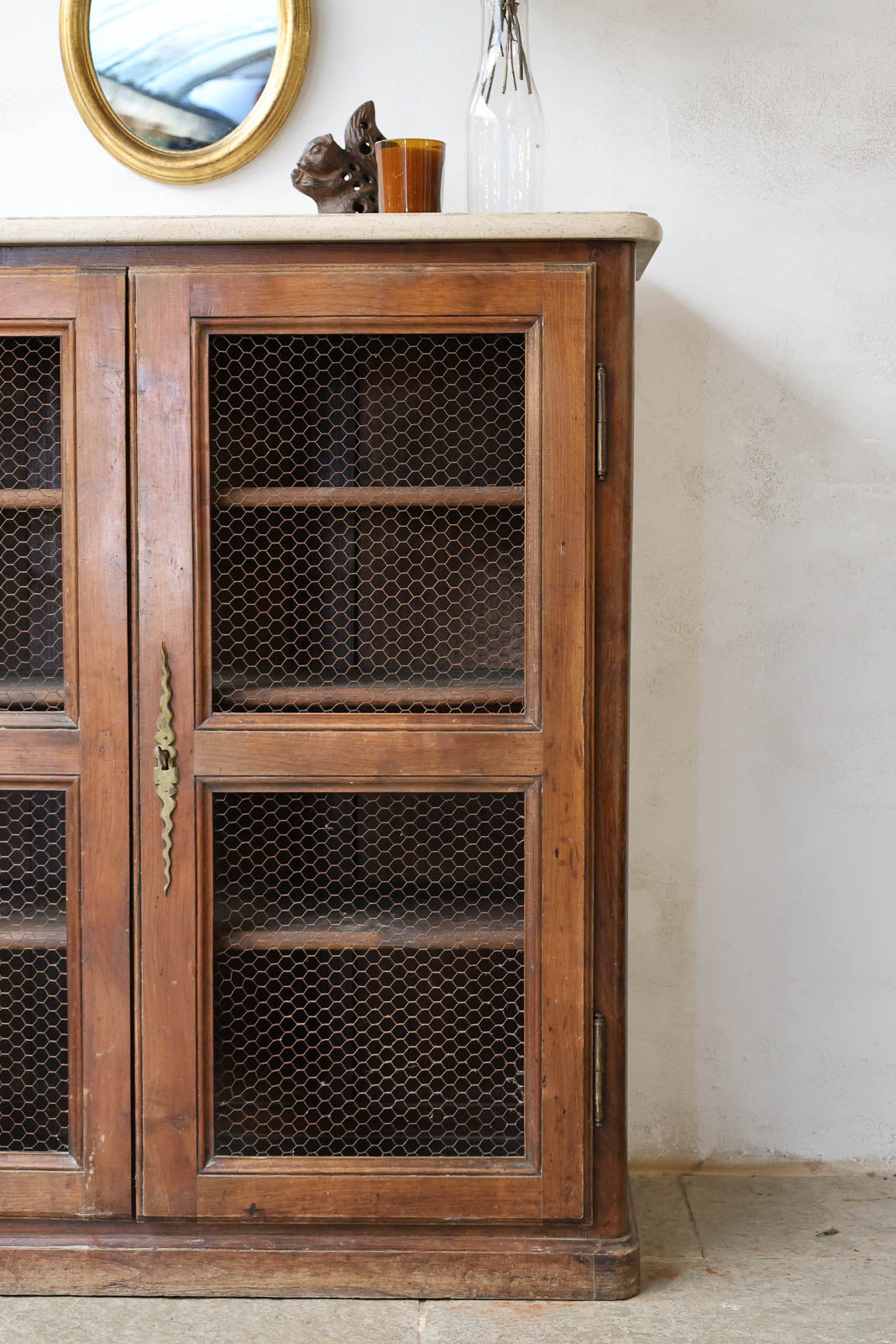 Discover this wooden chest of drawers with a beige marble top, blending the warmth of wood with a mineral elegance. Its antique wire mesh doors and charming metal lock with key lend it the charm of old farmhouse furniture, while its generous size offers surprising storage capacity. Three removable and adjustable shelves allow you to adapt the interior to your needs, from linens to decorative objects, for an atmosphere that is both authentic and refined. Shelves are slightly worn.