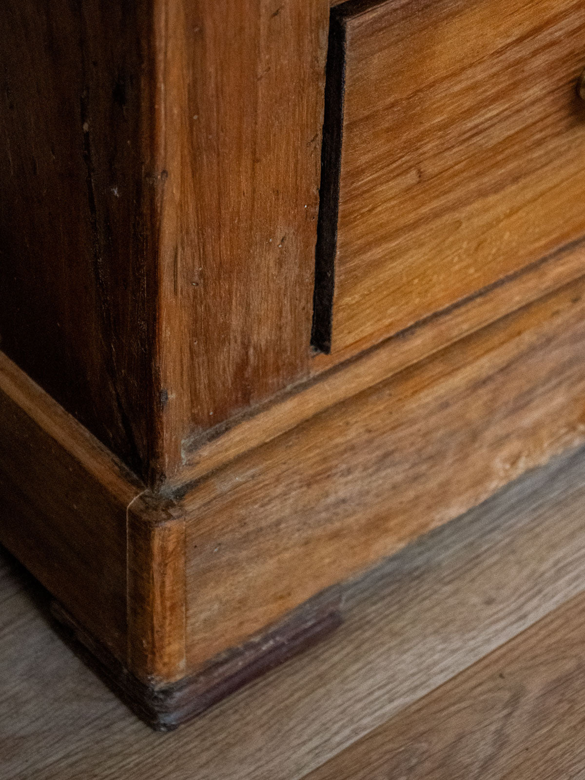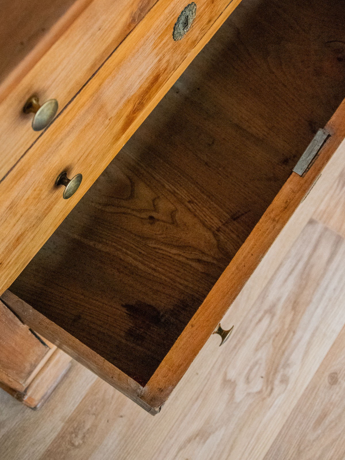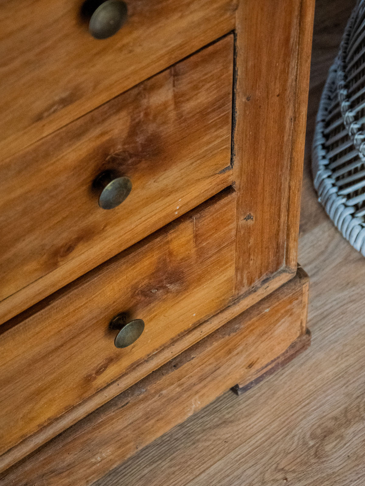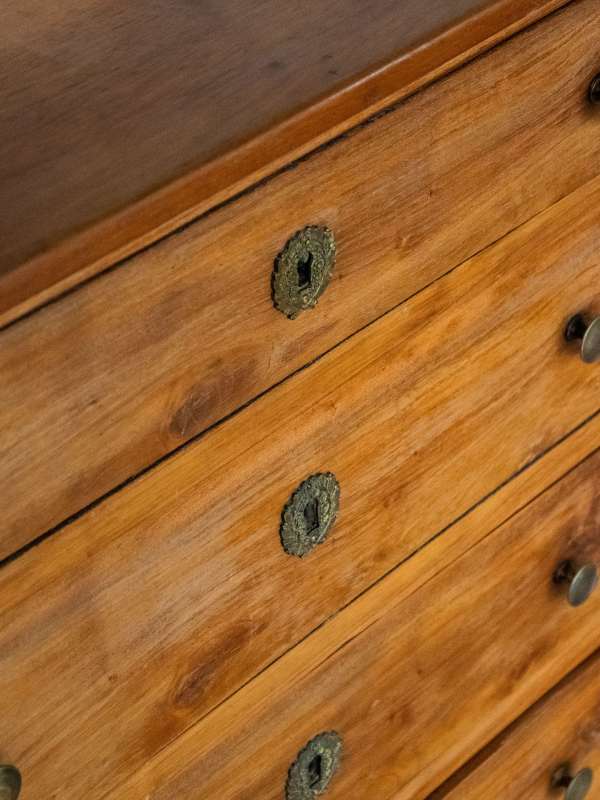 Adoptez cette commode quatre tiroirs au charme naturel, conçue en bois clair aux nœuds et nervures apparentes et dotée de poignées doubles en laiton qui soulignent son allure chaleureuse et élégante. Sa capacité de rangement épouse des proportions généreuses, idéale pour organiser linge ou accessoires dans une chambre ou une entrée, tandis que les serrures apportent une note d'authenticité malgré l'absence de clé. Son bois vivant diffuse une ambiance douce et accueillante. Quelques marques d'usage qui font son authenticité.