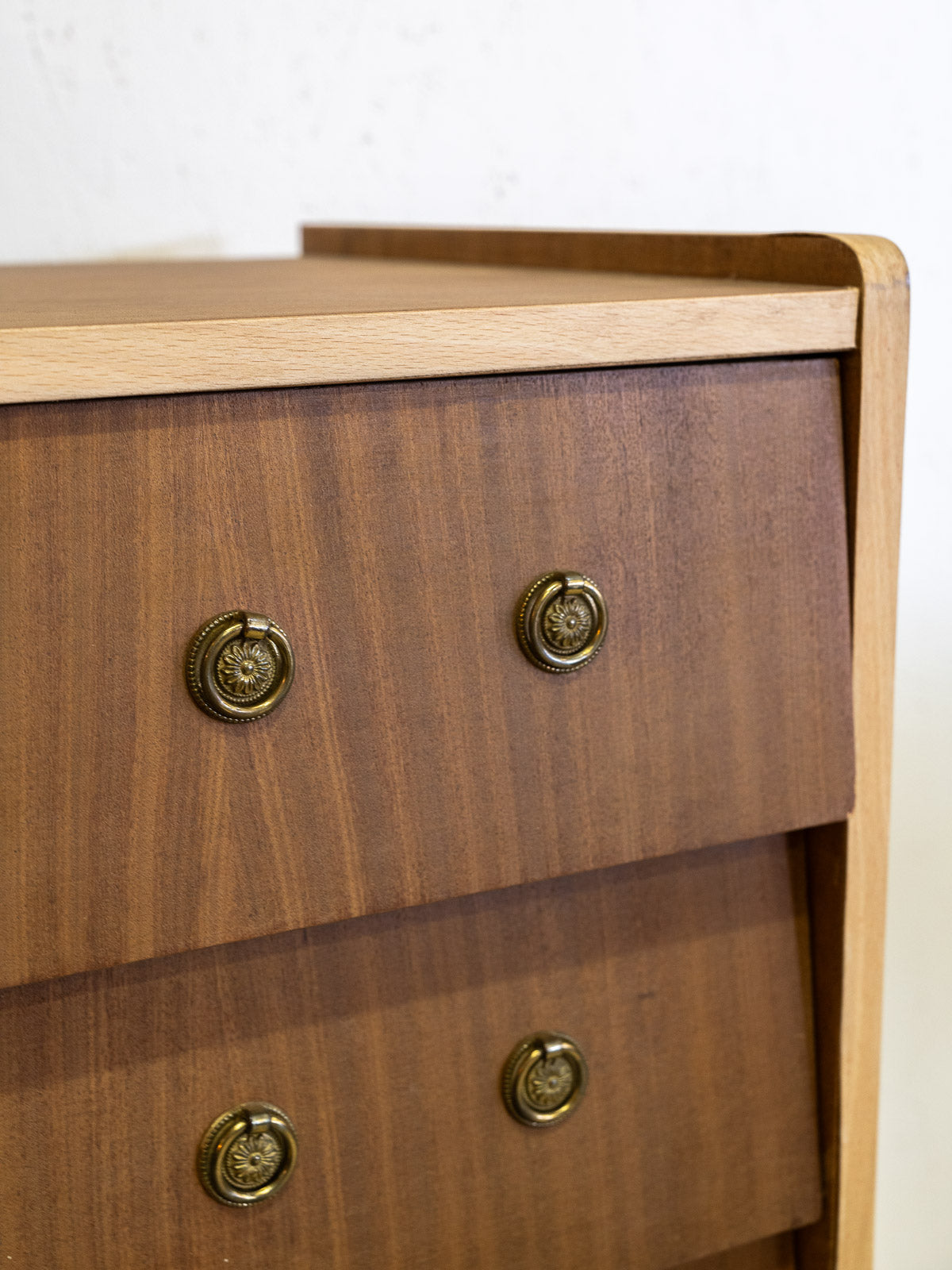Elevate your interior with this 1960s teak veneer chest of drawers. Its wooden frame and original metal handles lend it an elegant retro charm. Four drawers offer ample storage without cluttering the space, making it ideal for a bedroom, entryway, or a warm and inviting living room. The patinated finish adds a soft, timeless presence to the piece. A few signs of wear only enhance its authenticity.