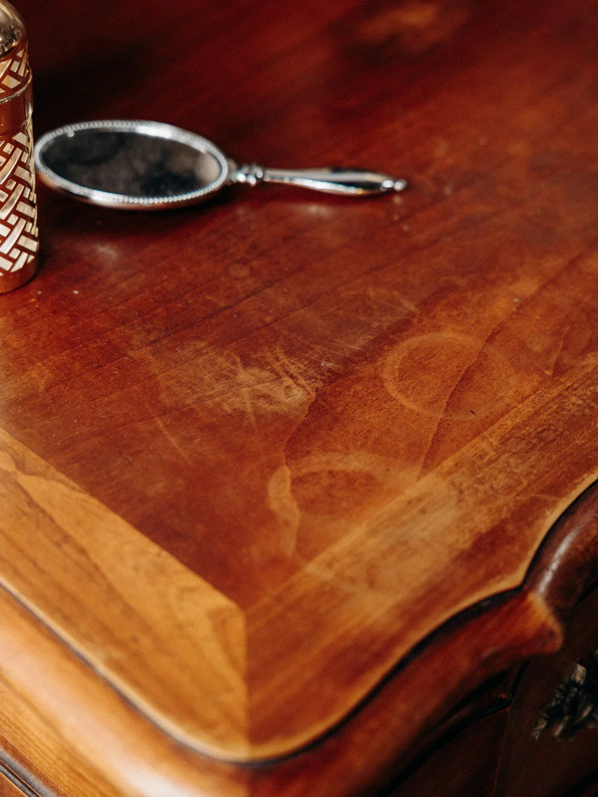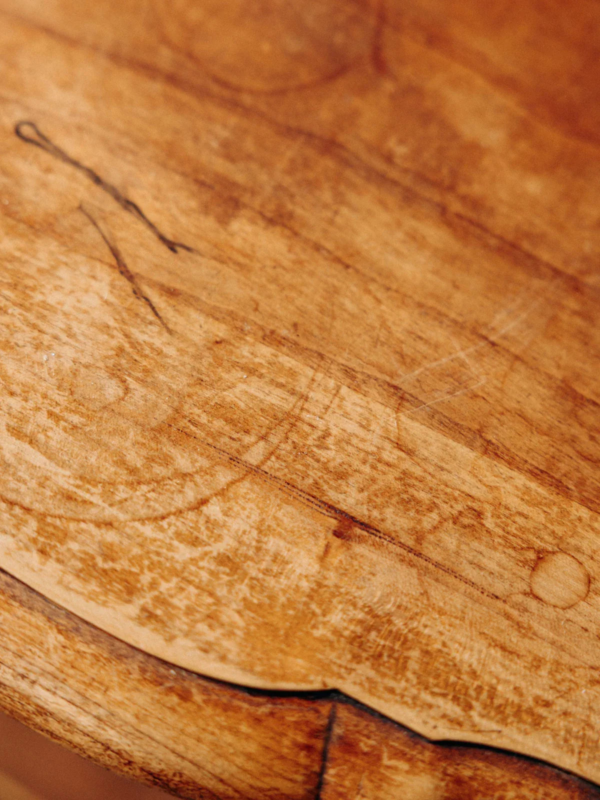 Discover this wooden chest of drawers with its warm lines and curved legs, which brings understated elegance to a bedroom or entryway. Its three drawers, adorned with metal handles and lined with tapestry, offer neat storage that protects linens and small items. Its well-proportioned design allows it to occupy space without overwhelming it, revealing a natural patina full of character. The top is slightly damaged.