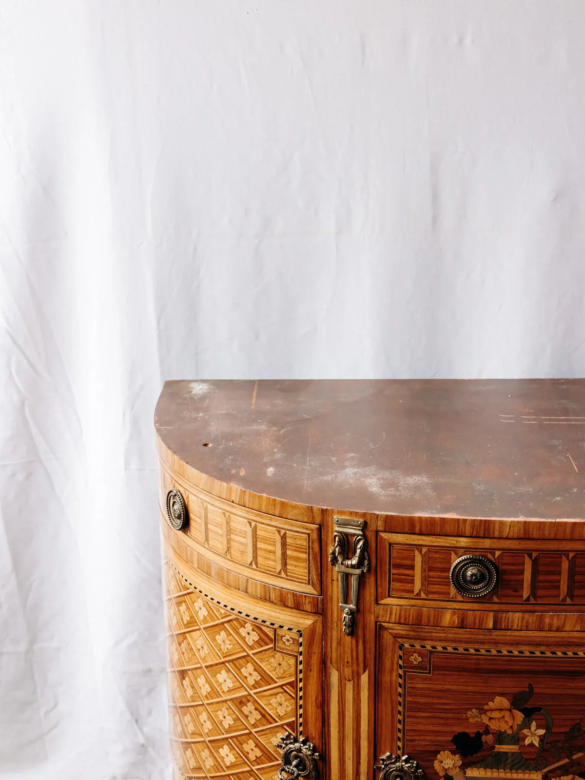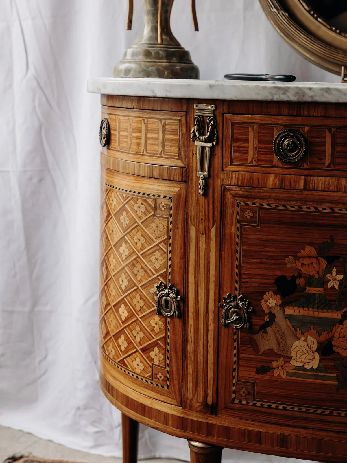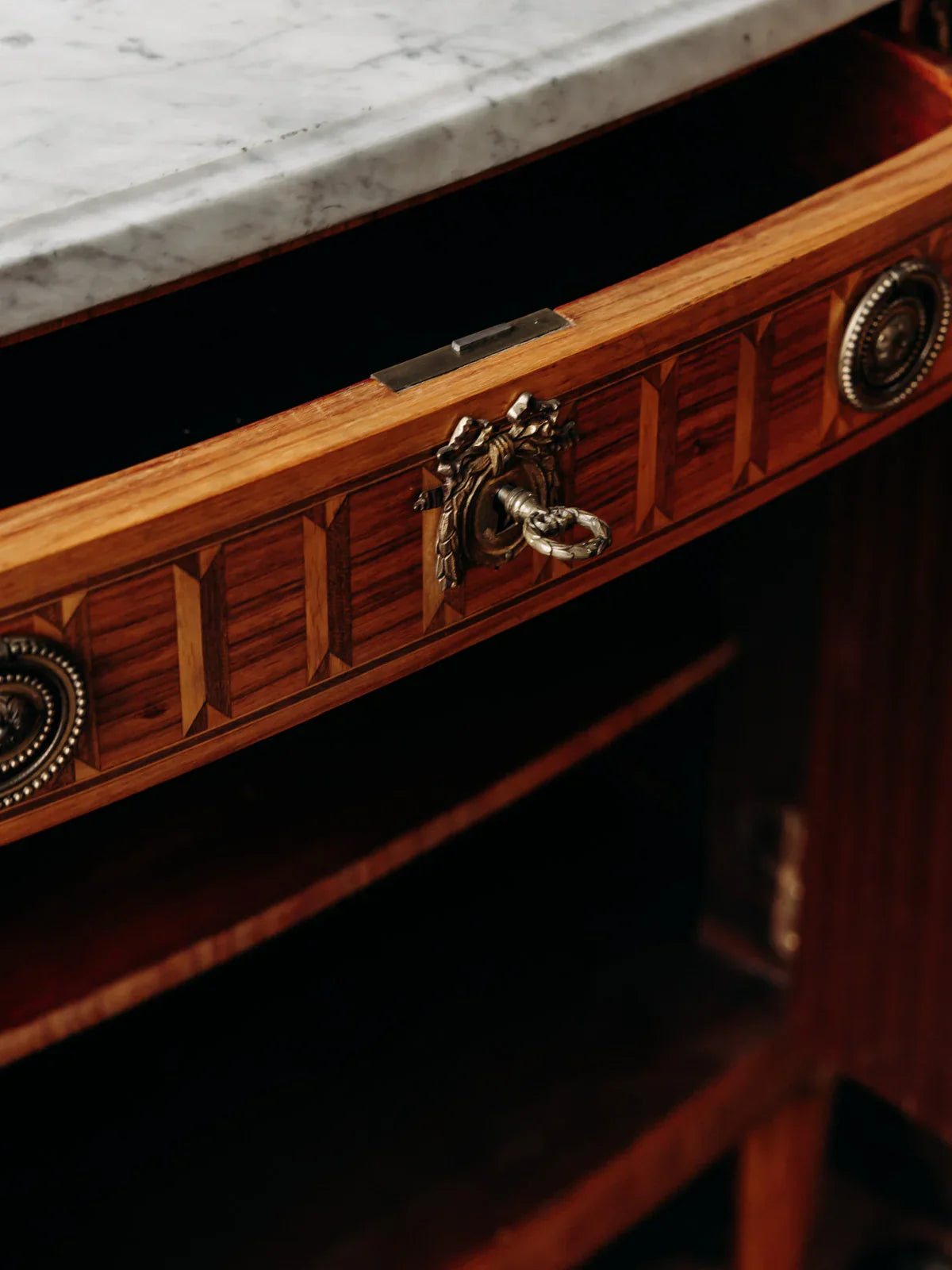 Elevate this wood and marble chest of drawers with its balanced lines and understated elegance. The half-moon white marble top, paired with gilded brass details, highlights its refined aesthetic, while its four straight legs lend it a stable and contemporary presence. Three drawers and three cupboards offer organized storage, perfect for an entryway, living room, or bedroom where its generous proportions are fully appreciated. It instills a warm and structured atmosphere. The top is slightly damaged beneath the marble.