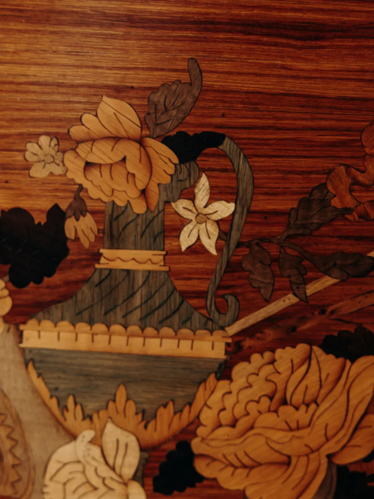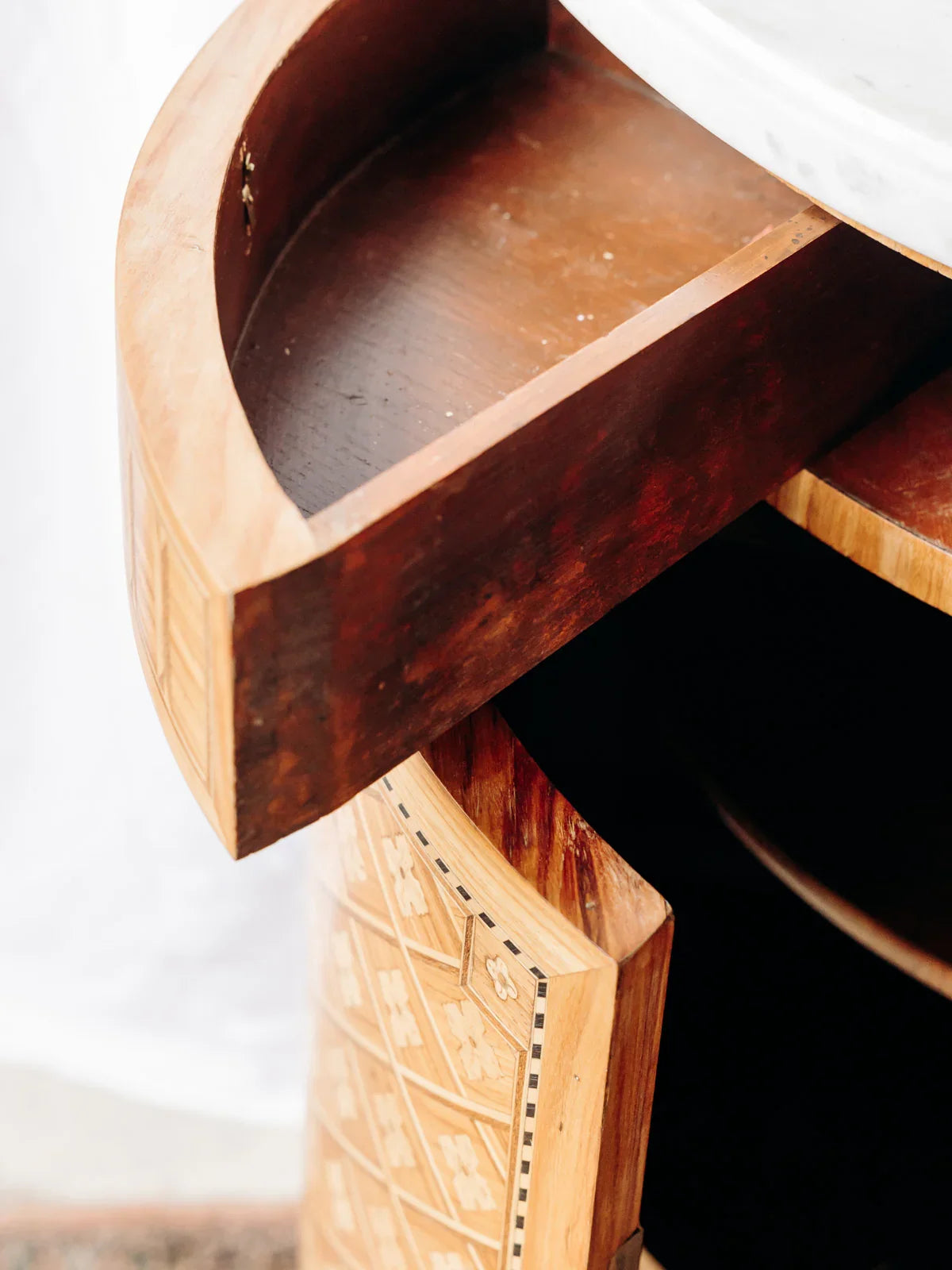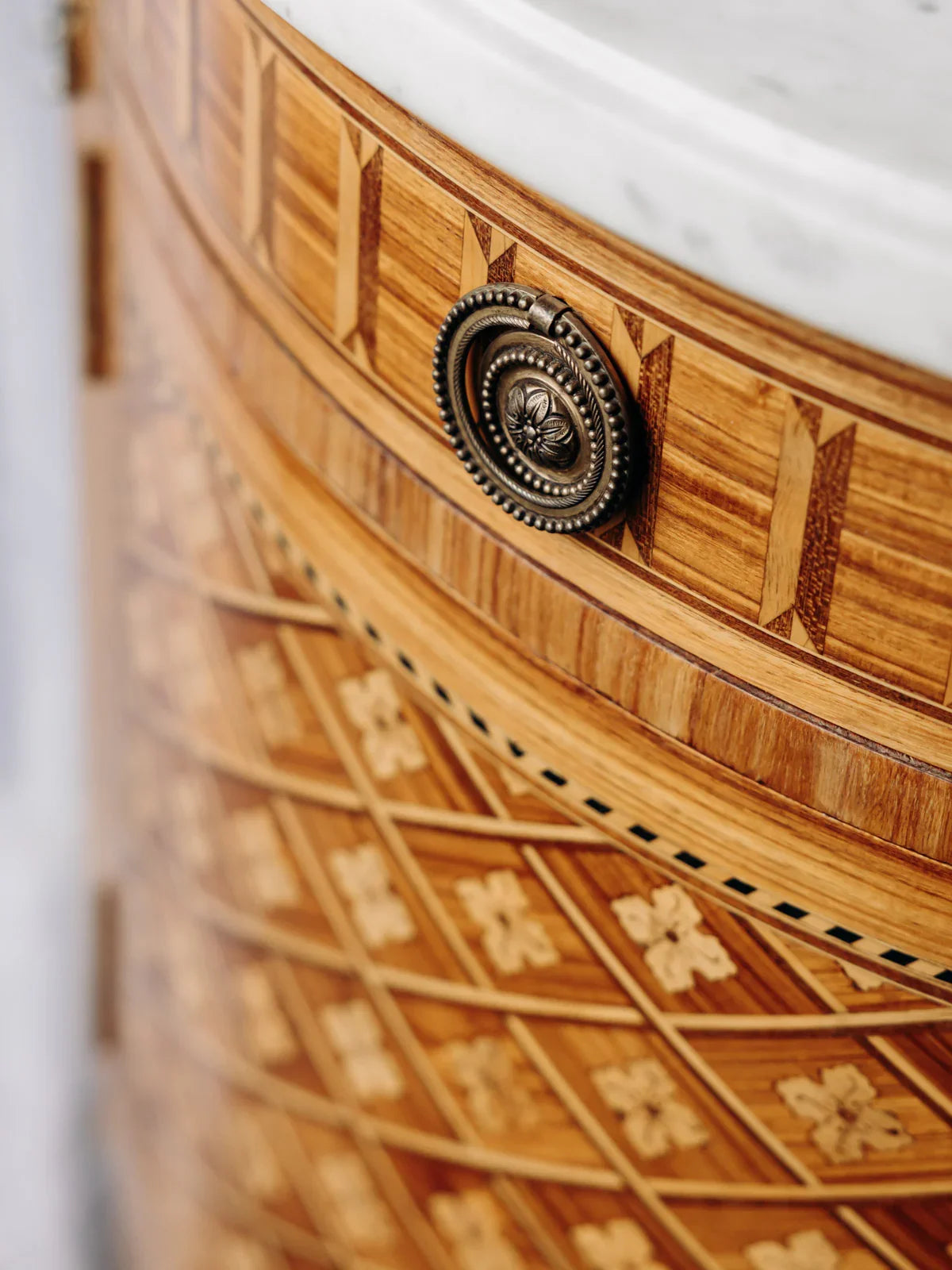 Elevate this wood and marble chest of drawers with its balanced lines and understated elegance. The half-moon white marble top, paired with gilded brass details, highlights its refined aesthetic, while its four straight legs lend it a stable and contemporary presence. Three drawers and three cupboards offer organized storage, perfect for an entryway, living room, or bedroom where its generous proportions are fully appreciated. It instills a warm and structured atmosphere. The top is slightly damaged beneath the marble.