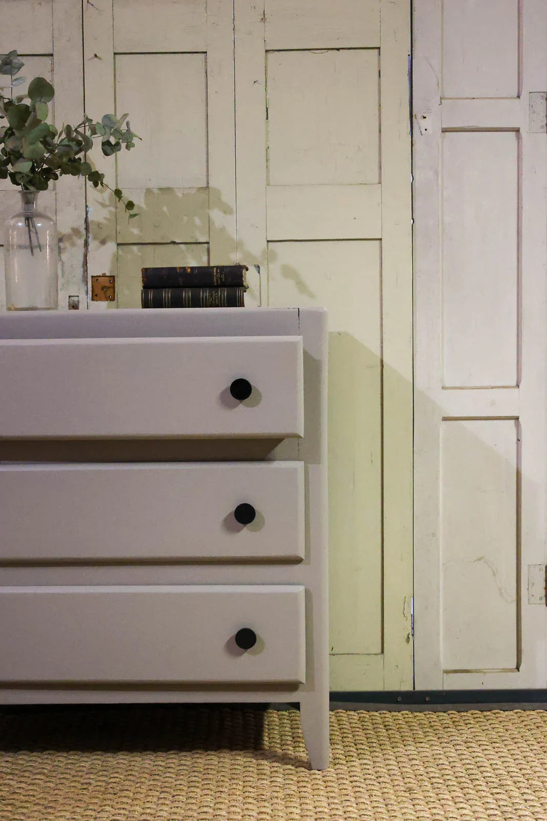 Choose this grey chest of drawers with splayed legs and black knobs, whose understated finish evokes mid-century design and lightens the silhouette. Its three drawers offer clever storage, with depths perfectly suited for linens, accessories, or papers, and its proportions fit easily into a bedroom, entryway, or living room. The subtle contrast between the grey hue and the black handles creates a warm and elegant atmosphere.