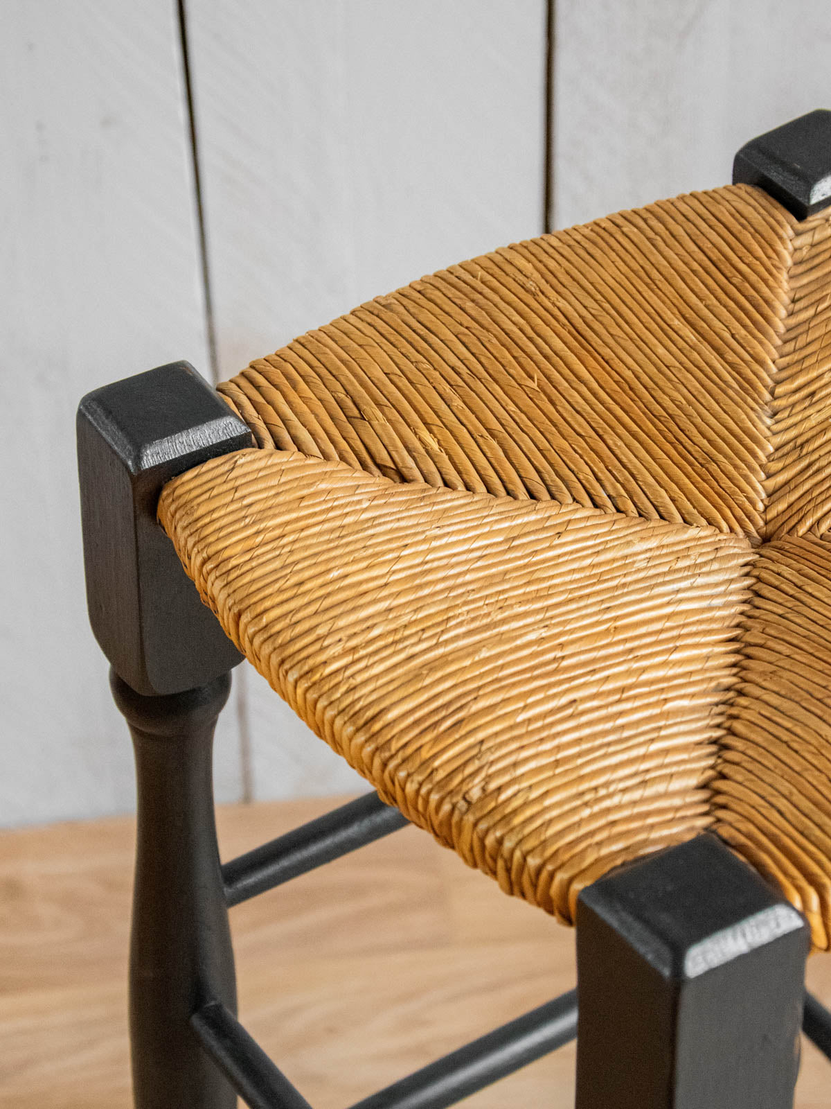 Discover this straw bar stool with black wooden legs, a piece that combines handcrafted simplicity with a contemporary silhouette. The woven fiber seat provides a warm, natural texture, while the dark frame highlights clean, graphic lines that are easy to integrate into any space. Its comfortable height and proportions make it a perfect companion for a worktop, island, or inviting corner. Its understated style creates an elegant and intimate atmosphere. Minor signs of age.