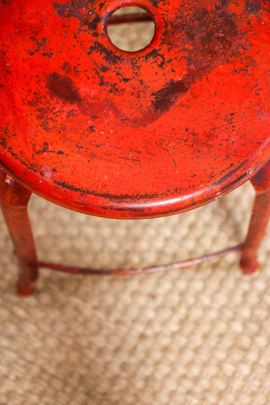 Adopt this vintage zinc workshop stool with its red patina, whose finish tells a story of past uses. Its seat height makes it ideal for a work surface or island, and its narrow profile allows it to easily fit into a corner or around a table. Its industrial style adds a touch of character and a warm atmosphere, perfect for a loft, café, or creative studio.