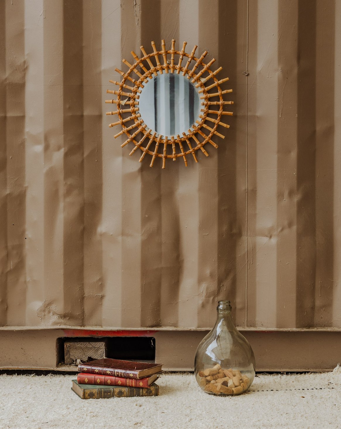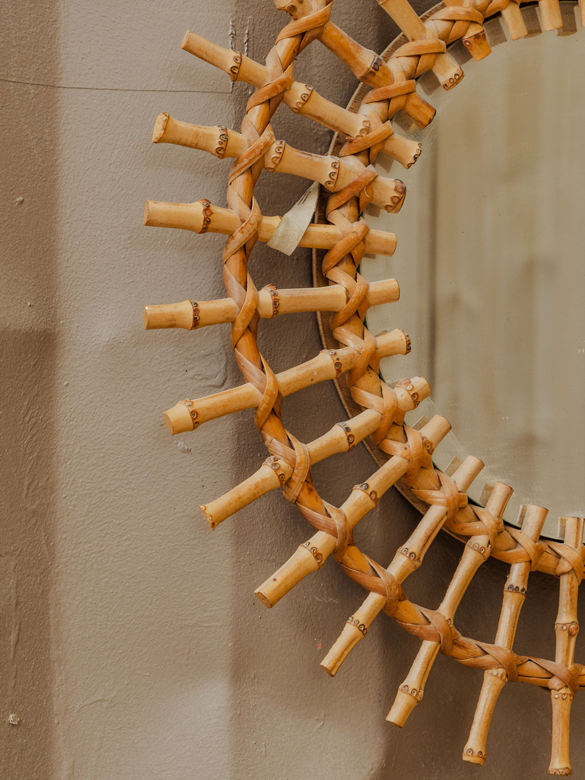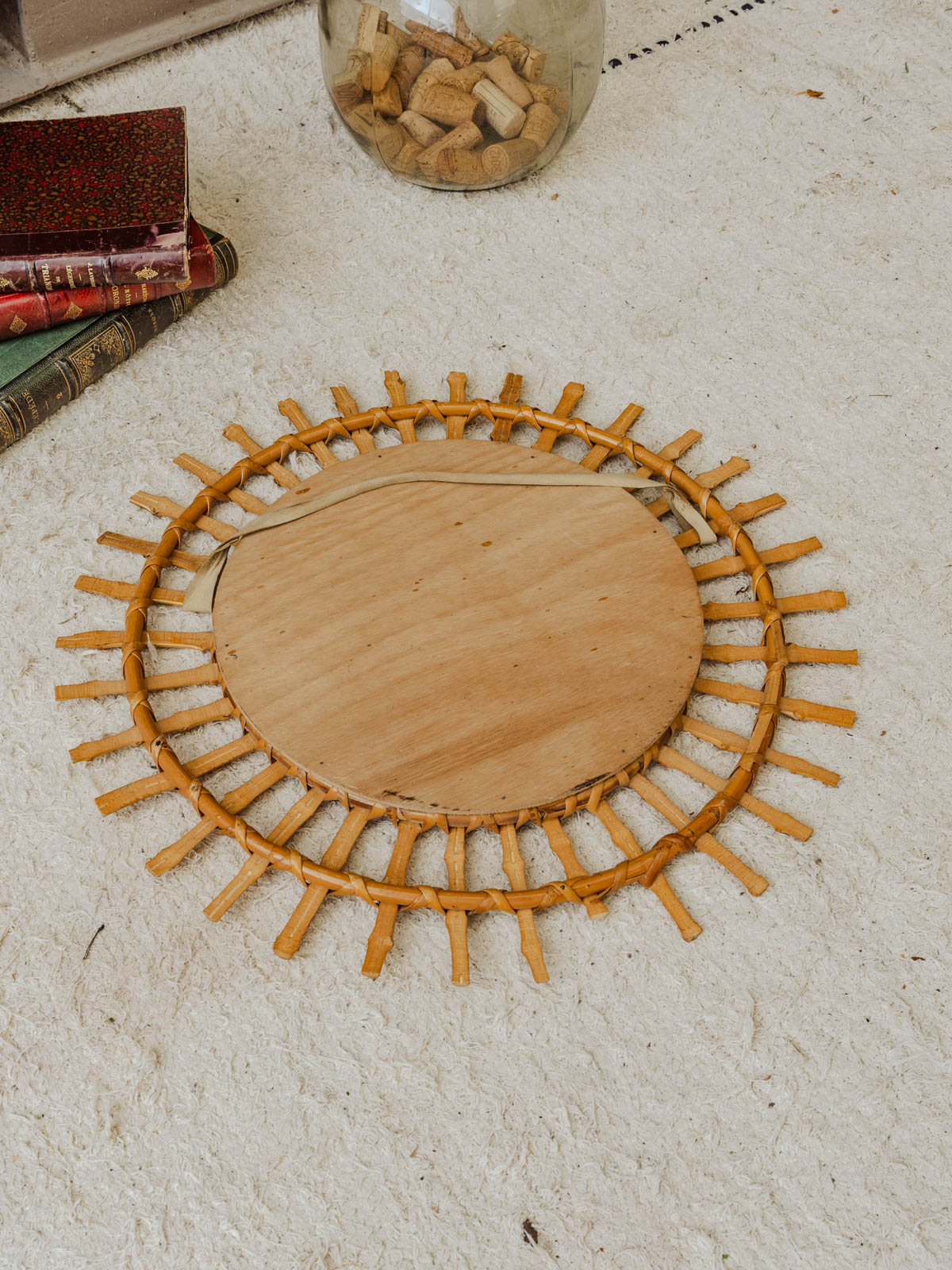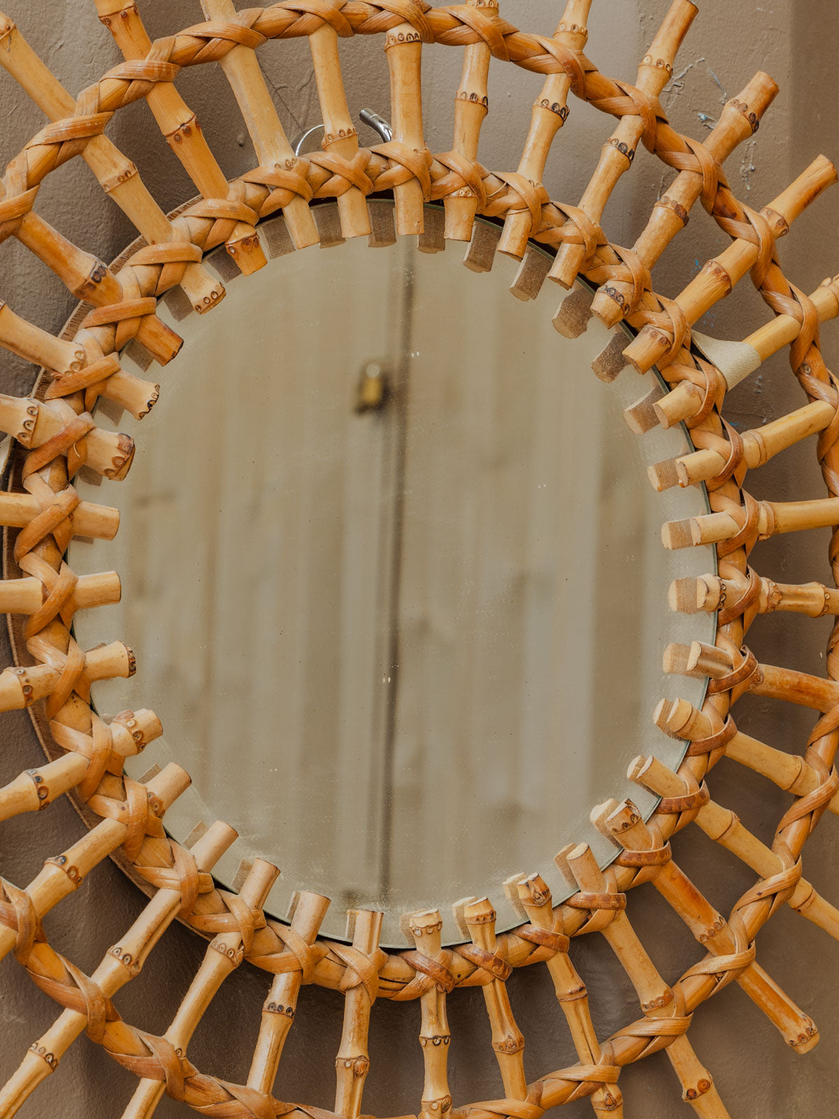 Invitez ce miroir soleil en bambou, son cadre rayonnant révèlent une silhouette légère et graphique. Le miroir offre un reflet intime tout en illuminant l'espace. Son format le rend parfait pour une entrée, un salon ou une chambre où il apportera chaleur et texture naturelle. La teinte du bambou crée une ambiance bohème-chic, sobre et accueillante. Quelques traces du temps présentes.
