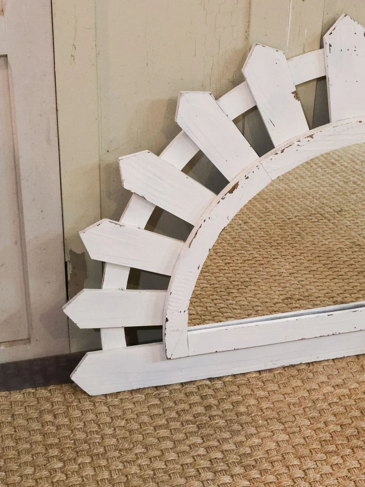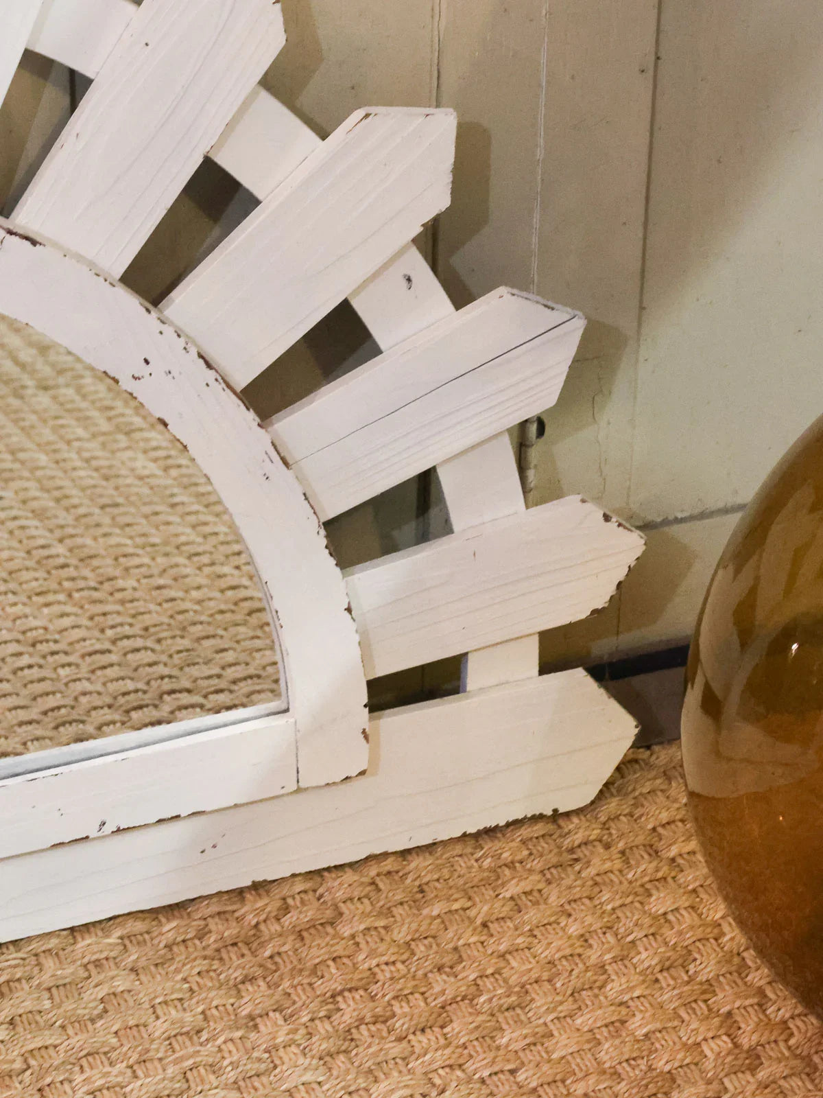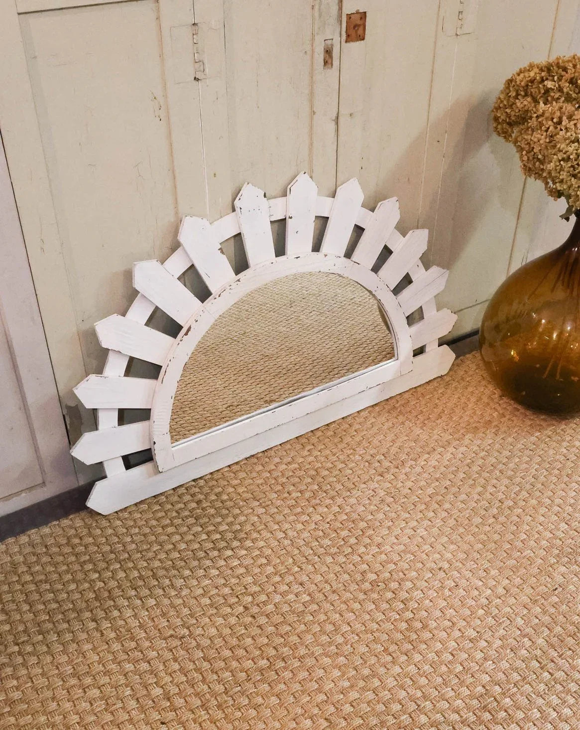 Discover this half-sunburst mirror in white-painted wood, a sculptural piece that diffuses light and adds elegant rhythm to the wall. Its generous width and shallow profile make it an ideal accessory above a console table, fireplace, or in an entryway, bringing a warm and refined touch without overwhelming the space. The painted frame highlights the glass, emphasizing its graphic shapes for a soft and contemporary atmosphere.