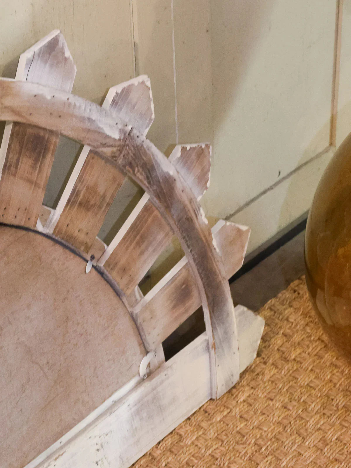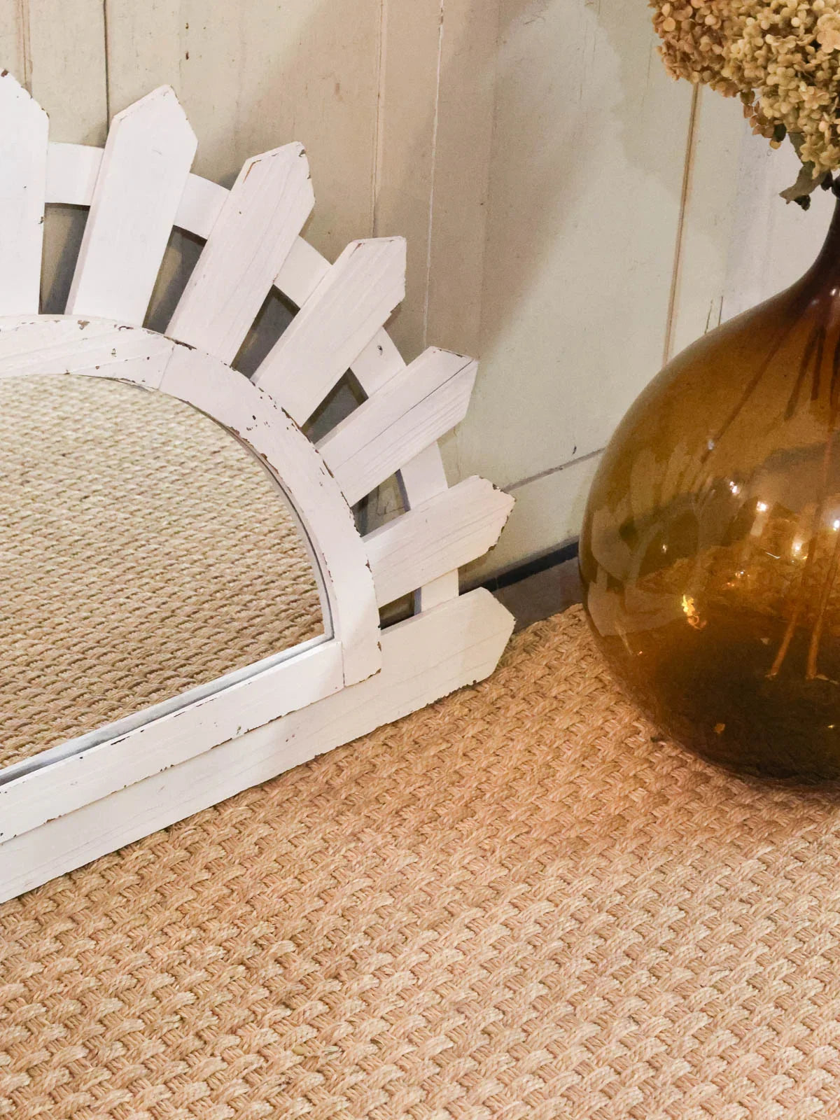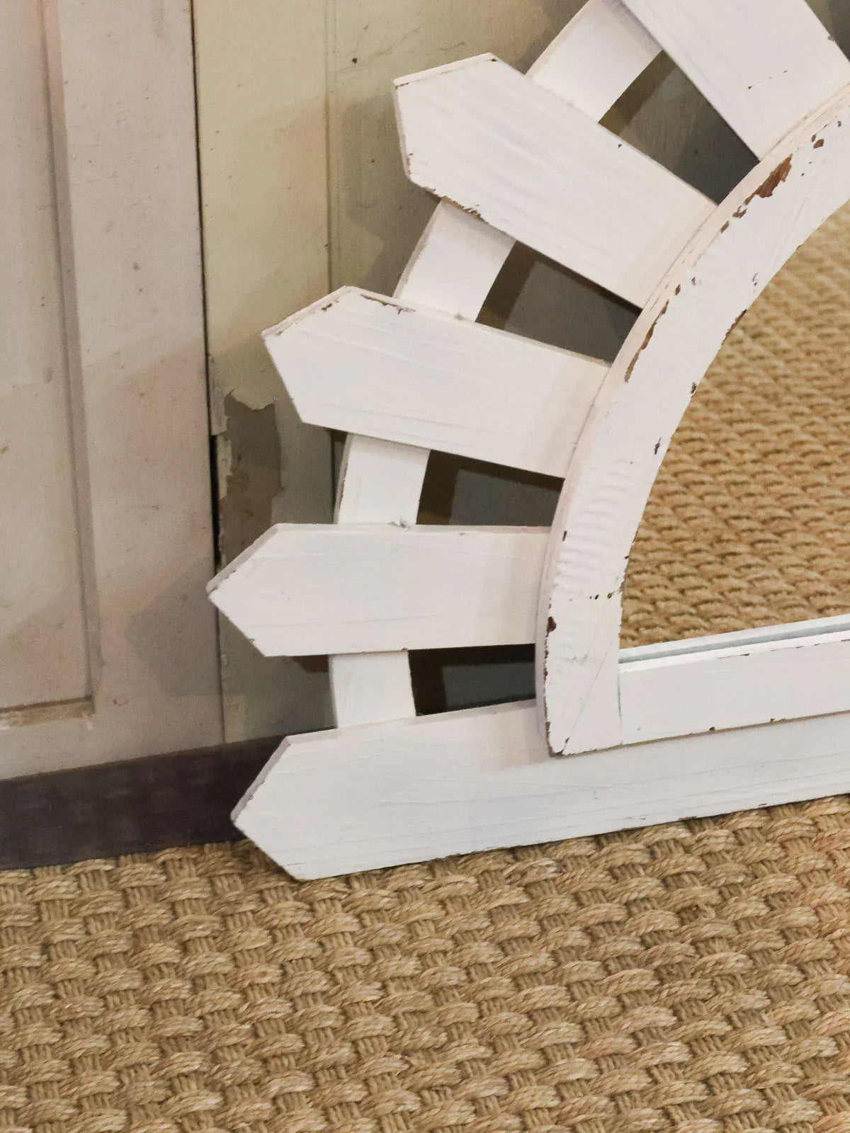 Discover this half-sunburst mirror in white-painted wood, a sculptural piece that diffuses light and adds elegant rhythm to the wall. Its generous width and shallow profile make it an ideal accessory above a console table, fireplace, or in an entryway, bringing a warm and refined touch without overwhelming the space. The painted frame highlights the glass, emphasizing its graphic shapes for a soft and contemporary atmosphere.
