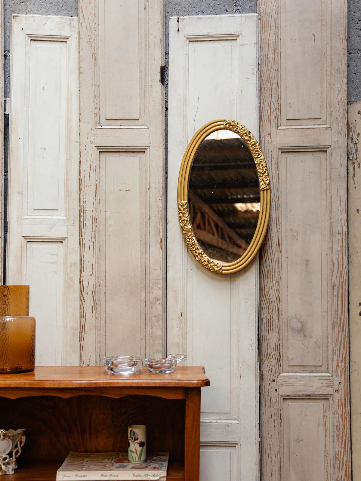 Enhance your interior with this oval mirror featuring a gold frame adorned with floral motifs, a piece that blends classic elegance with a warm presence. The intricate design of the frame captures the light and structures a wall, making it ideal above a console table in the entryway, a fireplace, or a vanity area to create a refined atmosphere. The slightly patinated glass adds character and subtle depth to the reflection. Minor pitting on the glass.