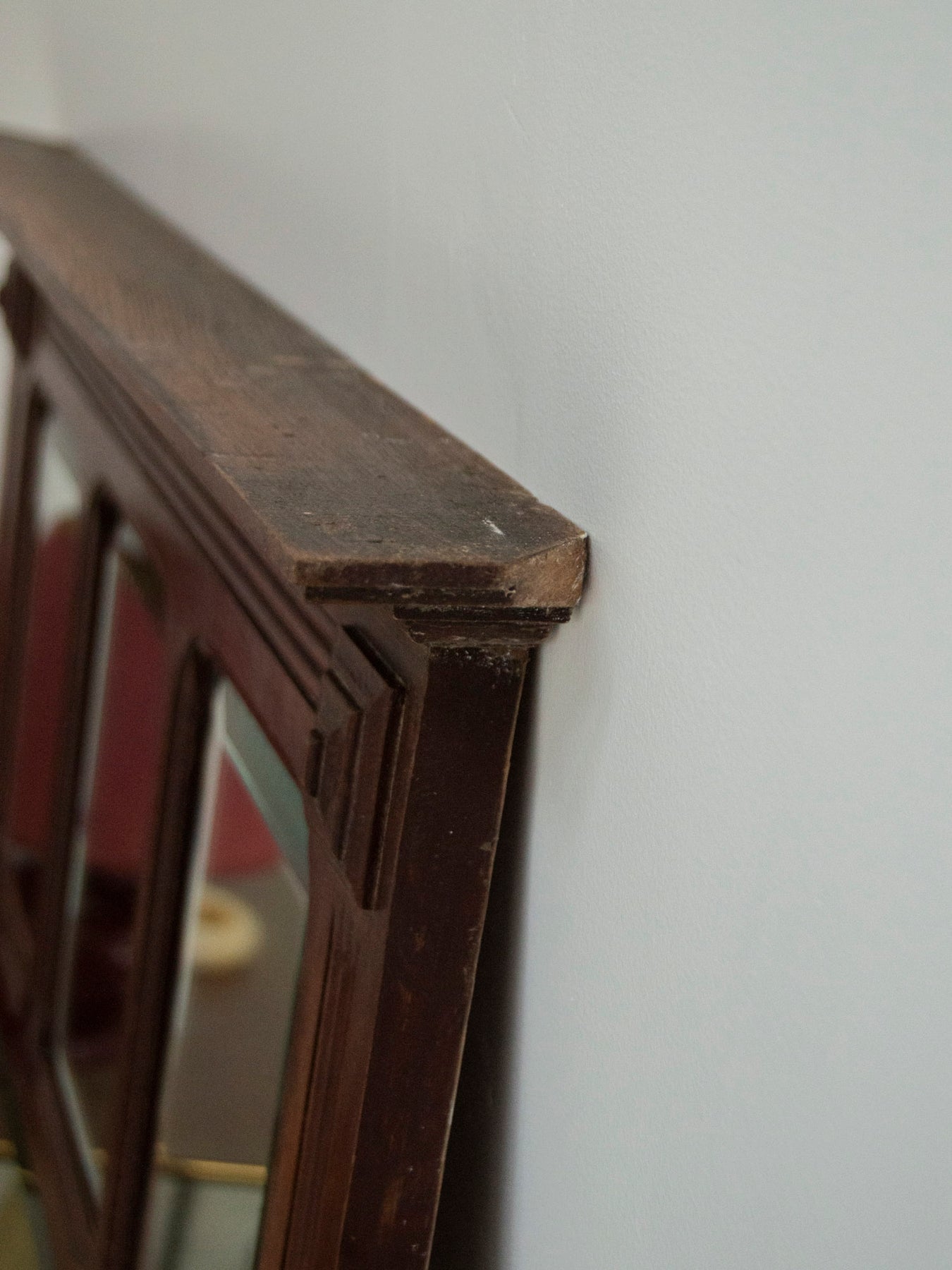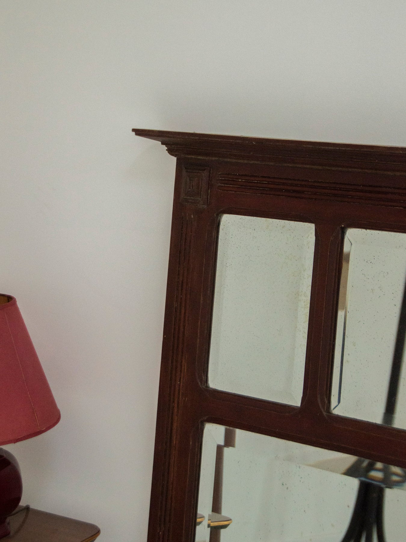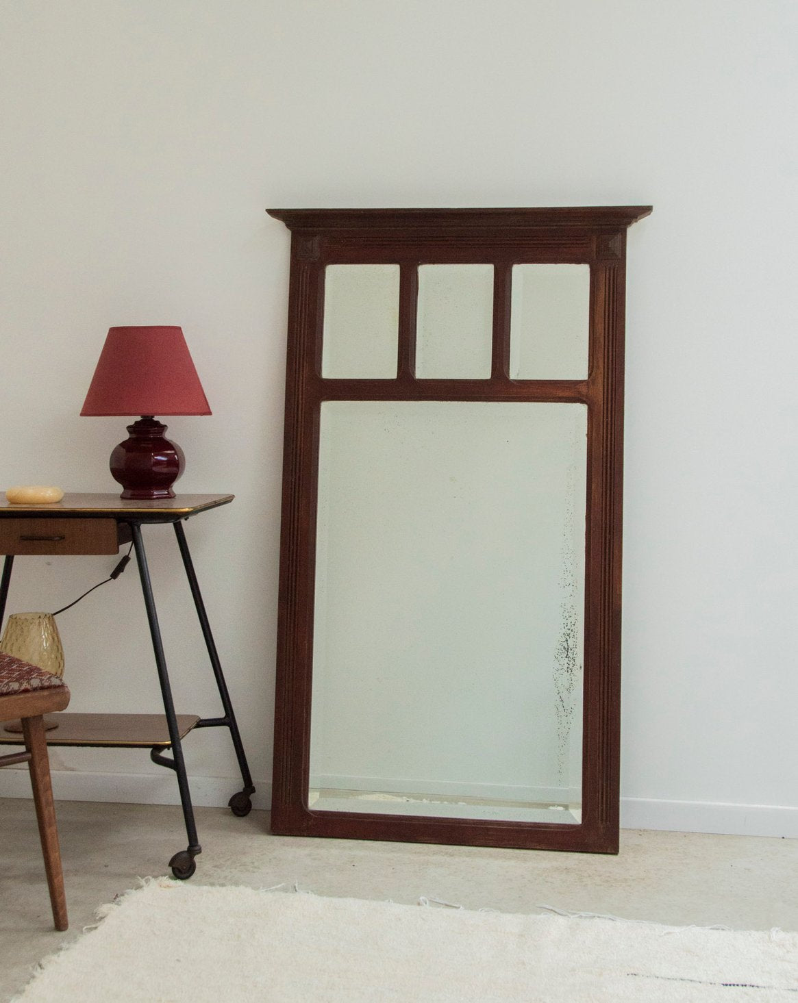 Enhance your interior with this large trumeau mirror in an oak frame, whose clean, sculpted lines lend a refined and welcoming presence. The three upper panes structure the composition, while the generous width creates ideal depth above a fireplace or in an entryway, reflecting light to visually enlarge the room. Its natural patina imparts an antique and elegant charm, perfect for a welcoming and timeless décor. Minor pitting on the glass.