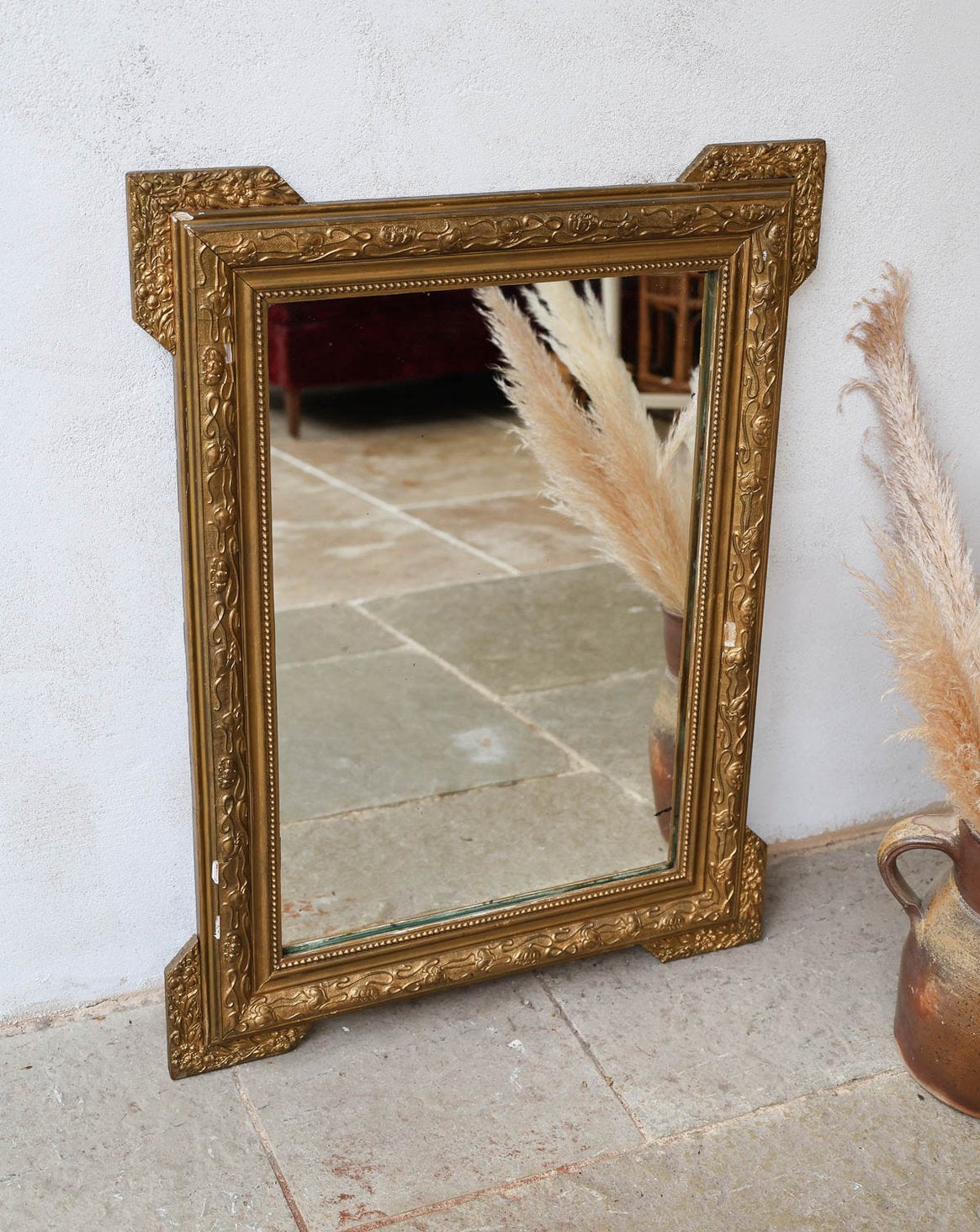 Enhance your interior with this antique gilt mirror featuring a finely carved wooden frame, adding a touch of classic warmth. Its slender proportions and slightly frosted glass accentuate the dimensions of an entryway, bedroom, or living room, creating a soft light and a refined presence. The handcrafted woodwork and gilding highlight a historical style that easily integrates into a contemporary or retro decor. There are a few minor chips in the wood.