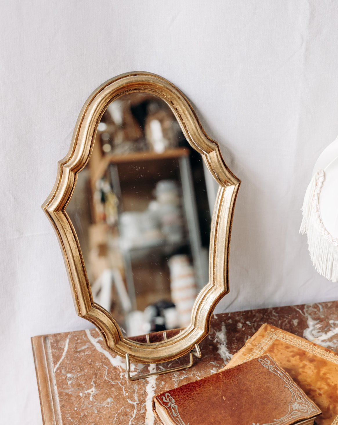 Add this small gold mirror to your home: its delicately gilded frame and beveled glass diffuse light elegantly, adding a touch of refined sophistication without being ostentatious. Designed for easy hanging with a hook on the back, its compact, vertical shape fits perfectly in an entryway, bathroom, or vanity area, making the most of narrow walls. Ideal for creating a warm and inviting atmosphere.