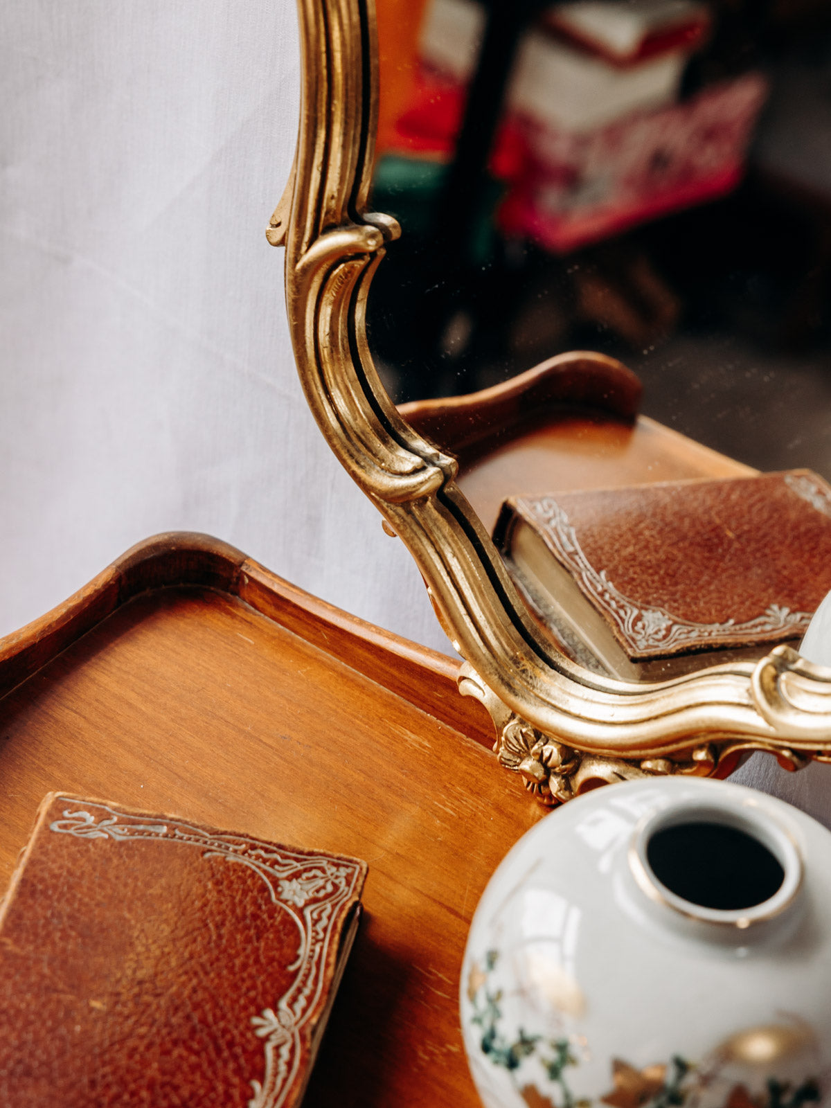 Enhance your interior with this large, ornately framed gold mirror. Its beveled glass captures light and visually expands the space. Its slender height and shallow depth make it perfect for an entryway, bedroom, or living room, while the hook on the back ensures easy and discreet installation. The gold border adds a warm and refined touch, ideal for creating an elegant and inviting atmosphere.