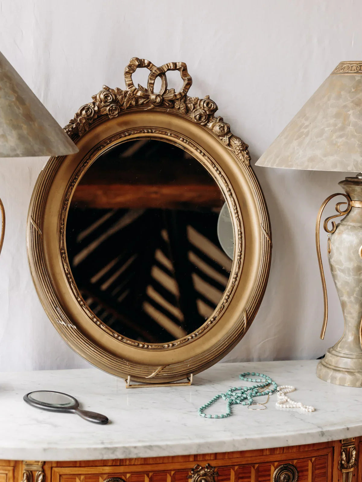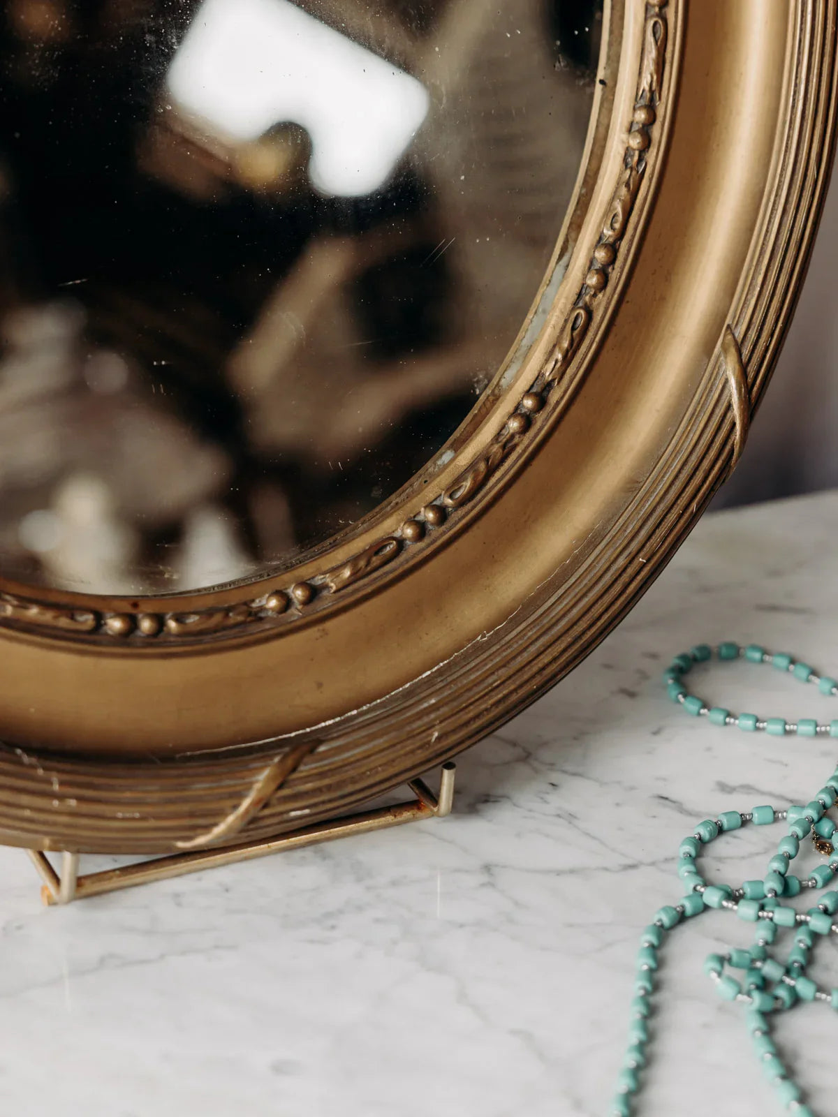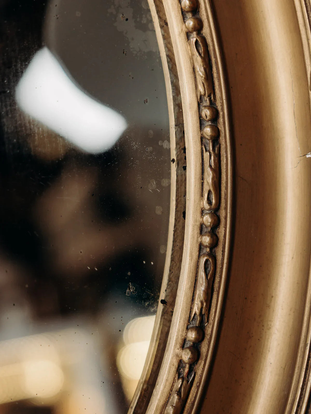 Enhance your interior with this gilded wooden medallion mirror featuring an oval glass panel and a carved knot, lending it a classic and delicate air. Its generous size brings light and depth, making it ideal for an entryway, mantelpiece, or chest of drawers, while exuding understated elegance. The warm patina of the wood and the soft reflection of the glass create a refined and inviting atmosphere. Minor cracks are present.