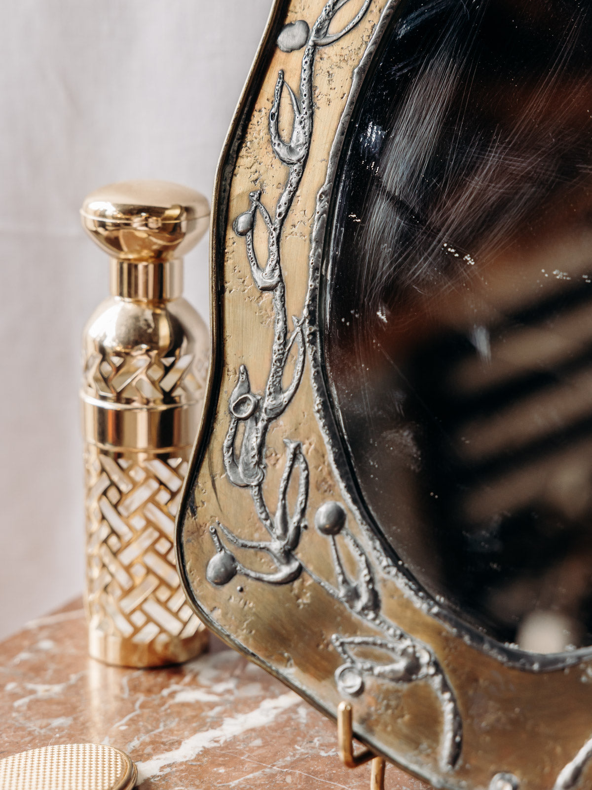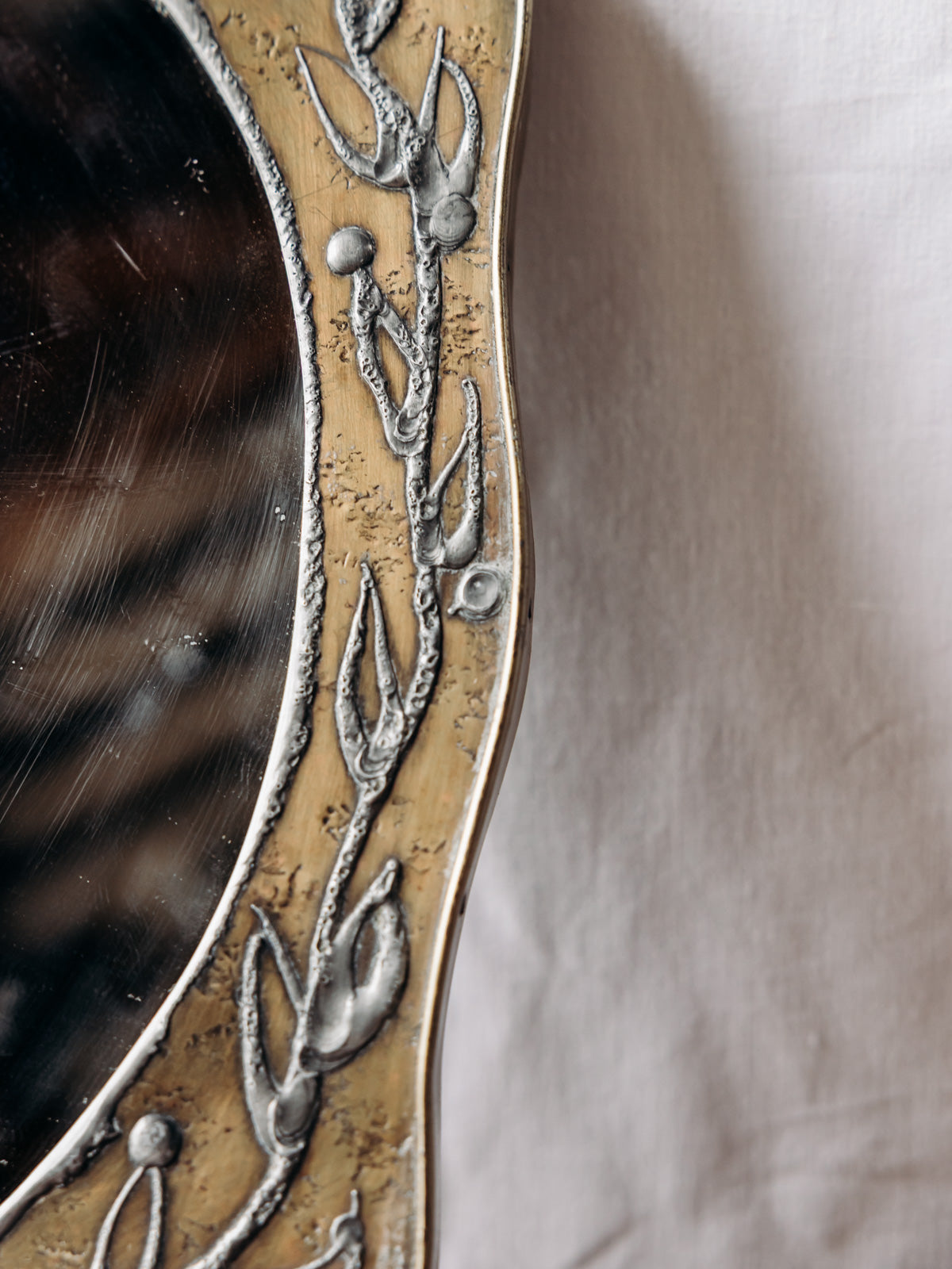Embrace this small brass mirror, delicately decorated with drawn plants and featuring a beveled frame that captures the light. Its slim profile and discreet hanging system make it practical for adding character to an entryway, a compact bathroom, or a dressing table. Its botanical style and patinated metal create a warm and refined ambiance, ideal for adding a touch of character without overwhelming the space. Minor wear.