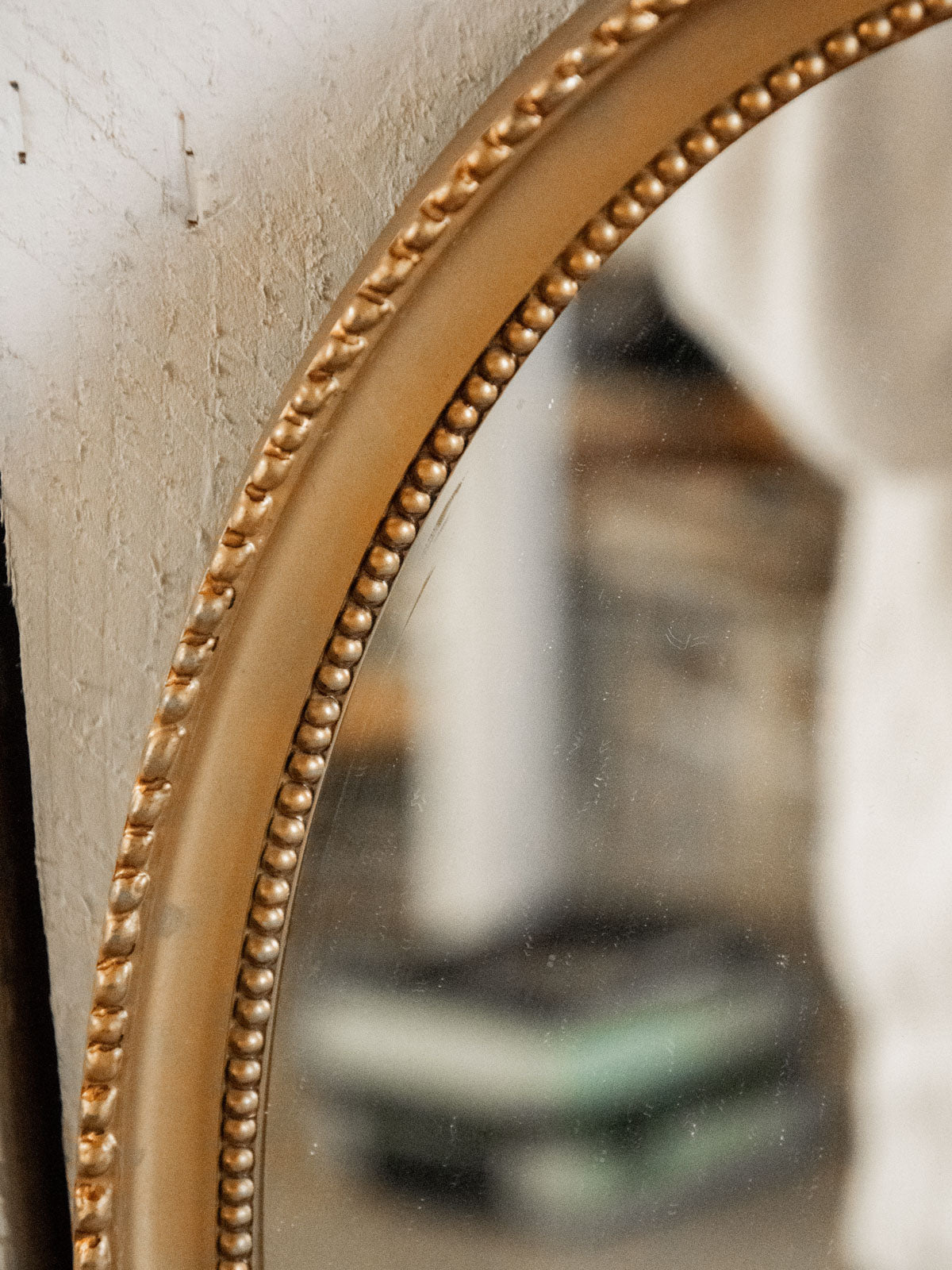 Invite this oval mirror in golden resin into your home to add an elegant and luminous touch. Its warm-toned frame structures the eye and enhances an entryway, bedroom, or bathroom by playing delicately with light. The interplay between contemporary material and classic silhouette creates a refined and welcoming atmosphere, easily integrated into various styles. No wall mounting required, and discreet signs of age.