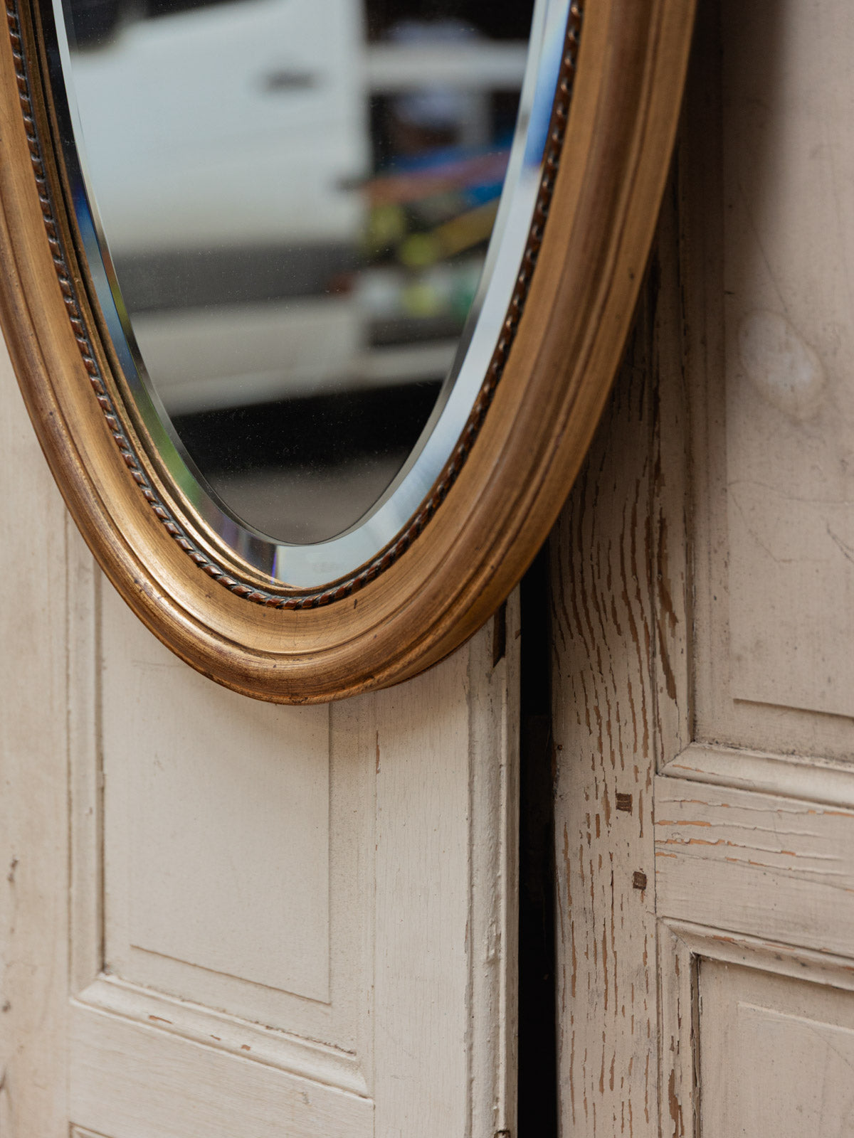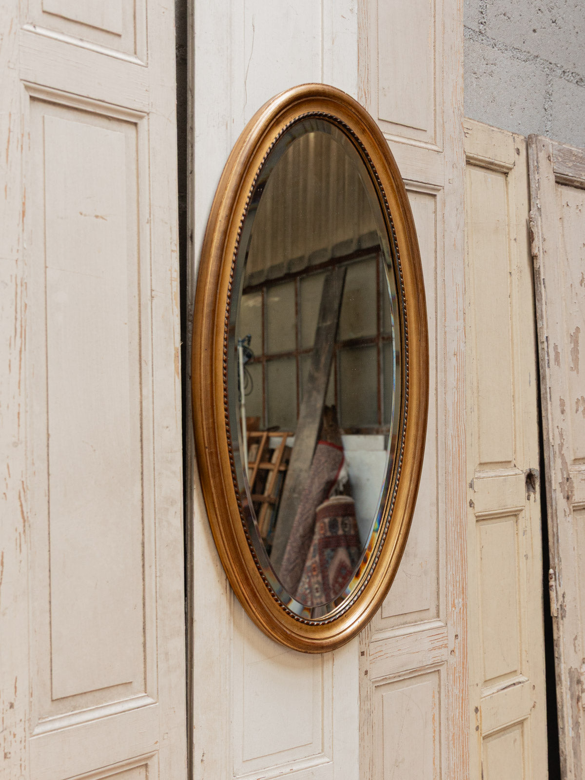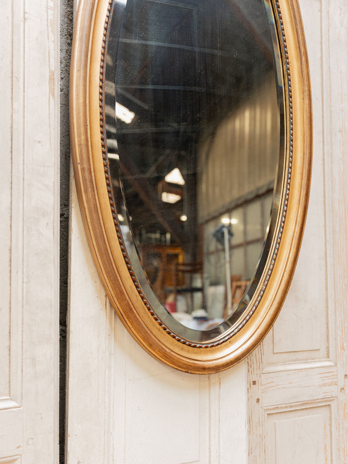 Enhance your interior with this large oval mirror, featuring a finely crafted gilt frame and a beveled glass that captures the light. Dating from the late 20th century, its design combines classic elegance with a contemporary presence, creating a warm focal point for an entryway, living room, or above a fireplace. Its generous proportions amplify the space and add beautiful depth, while the gilding softens the ambiance without being ostentatious. Minor signs of age.