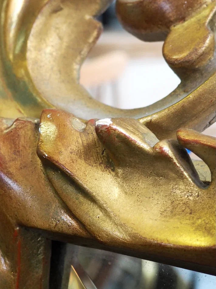 Discover this 19th-century Baroque mirror, a beveled glass set in a finely carved wood and gilt stucco frame. Its large size makes it an ideal focal point above a fireplace or console table, reflecting light and adding depth to the room. The patinated gilt and delicate ornamentation evoke a period elegance that blends seamlessly with both classic and contemporary interiors to create a refined and inviting atmosphere.