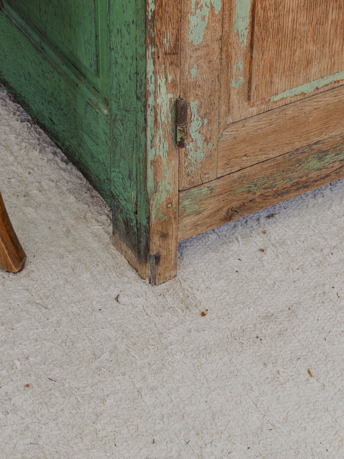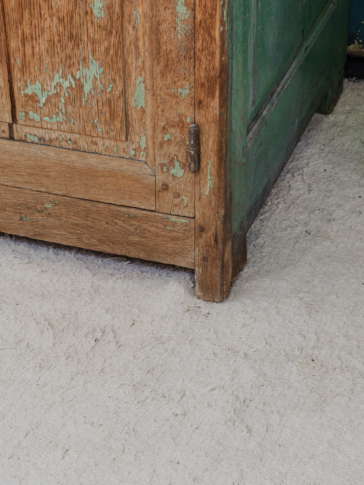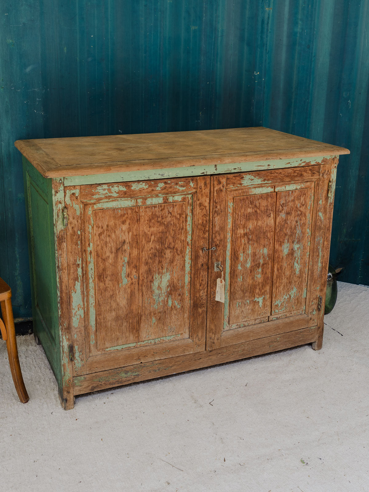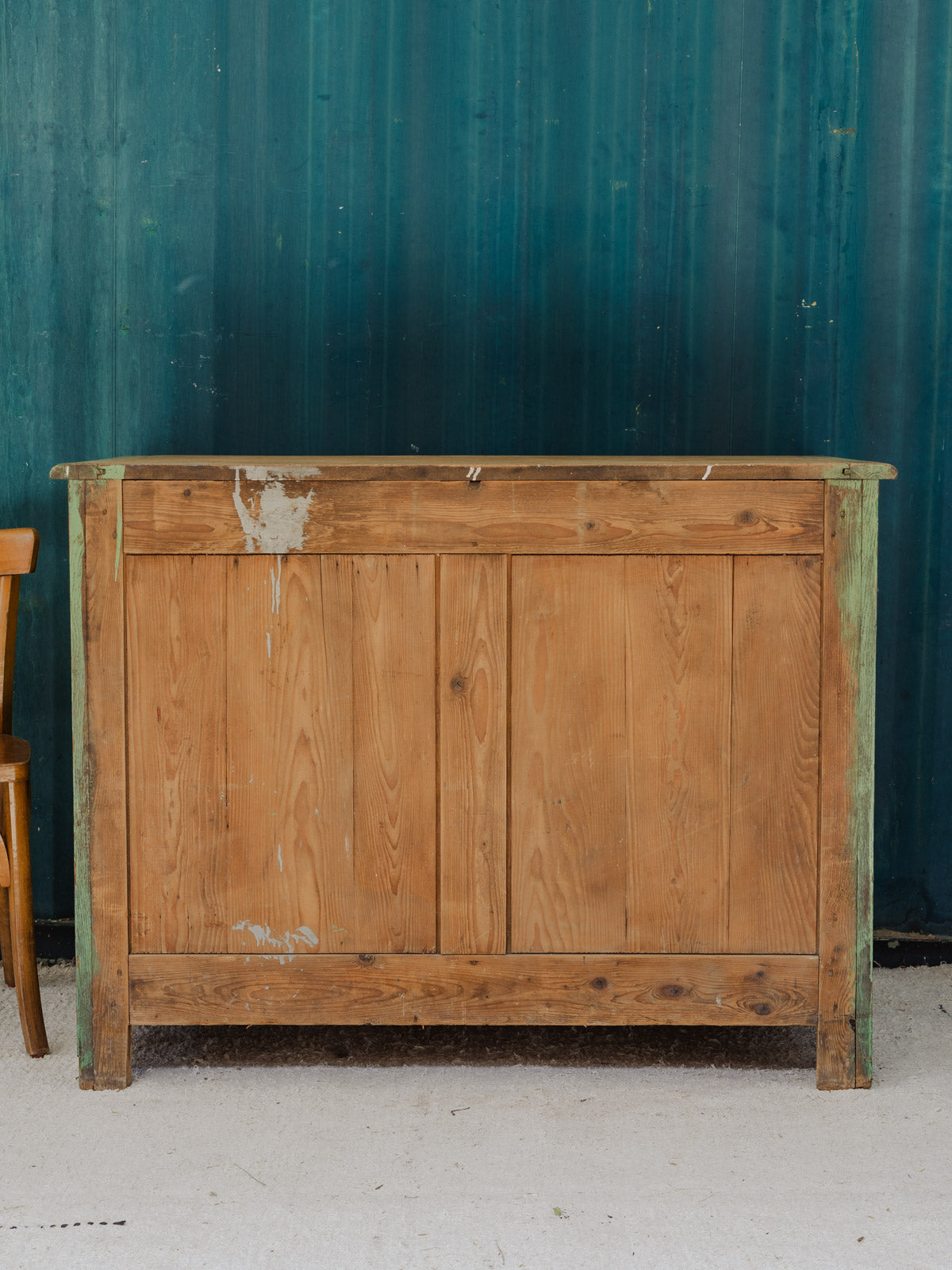 Enhance your interior with this green patinated wooden sideboard, whose gray-painted door interiors create an elegant and contemporary contrast. Its generously proportioned structure and interior shelf offer ideal storage capacity for dishes, linen, or living room items, while the natural patina emphasizes a warm and narrative style. Place it in a dining room or entryway for a sober and welcoming ambiance. Some traces of time are present.