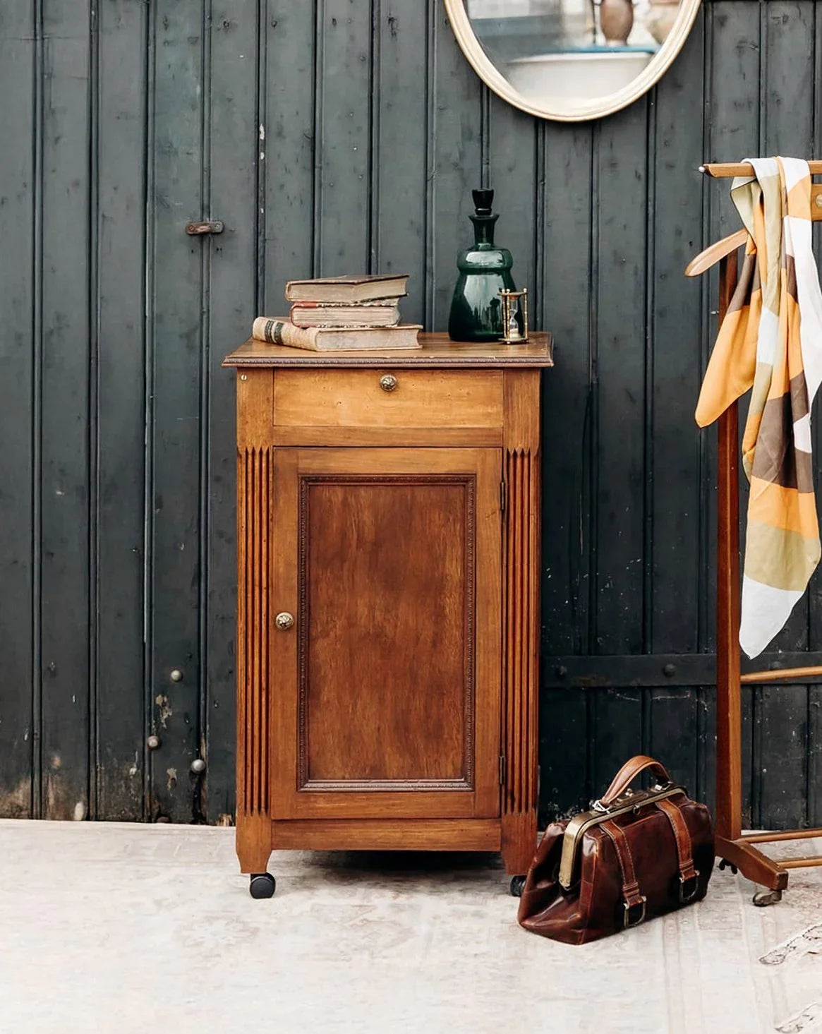 Discover this charming little wooden cabinet, carefully crafted and given a patina by time. Featuring a spacious cupboard and a functional drawer with brass handles, it adds a touch of elegance to your home. Its small plastic casters ensure easy mobility, while its authentic character is revealed through a few marks on the drawer. A unique piece of furniture, perfect for combining style and practicality! Removable casters.