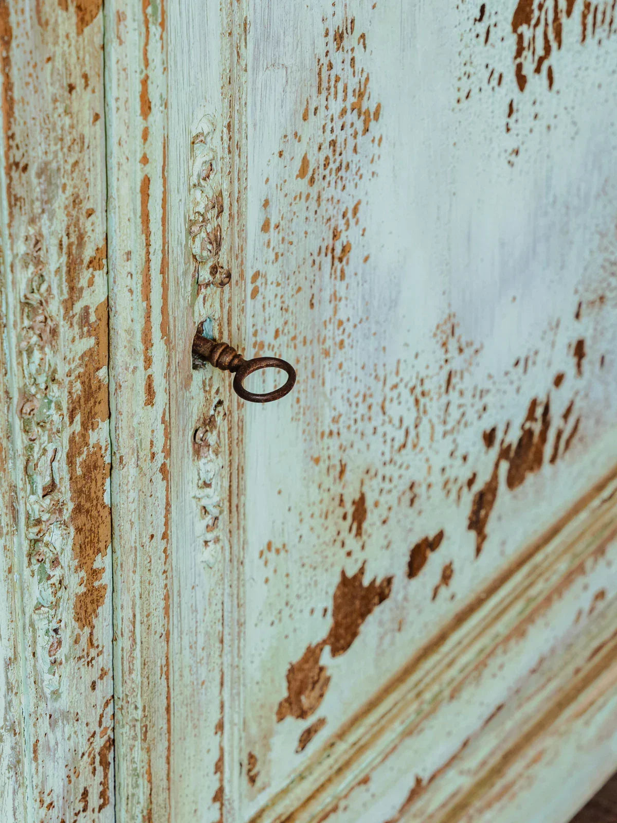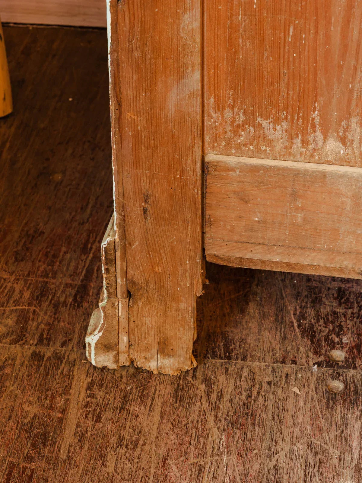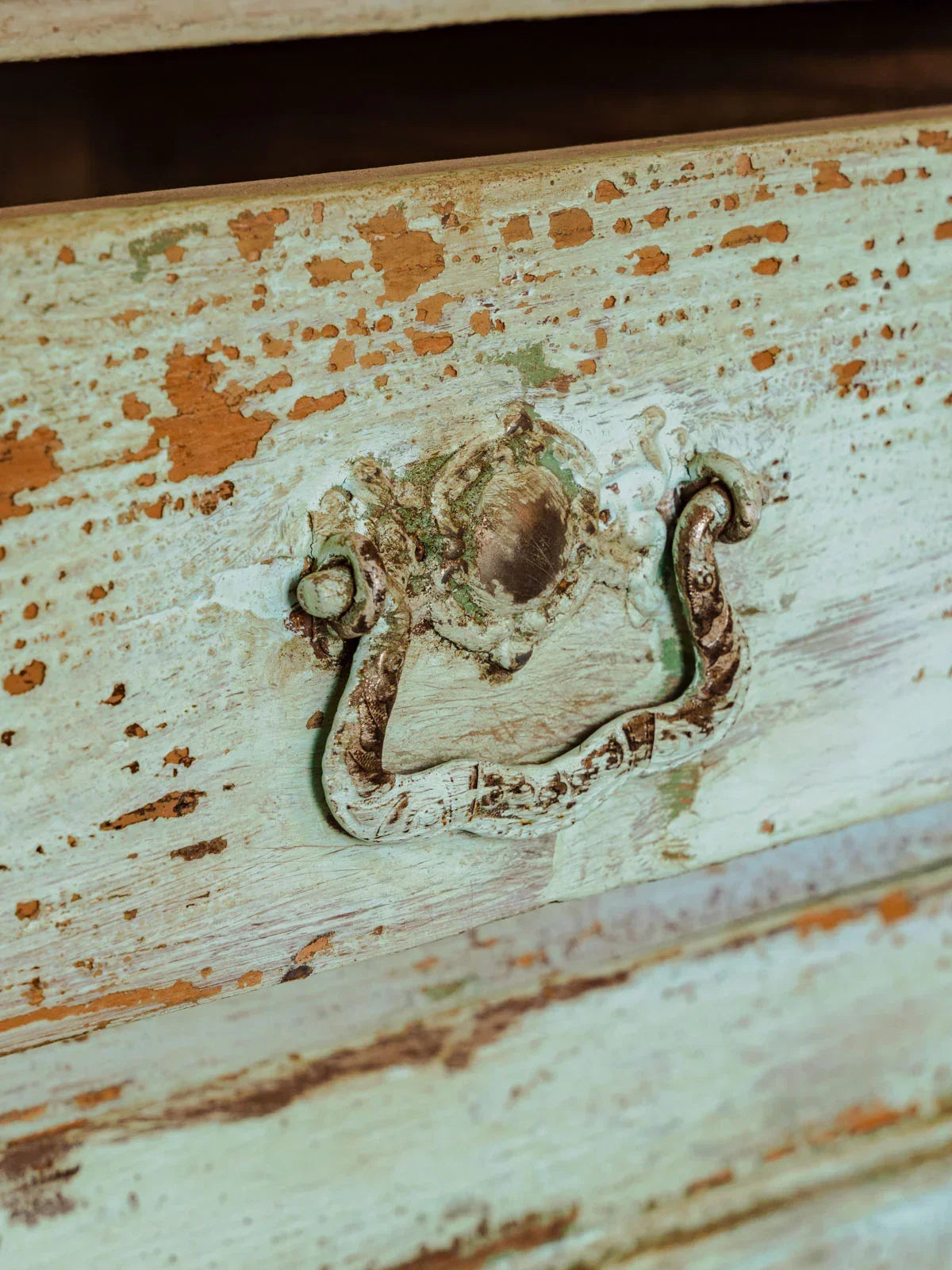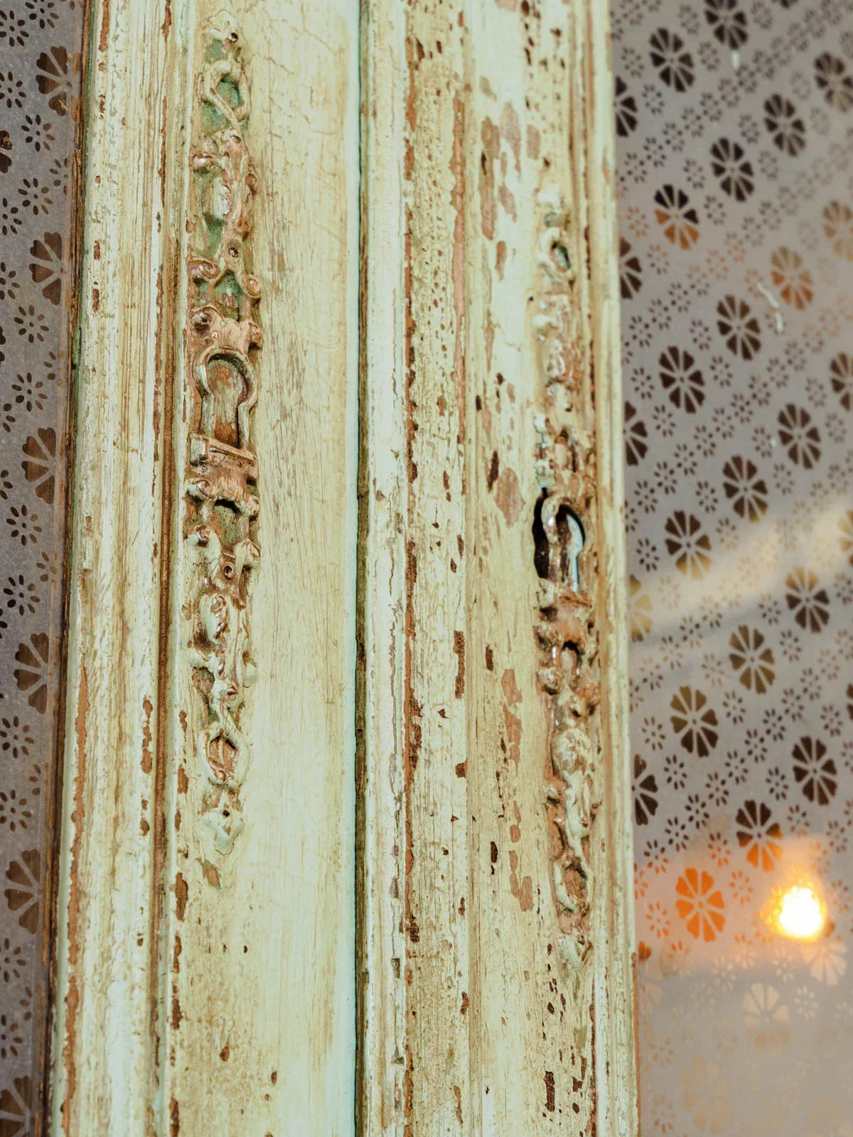 Discover this antique sideboard, crafted from wood with a delicate turquoise patina. The sideboard is divided into two sections: a glazed upper section with doors equipped with functional locks and two interior shelves for displaying dishes or decorative items. Two drawers with patinated metal handles offer discreet storage, while the lower section, closed by two doors and featuring a shelf, can accommodate supplies and other items. This sideboard is equally at home in a dining room or entryway, adding a warm and refined touch.