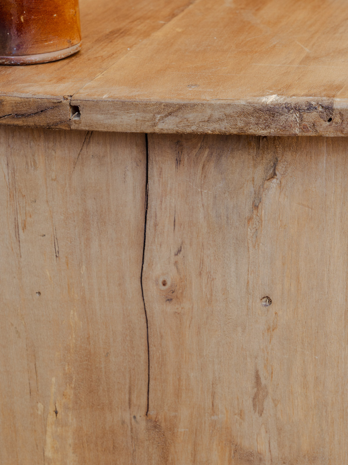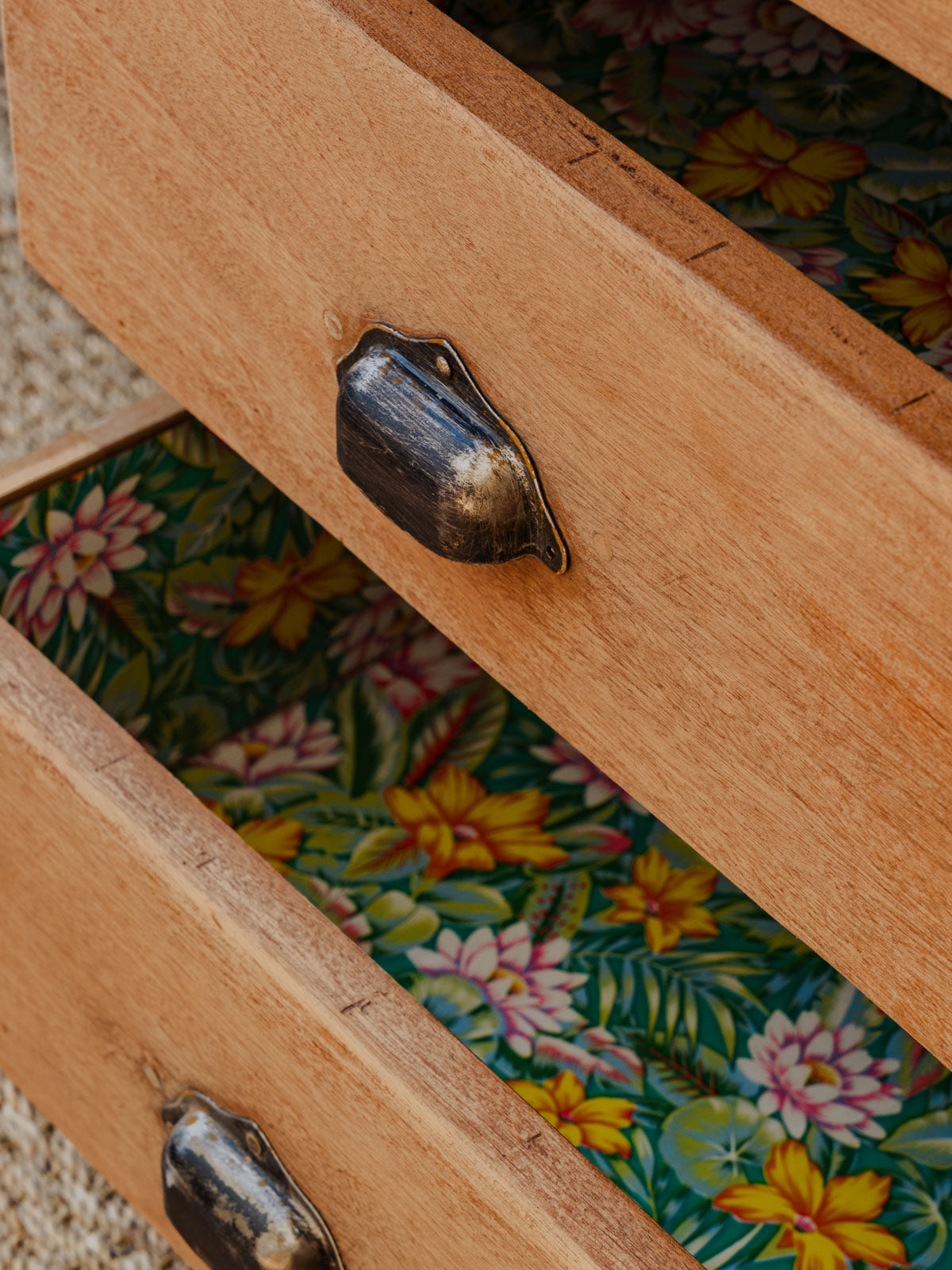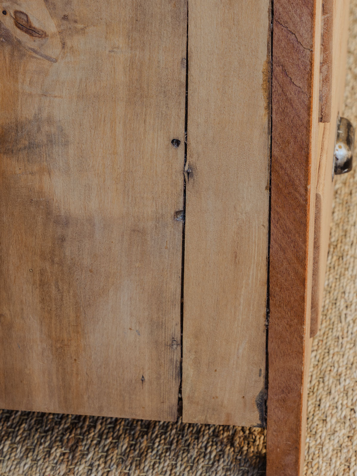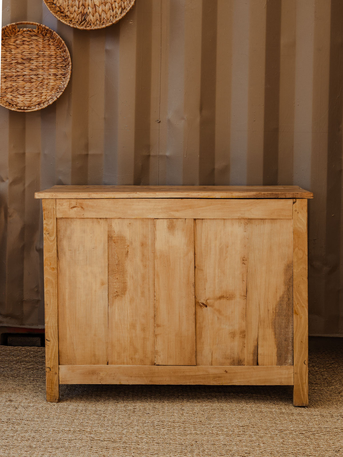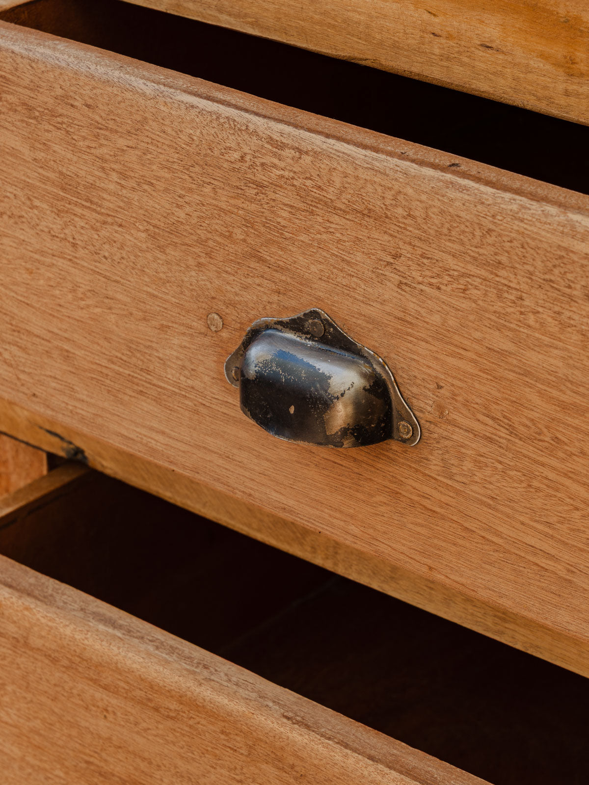 Adoptez ce buffet en bois ancien, doté de six tiroirs qui offrent un rangement organisé et d'un plateau brut parfait pour exposer vaisselle ou objets déco. Les poignées métalliques apportent un contraste discret et une note légèrement industrielle qui affine son caractère. Construit dans une essence de bois chaleureuse, il s'intègre naturellement dans une salle à manger ou une entrée pour structurer l'espace. Idéal pour une atmosphère conviviale et authentique.