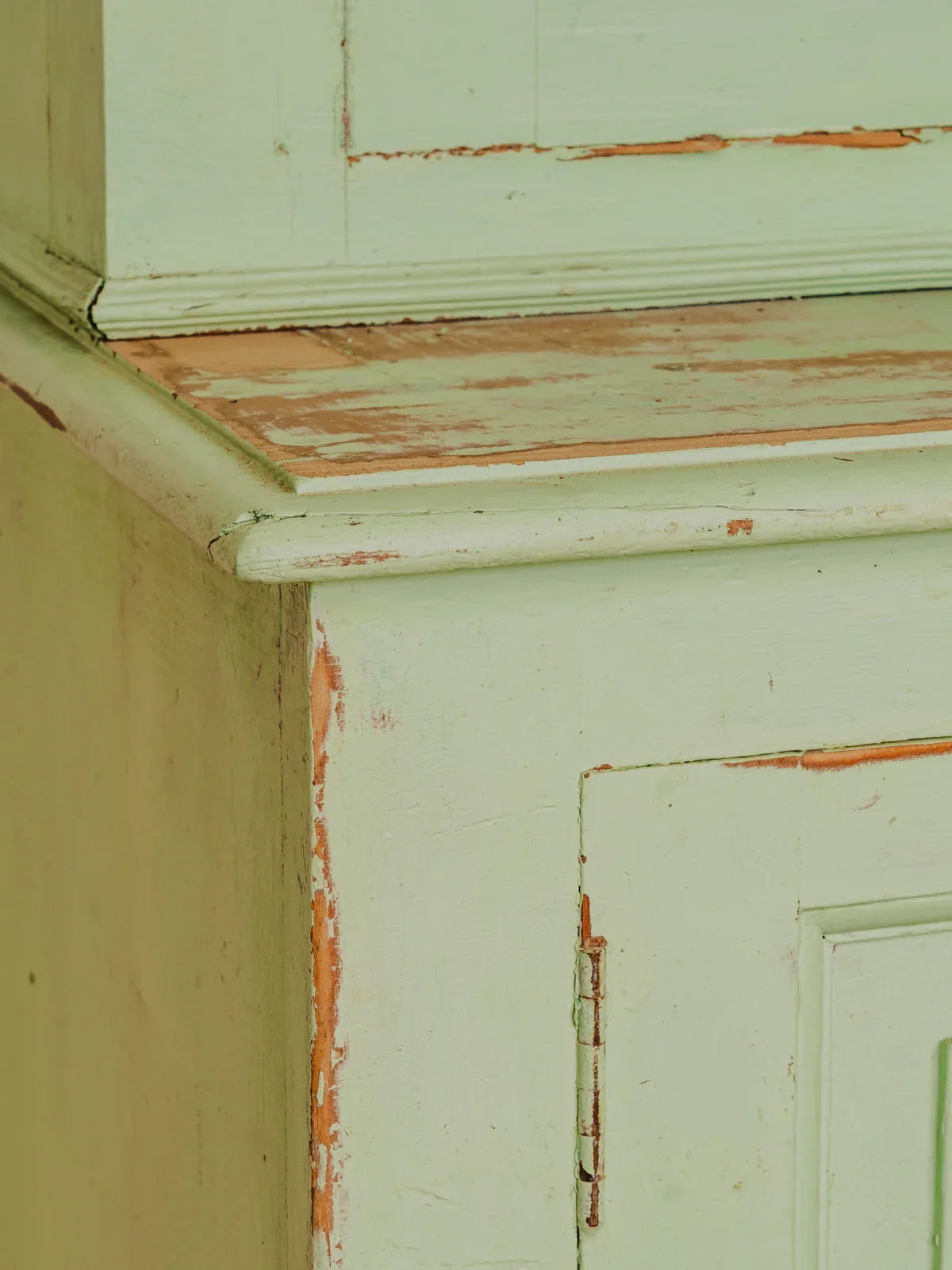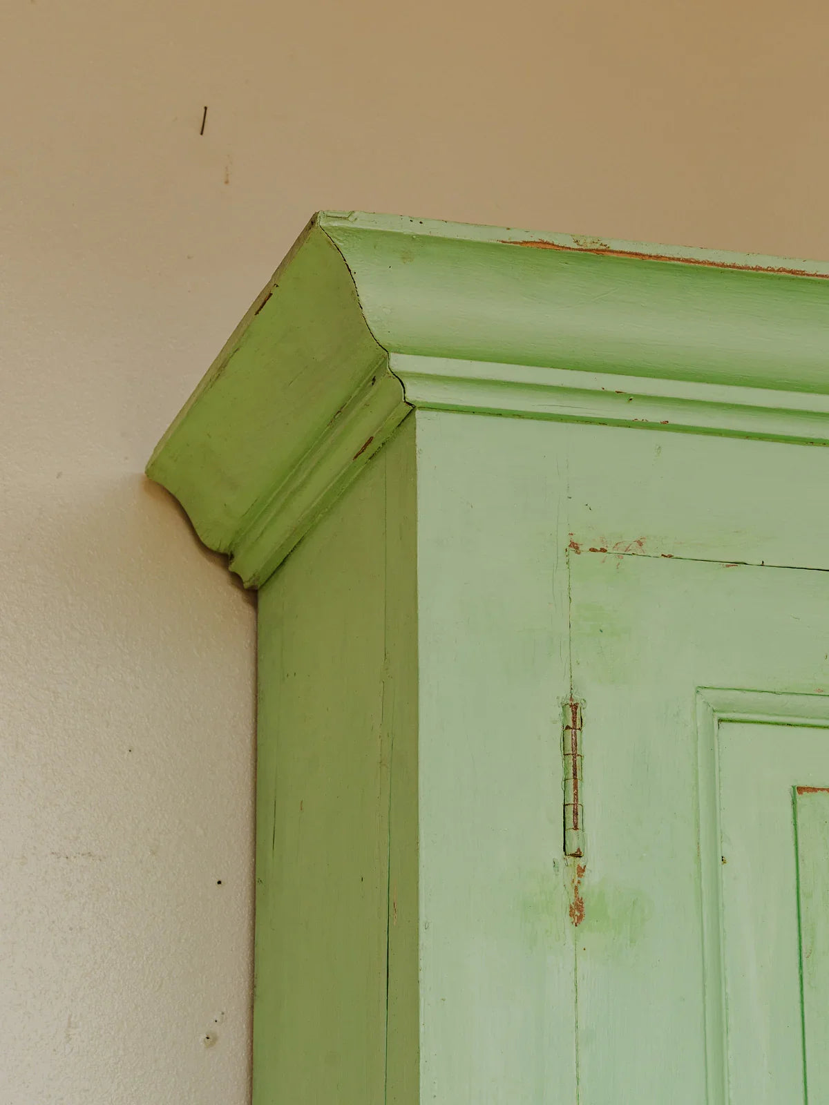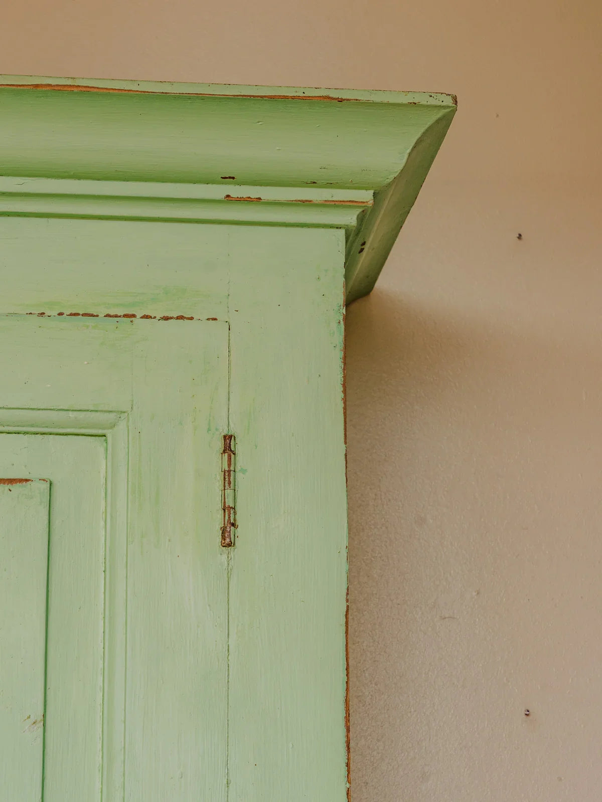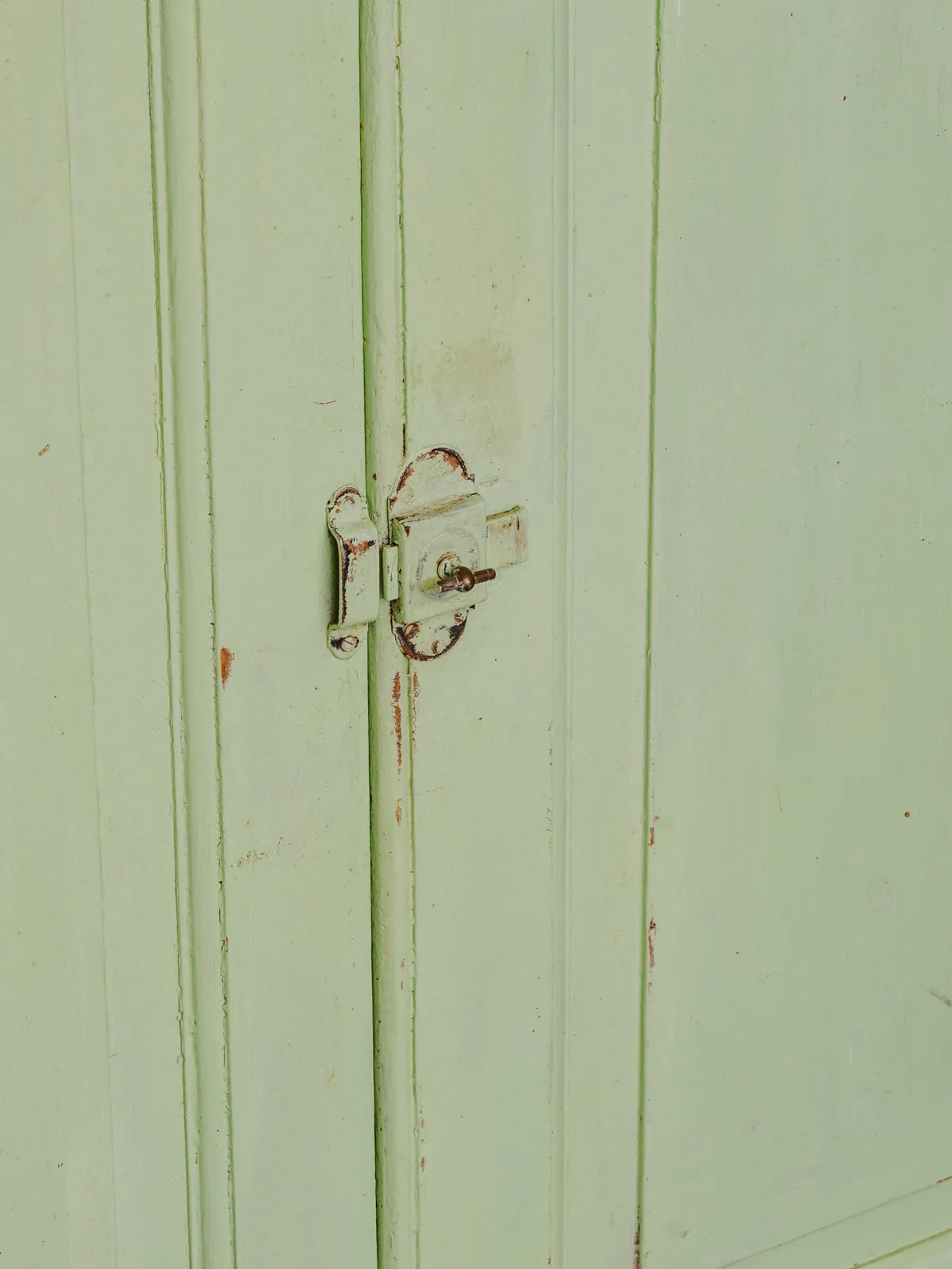 Embrace this charming two-part country-style sideboard, finished in a mint green patina that adds a soft, luminous touch to any room. Constructed of wood, it offers thoughtful organization—shelves in the upper section, three cubbies and a shelf in the lower—for storing dishes, linens, or everyday items. Functional latch locks add a touch of authenticity and security, while its proportions make it both practical and decorative. A few signs of age only add to its charm.