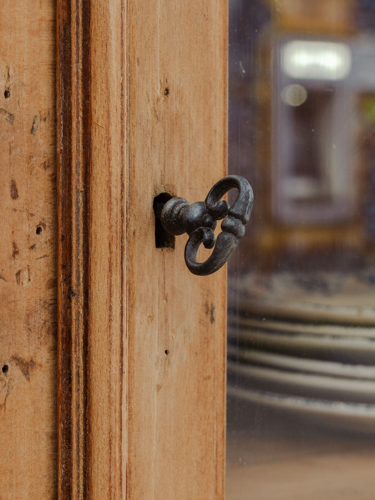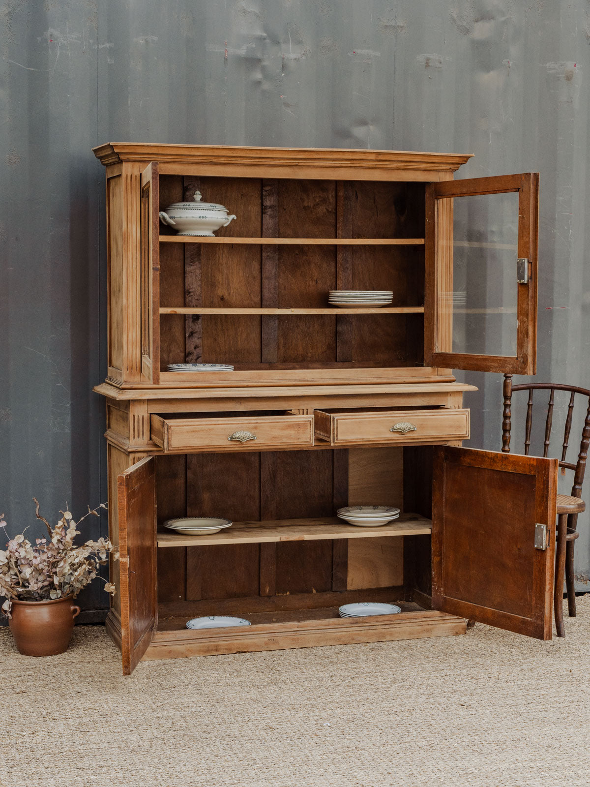 Give your home a warm and structured look with this two-piece country-style wooden sideboard. The upper section, with glass doors and interior shelves, complements the lower section, which features two drawers and a shelf for organizing dishes and everyday items, while metal handles and a lock with a key emphasize its authentic character. Its presence creates a retro-chic atmosphere, ideal for a kitchen or a welcoming dining room. Some signs of age and use are present.