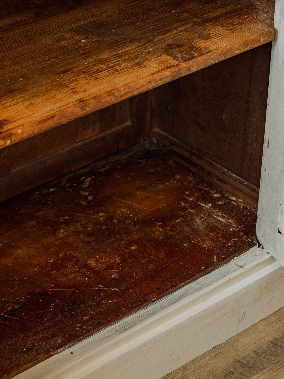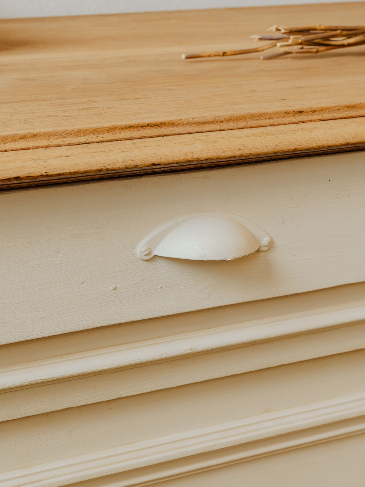 Discover this sideboard with its wooden top, finished with a beige patina that lends it a soft and timeless elegance. Its two drawers with patinated handles and the interior shelf offer generous and perfectly organized storage for dishes, linens, or everyday accessories. The original lock and key, still functional, contribute to its authentic character and the warm ambiance it brings to a kitchen or living room.