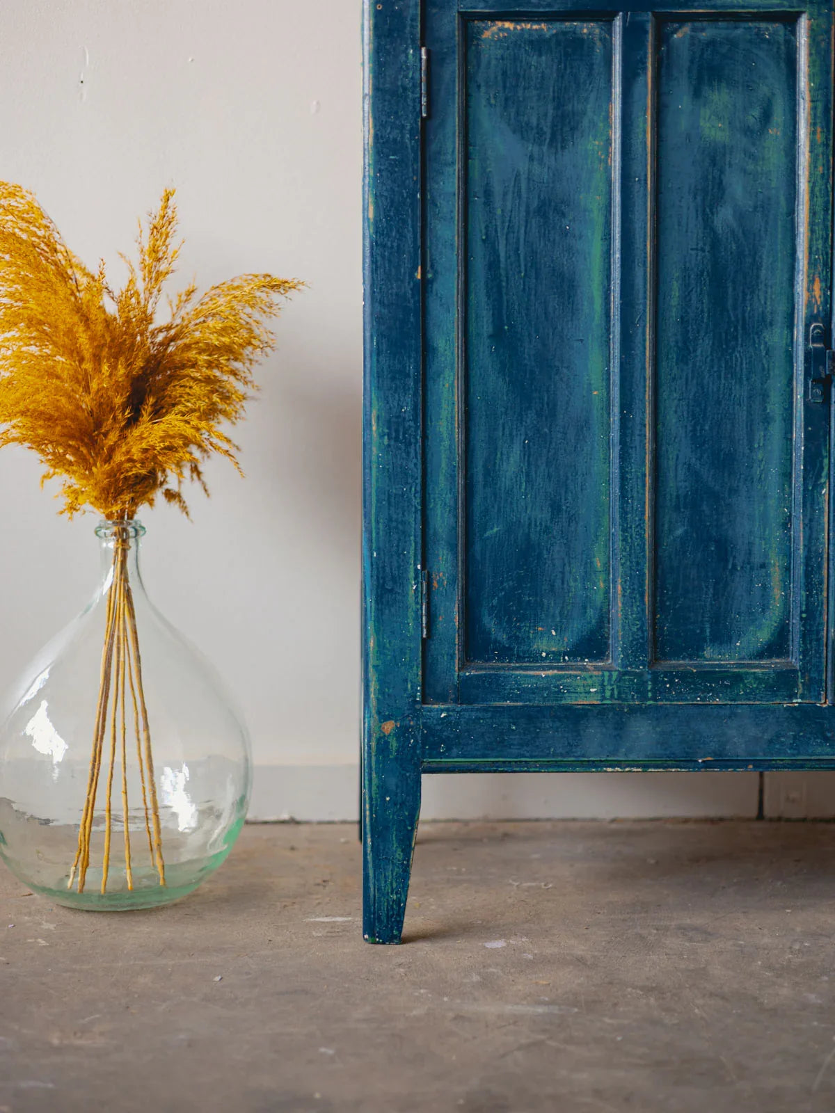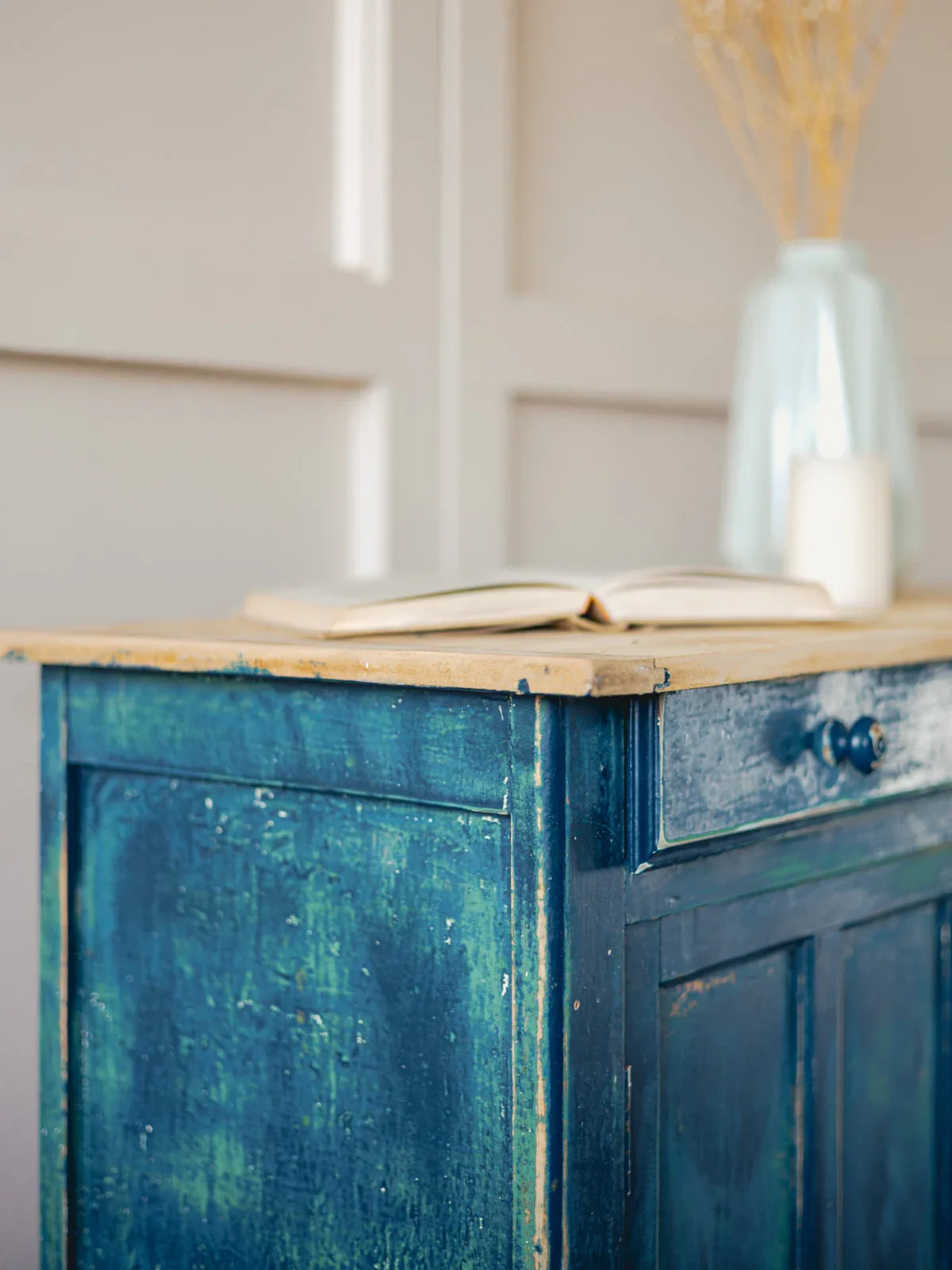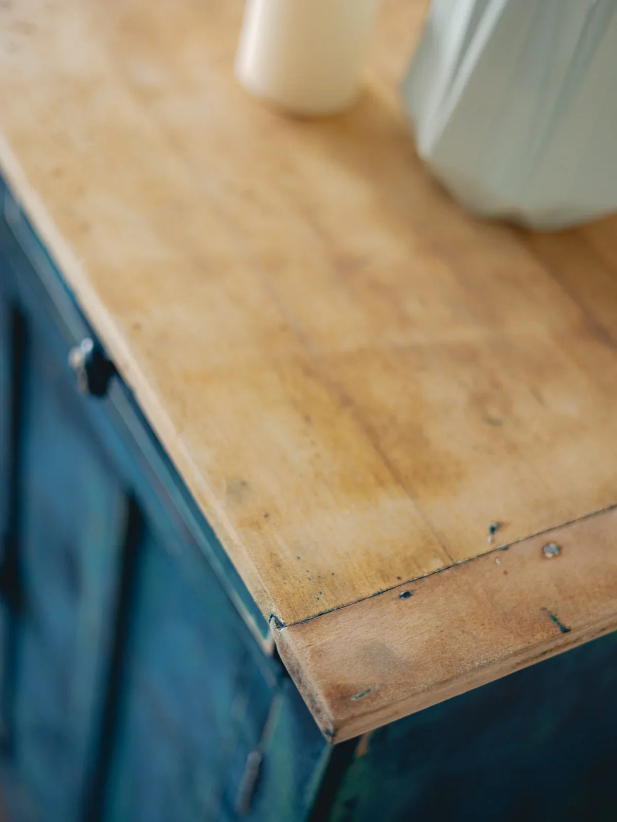 Add a touch of Parisian style with this sideboard featuring a natural wood top and a delicately patinated body: beneath the midnight blue, hints of green reveal subtle depth. Compact and well-proportioned, its interior is designed to store dishes, glasses, and linens, while its top provides a beautiful display for lamps or decorative objects. Its retro-chic look fits perfectly in a dining room or entryway, creating a warm and elegant atmosphere. Signs of age are present.
