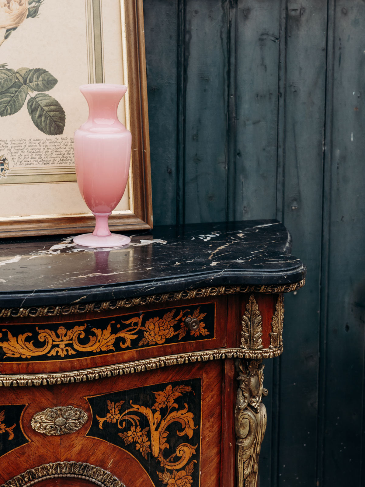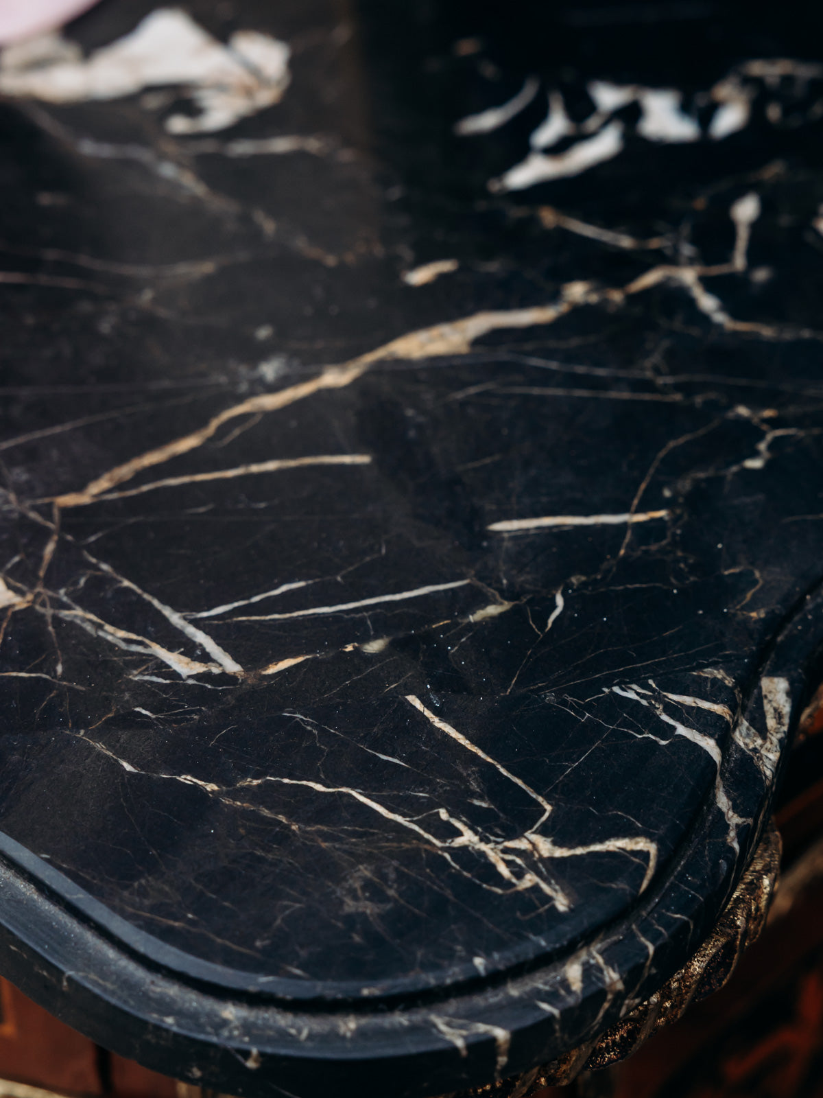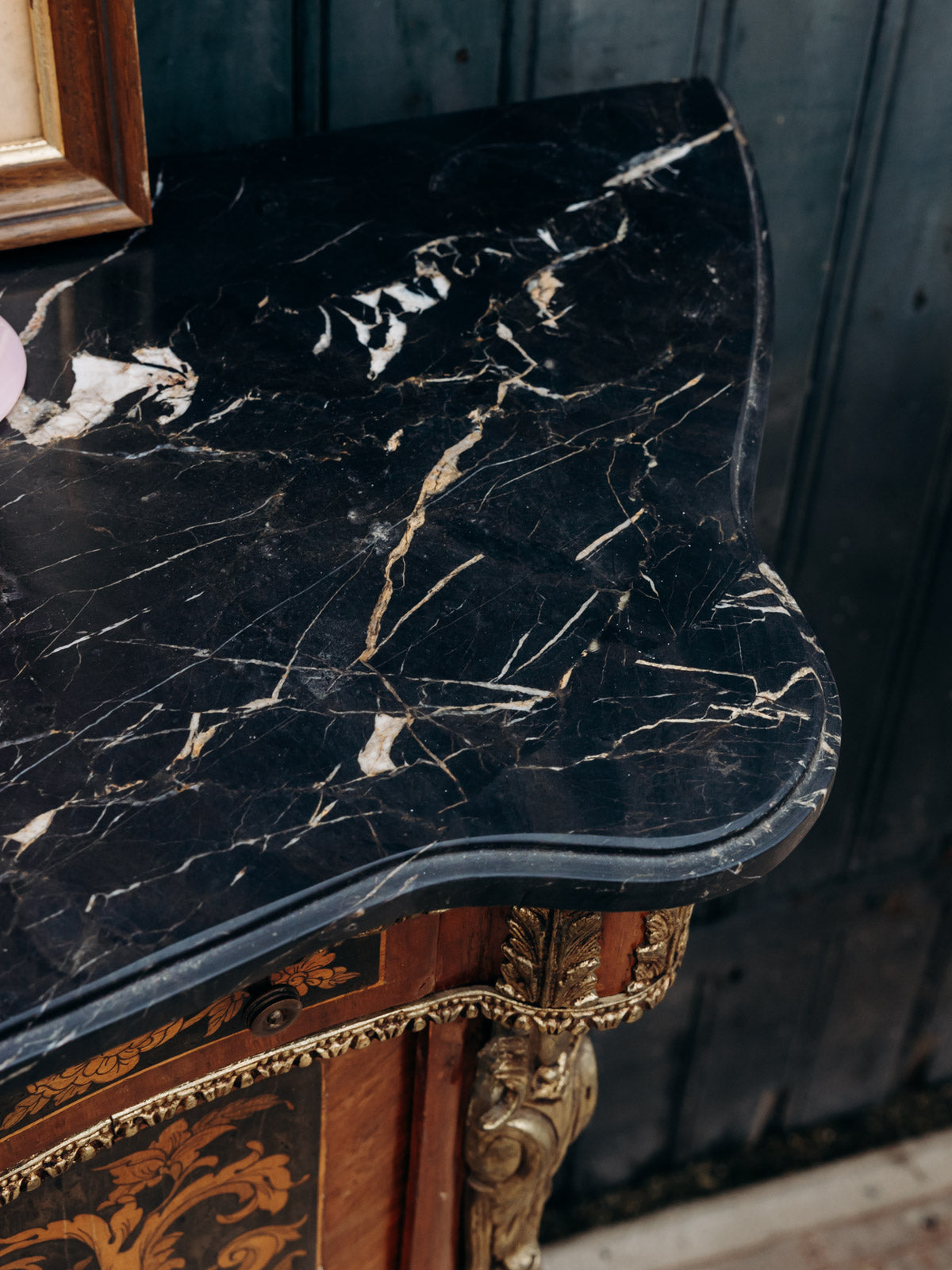 Elevate your interior with this compact sideboard featuring a black marble top and a finely crafted wooden body, delicately accented with brass details. Made of wood and veneer, it combines softness and character; its drawer and cupboard with shelf offer modular storage for dishes, linens, or everyday items. Perfect for an entryway, dining area, or living room, it exudes a warm elegance and a subtle mineral touch. Minor imperfections and slight wear.