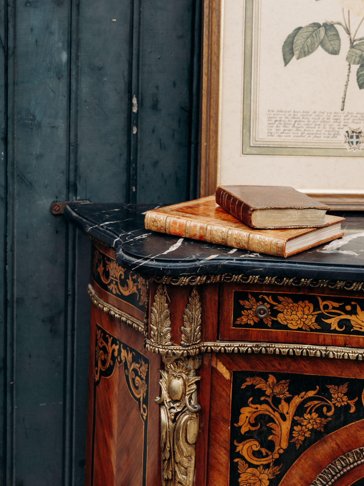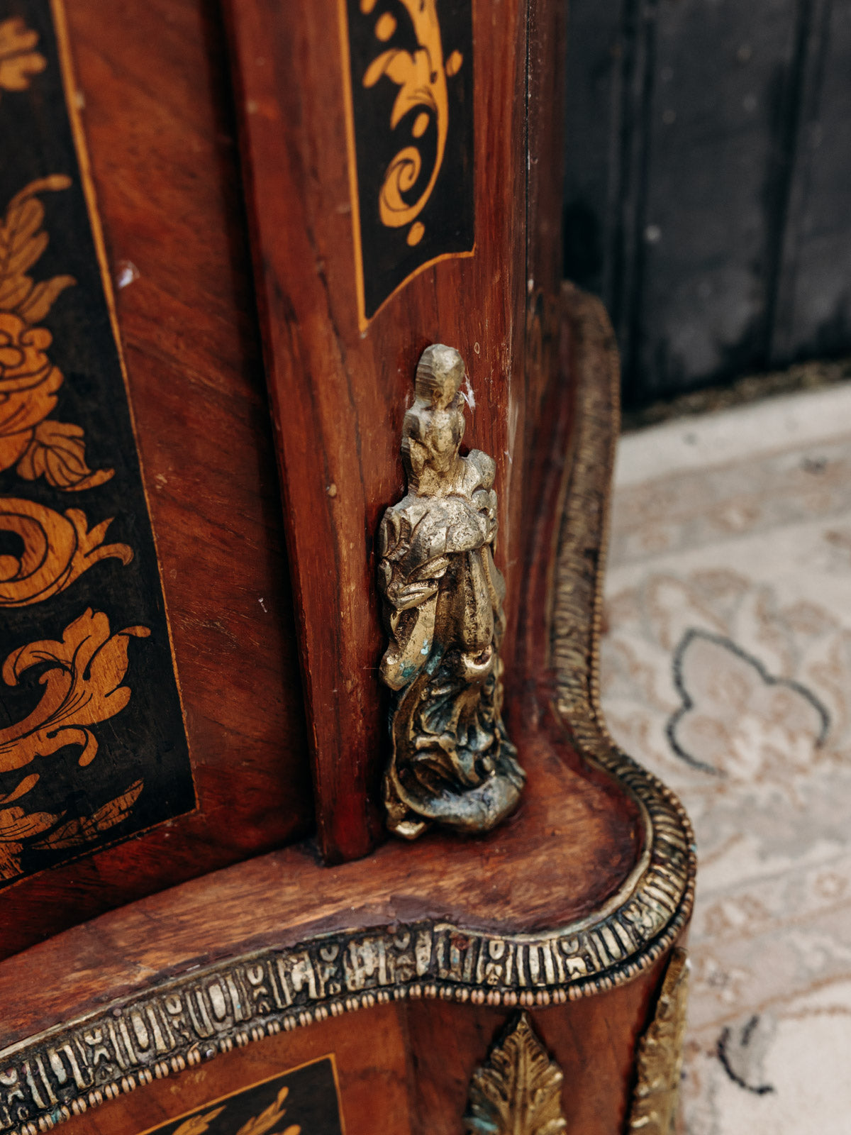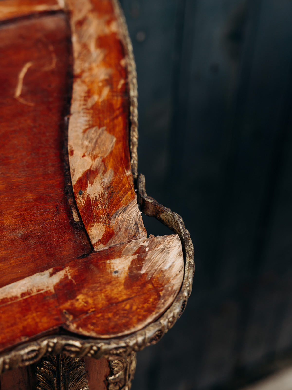 Elevate your interior with this compact sideboard featuring a black marble top and a finely crafted wooden body, delicately accented with brass details. Made of wood and veneer, it combines softness and character; its drawer and cupboard with shelf offer modular storage for dishes, linens, or everyday items. Perfect for an entryway, dining area, or living room, it exudes a warm elegance and a subtle mineral touch. Minor imperfections and slight wear.