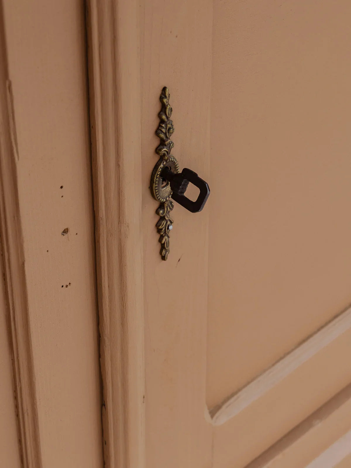 Enhance your interior with this charming country-style sideboard. Its wooden top and frame, painted in a caramel brown tone, bring a warm and inviting feel to any room. Designed for practical storage, it features two generous shelves and a lock with its original, working key, perfect for storing dishes or linens in a kitchen or entryway. Some signs of age are present.
