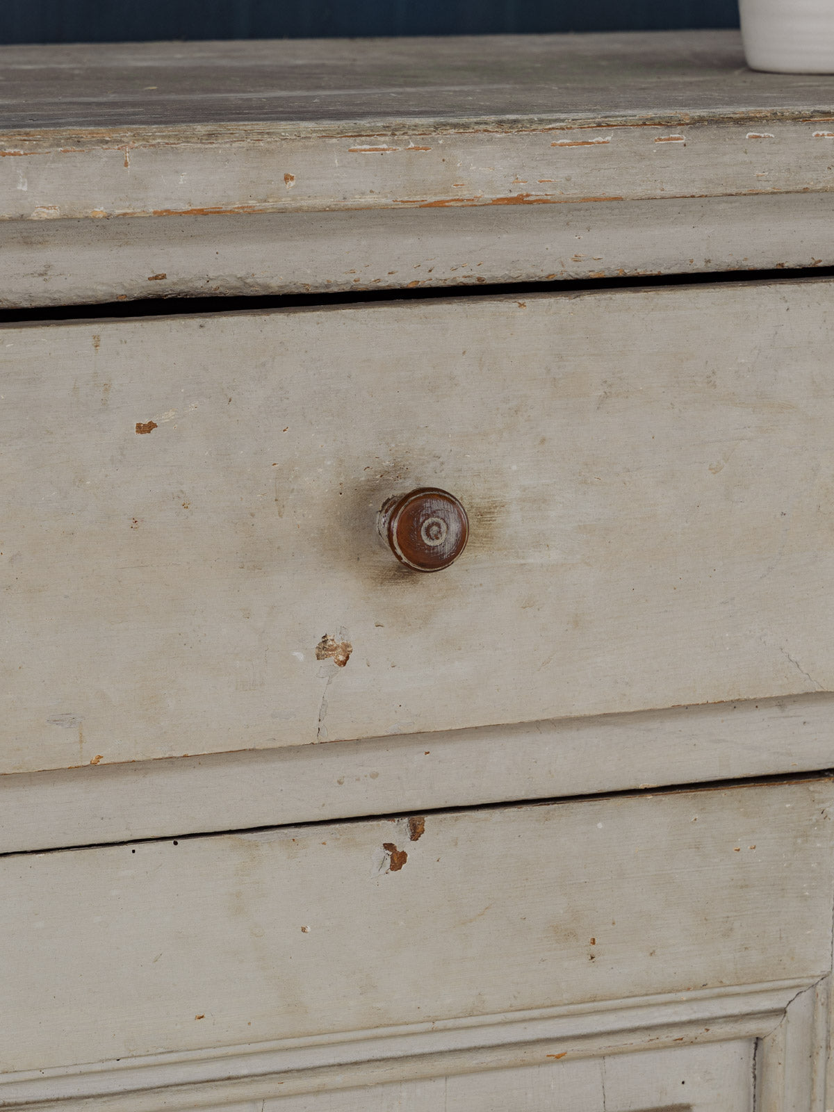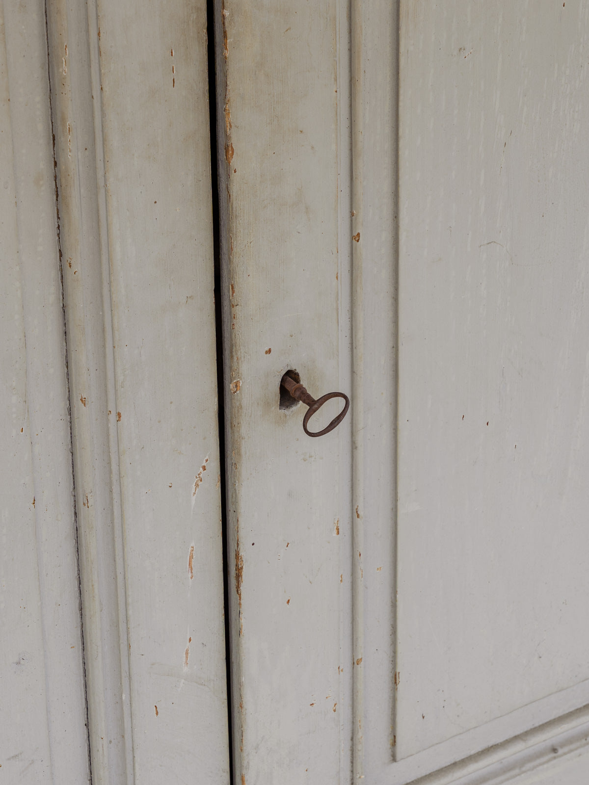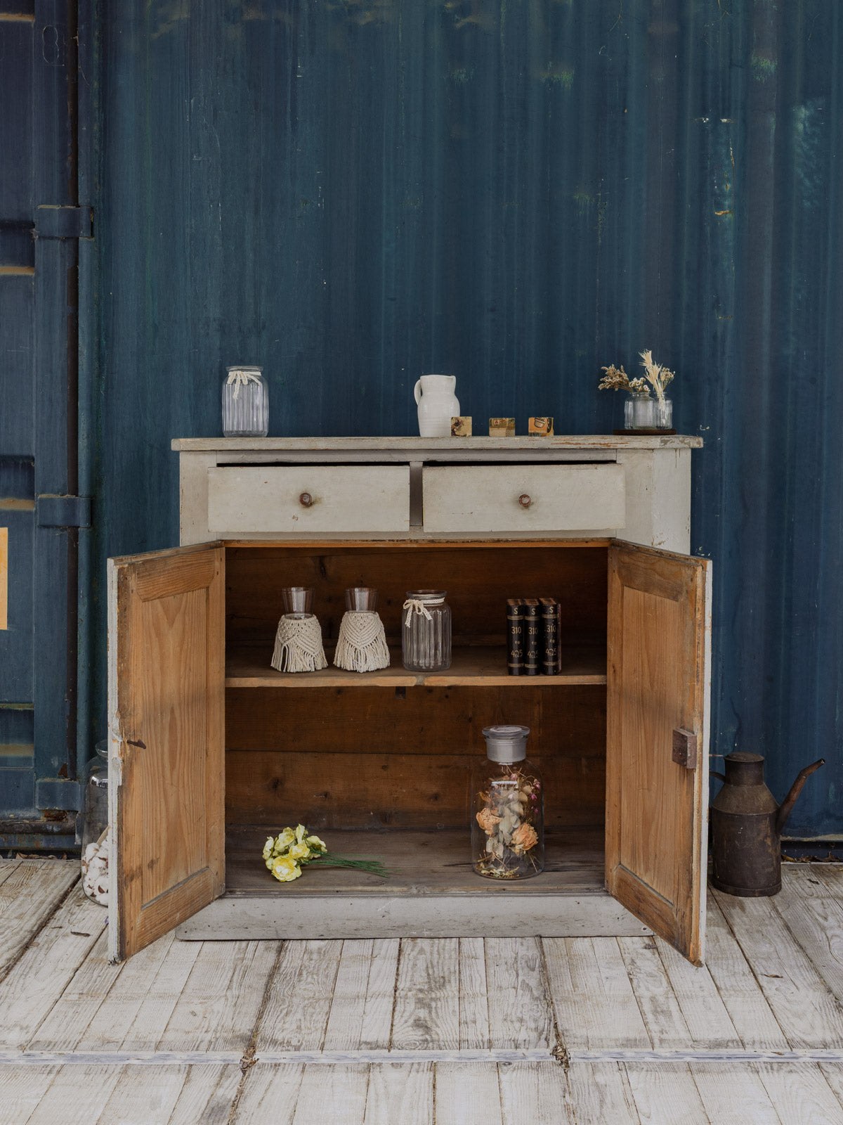 This gray-painted wooden sideboard, with its simple and balanced lines, brings a discreet and elegant presence to the dining room or entryway. Two drawers and lockable doors (with their original key) offer organized storage, while an interior shelf provides ample space for dishes or linens. Its distressed finish and proportions create a warm and contemporary atmosphere. Some signs of age are present.
