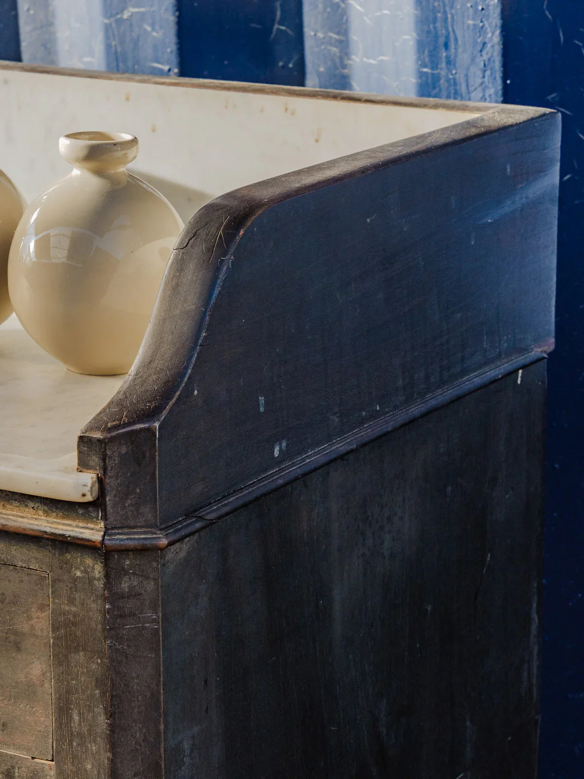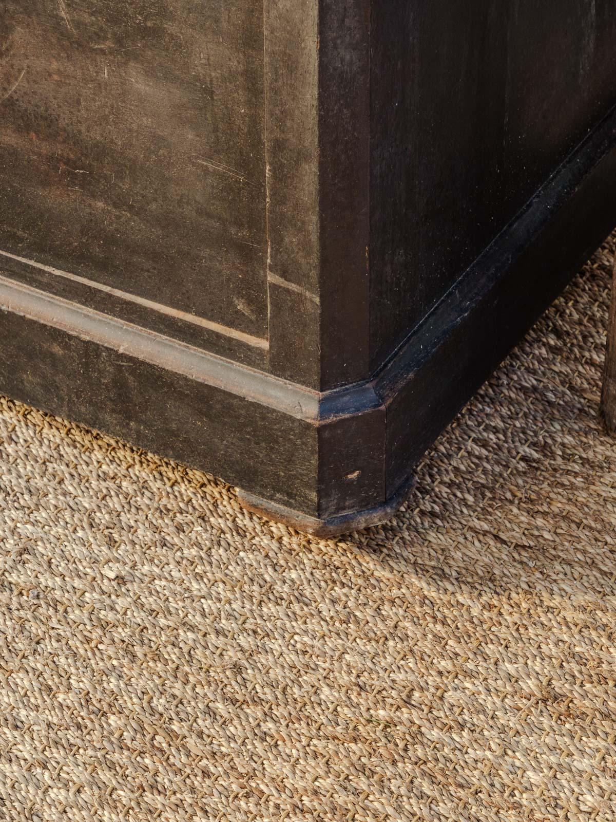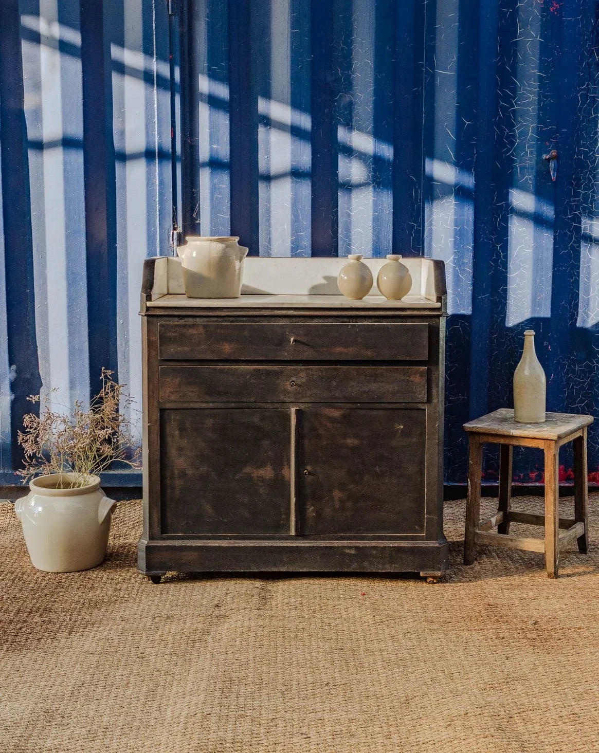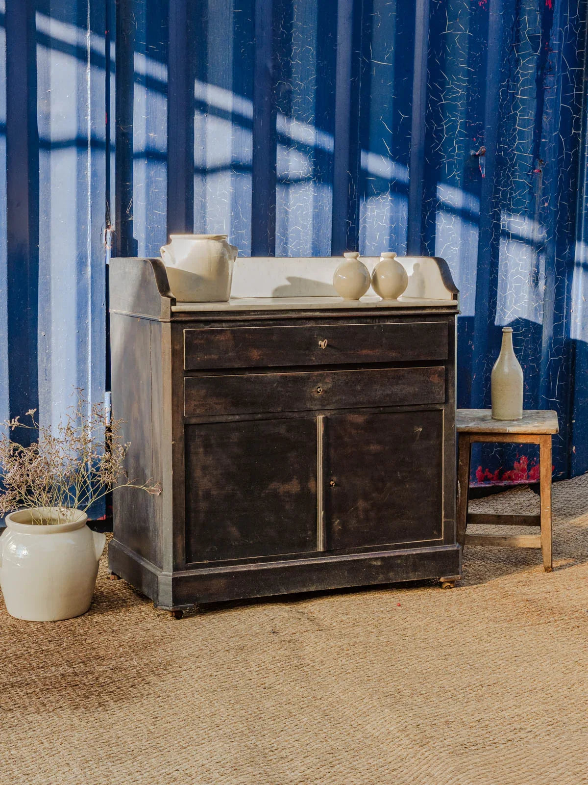 Elevate your interior with this black sanded wood sideboard topped with a marble slab, an elegant blend of simplicity and fine materials. Designed for storage, it features two drawers with locks that are currently non-functional, two lockable doors, and an interior shelf—ideal for an entryway or dining room. Its understated lines and the contrast between the marble and wood create a refined and inviting atmosphere. Some signs of age are present.