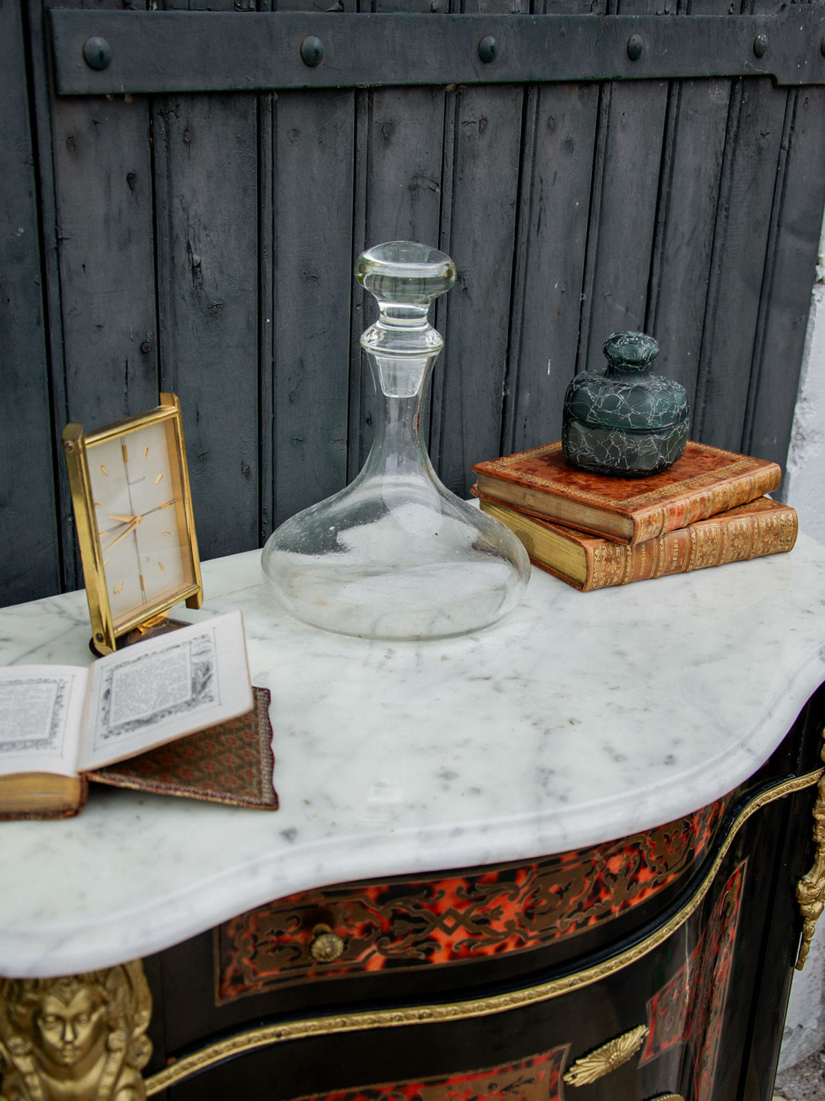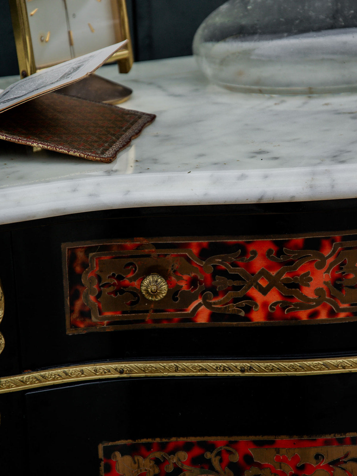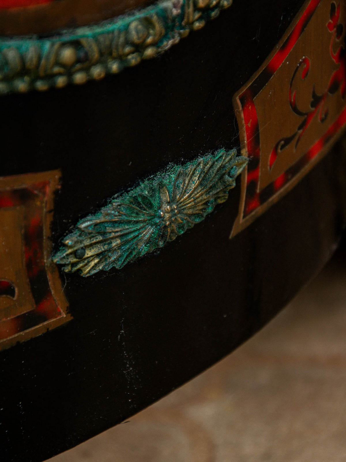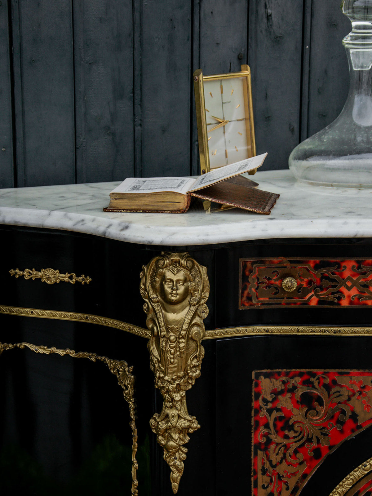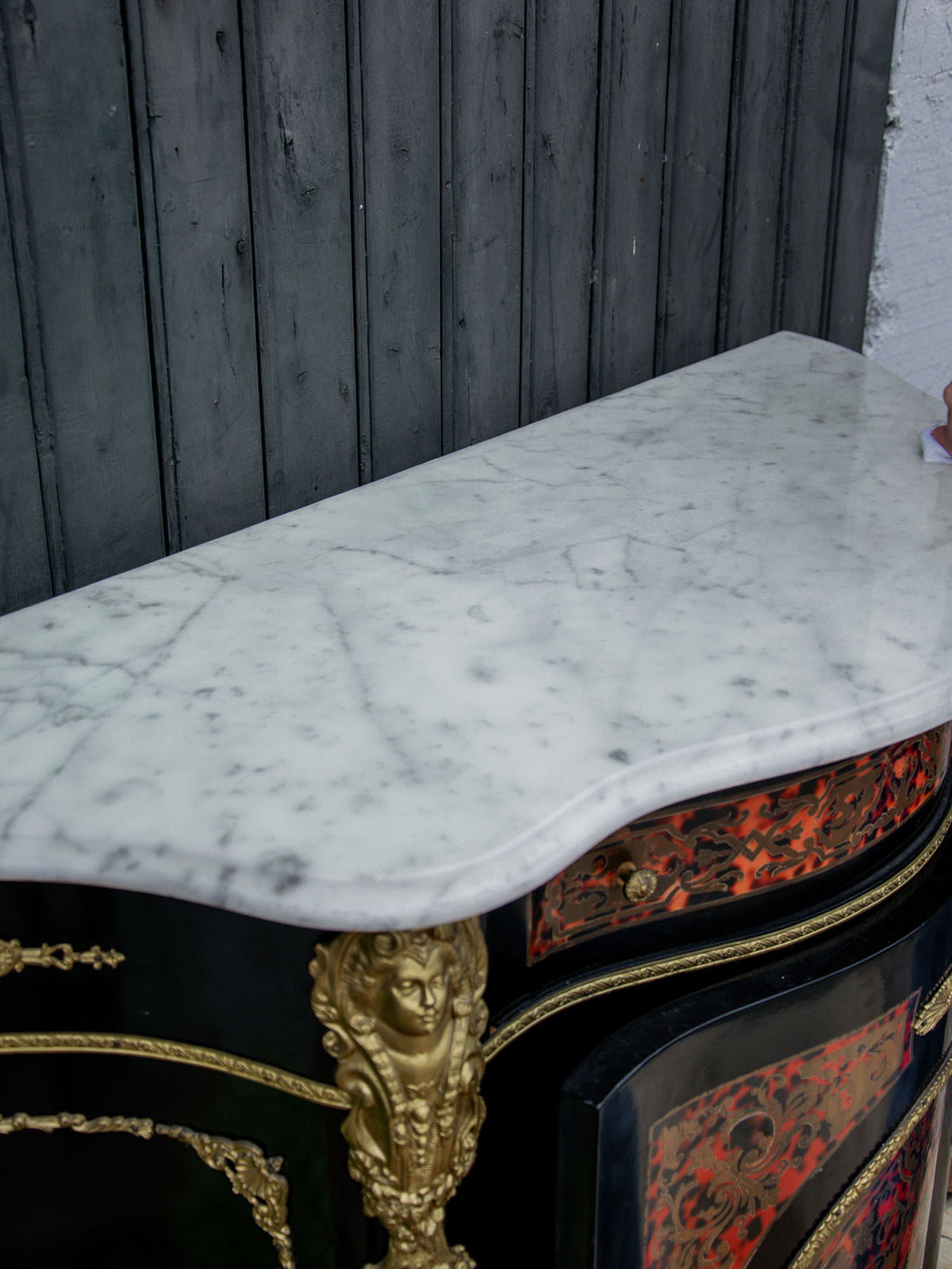 Add a touch of elegance to your home with this stunning black painted wooden sideboard. Its marble top, enhanced by delicate gilding, adds a touch of sophistication. Featuring a cupboard with a shelf and a practical drawer, this piece of furniture is ideal for combining style and functionality. The colorful painted decorative details and its Napoleon III-inspired design make it a must-have for art and history lovers. Keys provided for easy access to your storage spaces.