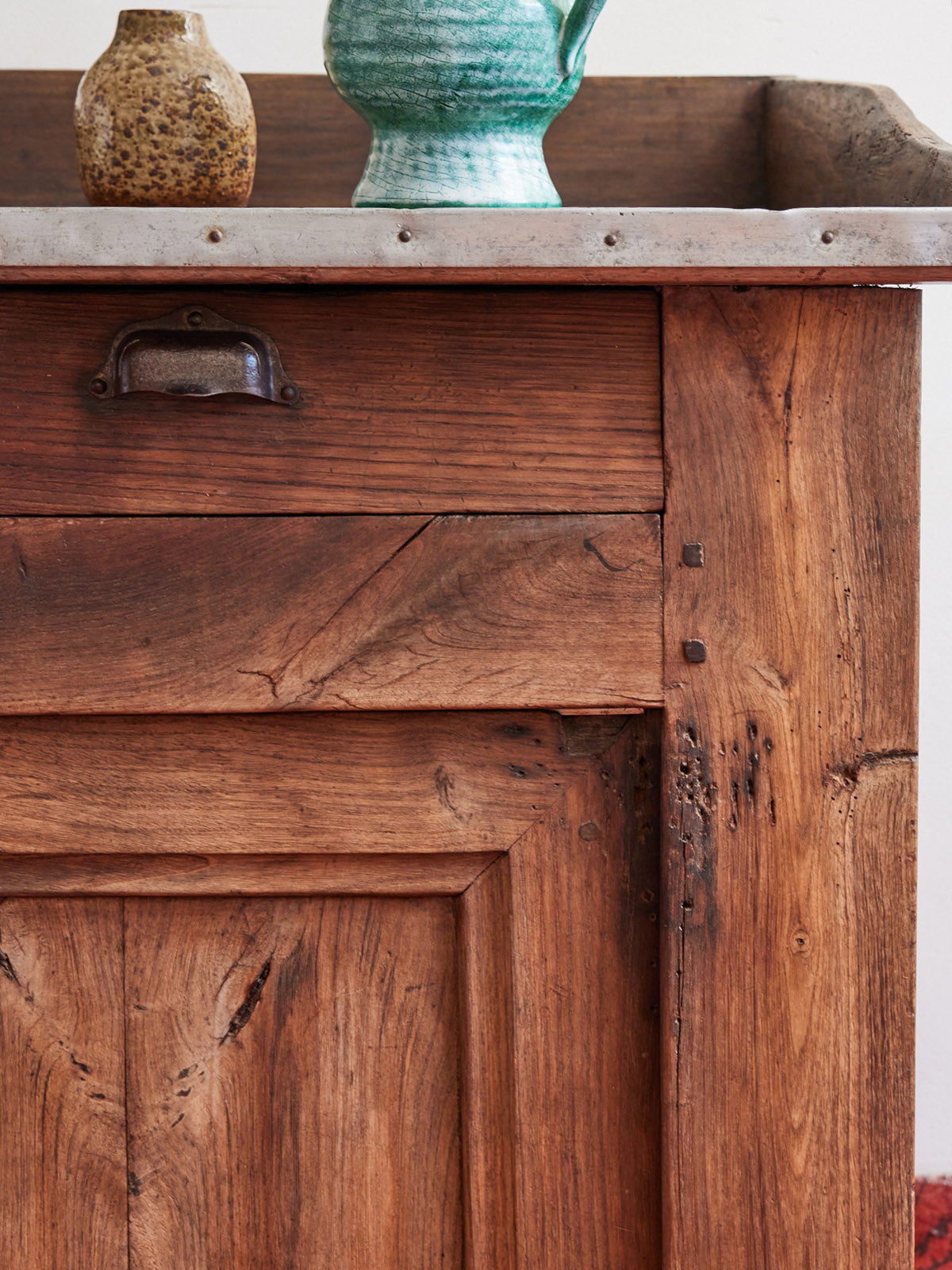 Découvrez ce buffet ancien issu d'un comptoir de métier en bois, aux lignes simples et au caractère authentique. Ses deux tiroirs et sa grande niche équipée d'une étagère libèrent un rangement modulable, tandis que le large plateau s'ancre comme un plan de travail ou un présentoir convivial. Les poignées coques renforcent son style rustique et utilitaire, idéal pour une cuisine de campagne ou un espace repas chaleureux. Sa présence crée une atmosphère accueillante et pleine d'histoire.