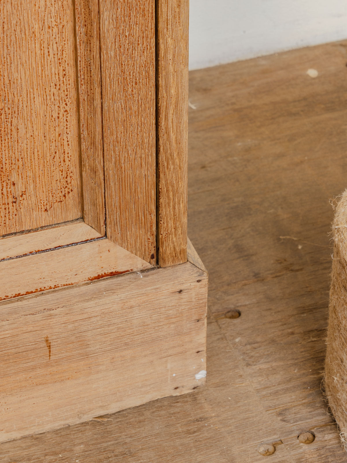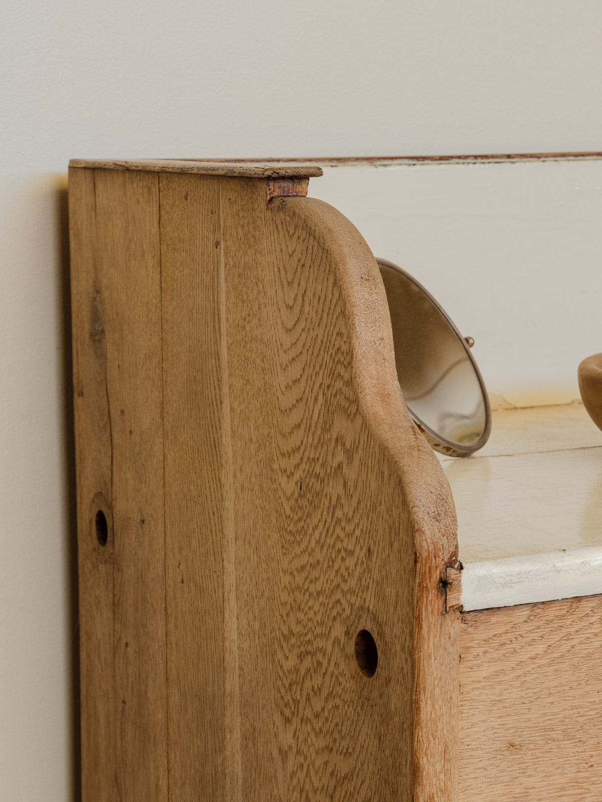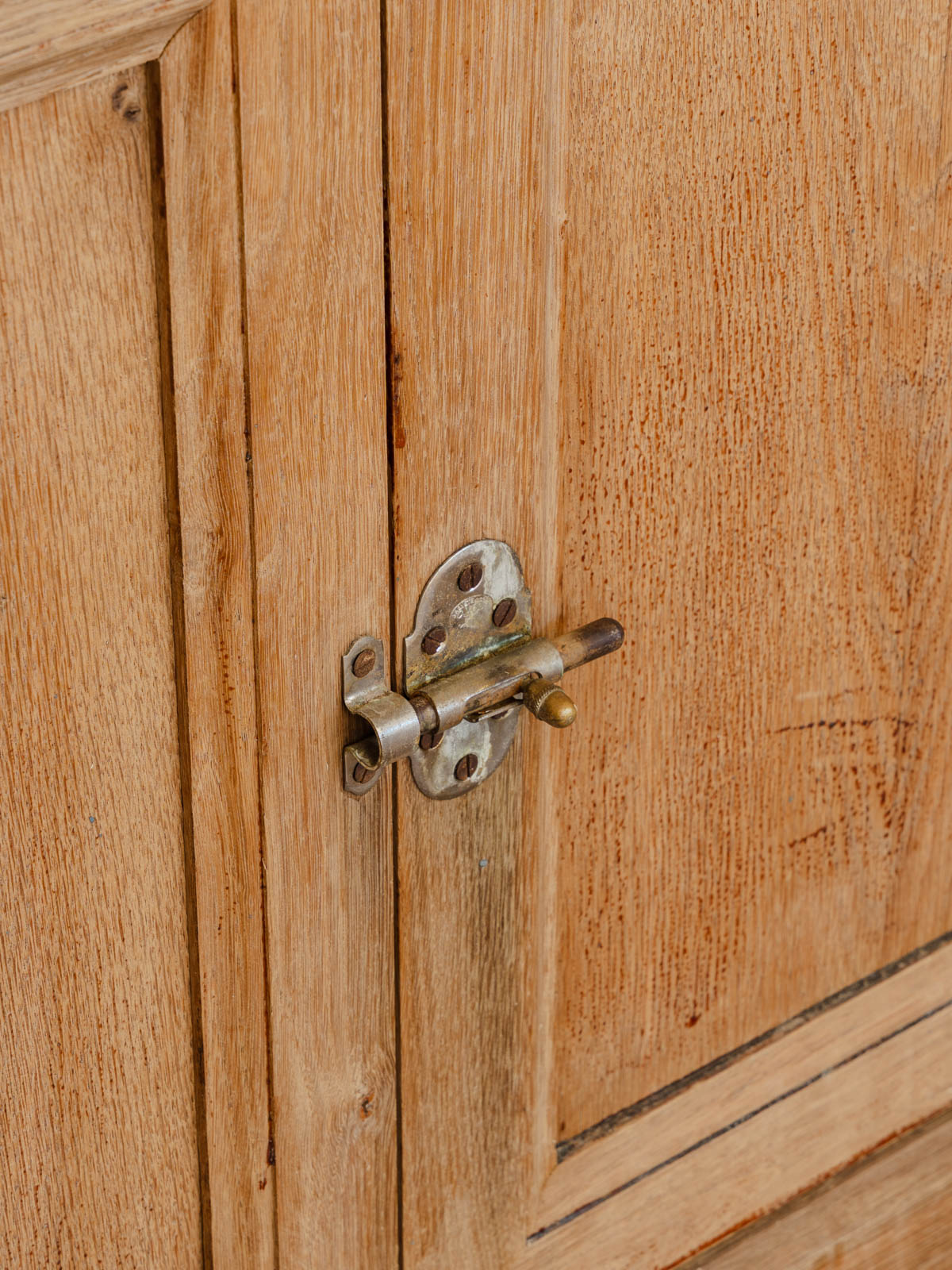 Enhance your bathroom or entryway with this antique washbasin in raw, solid oak, where the material exudes a natural and warm presence. Its proportions offer a practical surface and discreet storage for towels and everyday items. Holes bear witness to the former presence of towel rails, and the lock, now a simple push-button, adds to its authentic charm. A few signs of wear only enhance its authenticity.