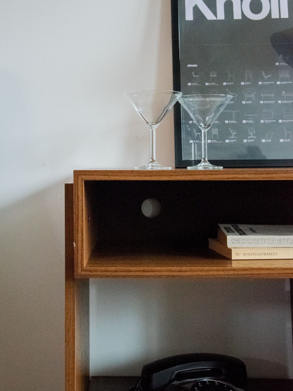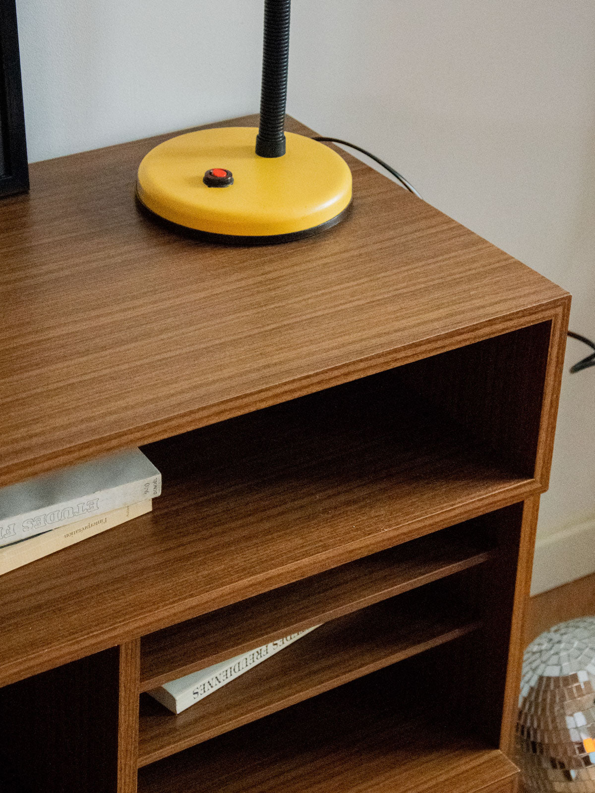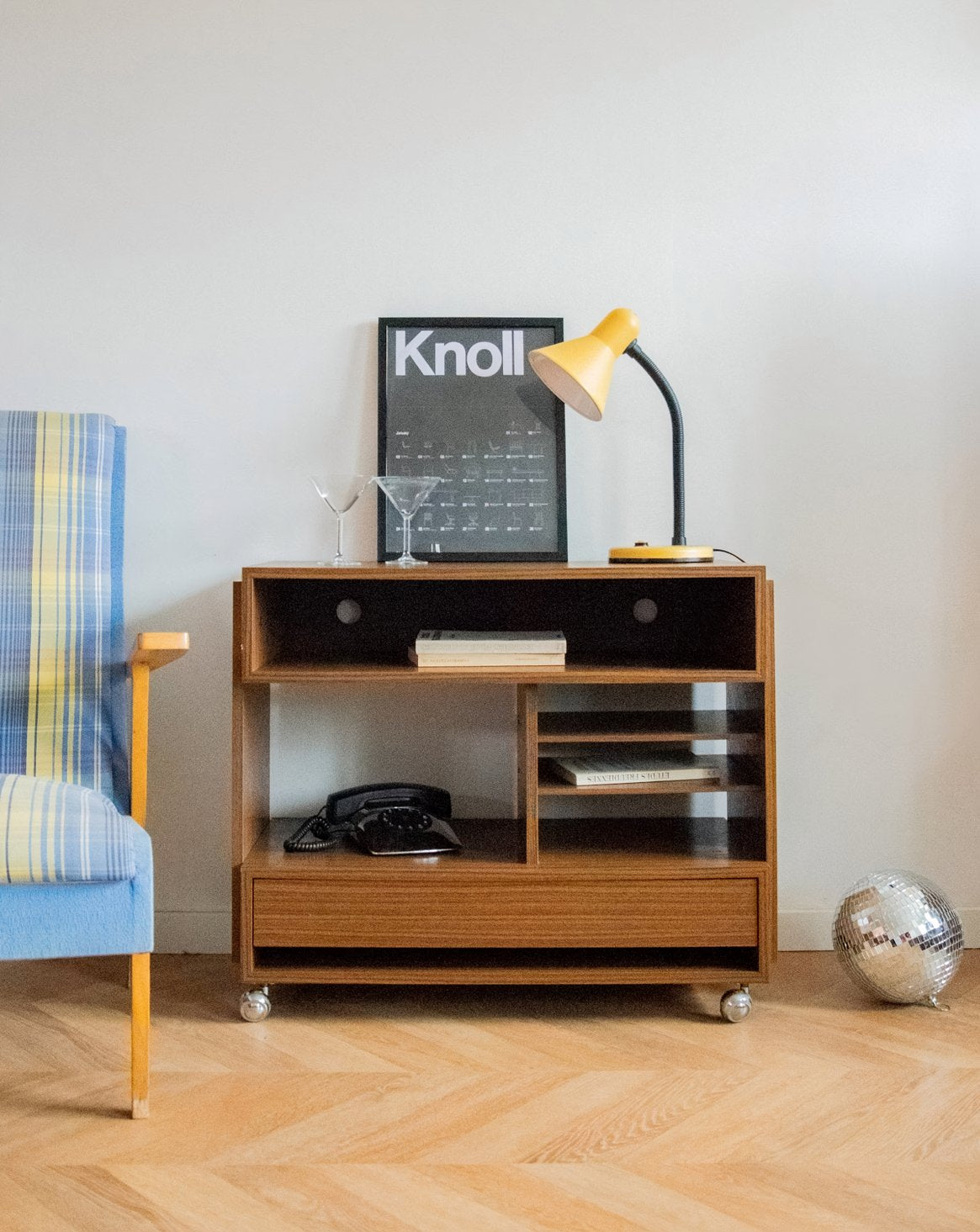 Discover this dark wood storage unit with simple, warm lines, designed to serve as both a sideboard and a display for your vinyl collection. Mounted on casters, it moves easily to optimize space in your living room or music corner, while a lower drawer provides storage for accessories and album covers. Its shelves of varying heights allow you to alternate records, books, and decorative objects, creating a refined and harmonious atmosphere in your home.