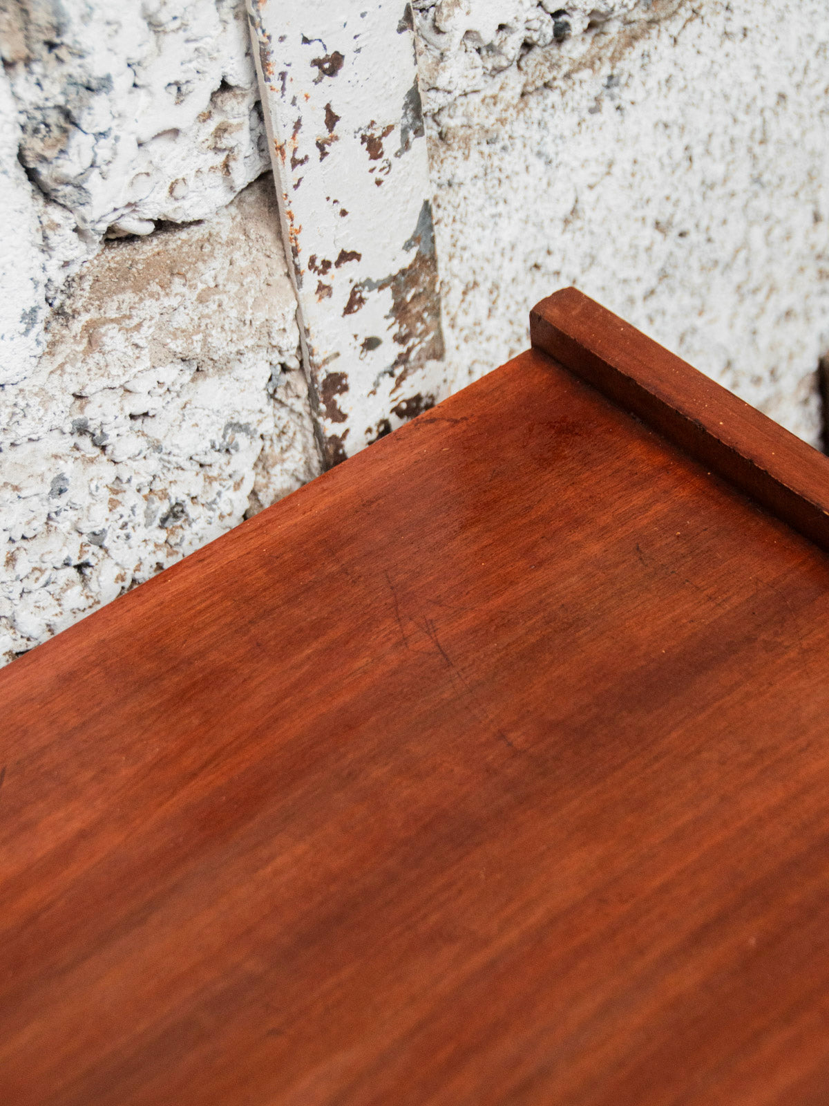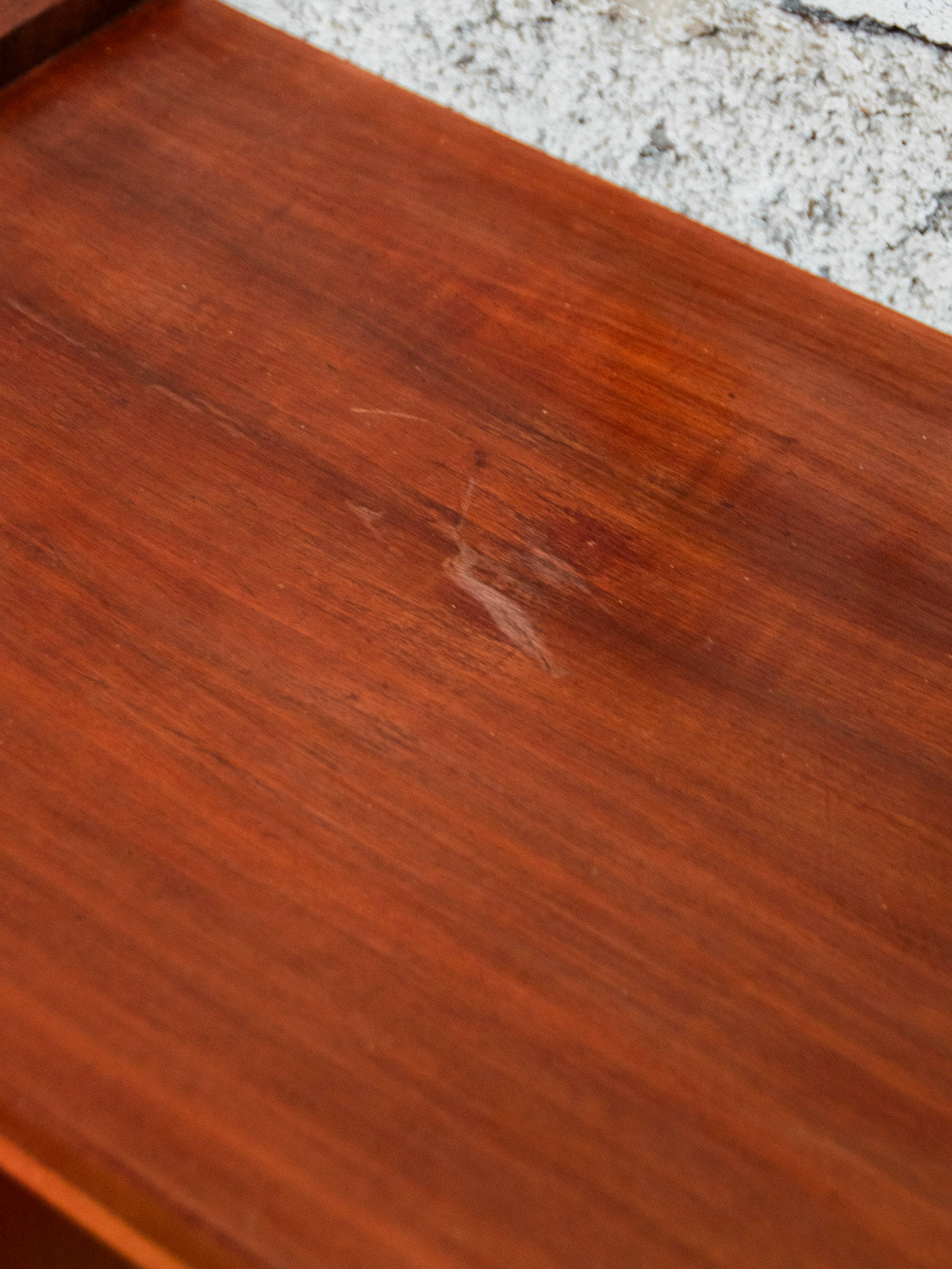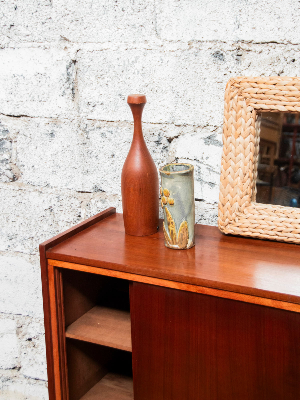 Give your home a stylish touch with this wooden sideboard in warm tones ranging from deep brown to orange-red. Featuring two sliding doors and round black handles that define its graphic appeal, and resting on small feet, it offers generous storage and balanced proportions, perfect for a dining room or entryway where functionality meets elegant retro style. There is a discreet mark on the top.