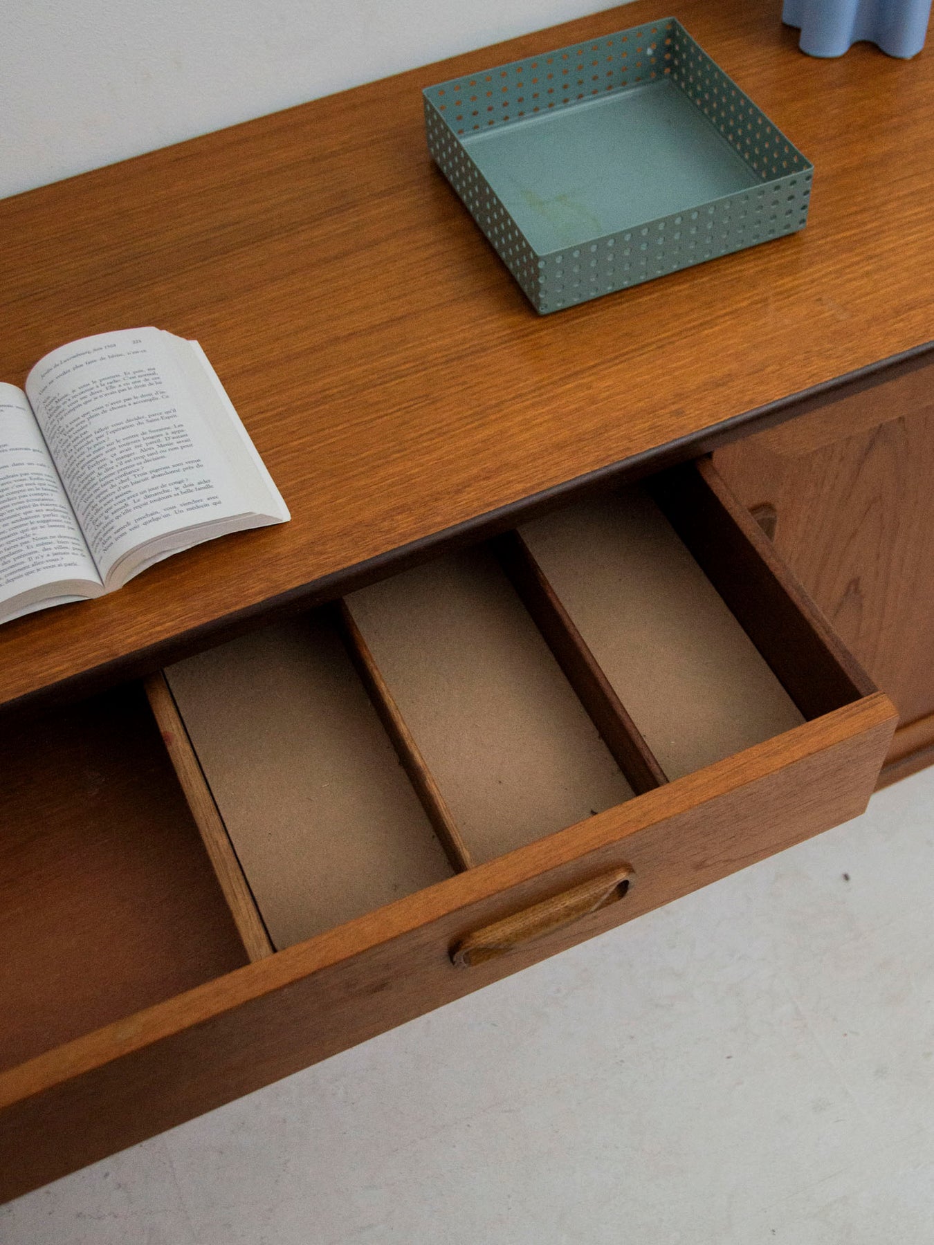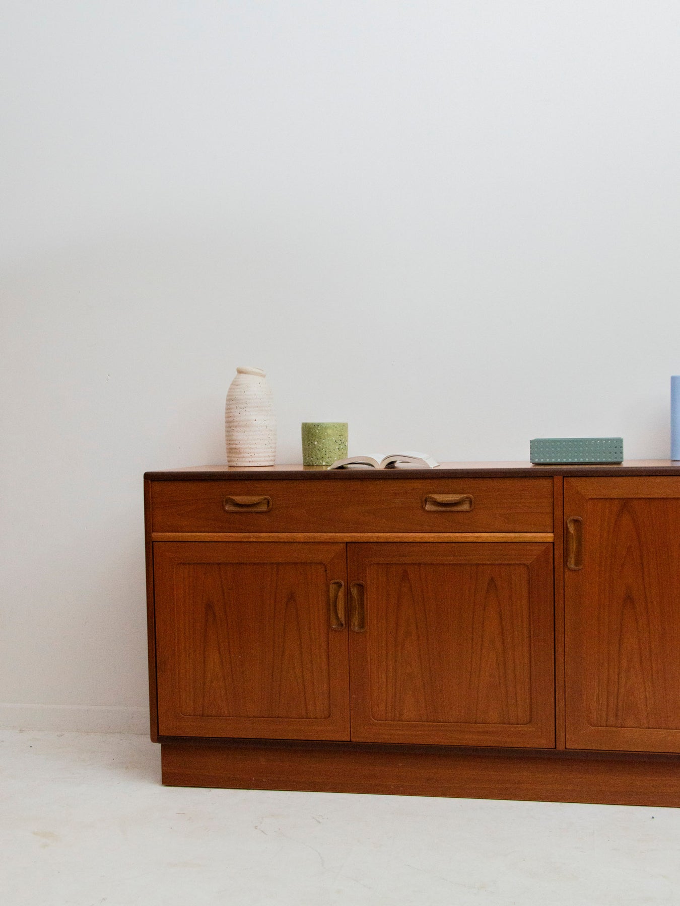 This solid teak Gplan sideboard boasts a simple yet warm appearance, enhanced by beautiful natural grain. Its three doors and large drawer offer ample storage, perfect for organizing a 10-12 place setting or for storing linens and small accessories. The wide base ensures stability, while the recessed handles provide a clean aesthetic and a discreet grip. Slight signs of age add to its charm.