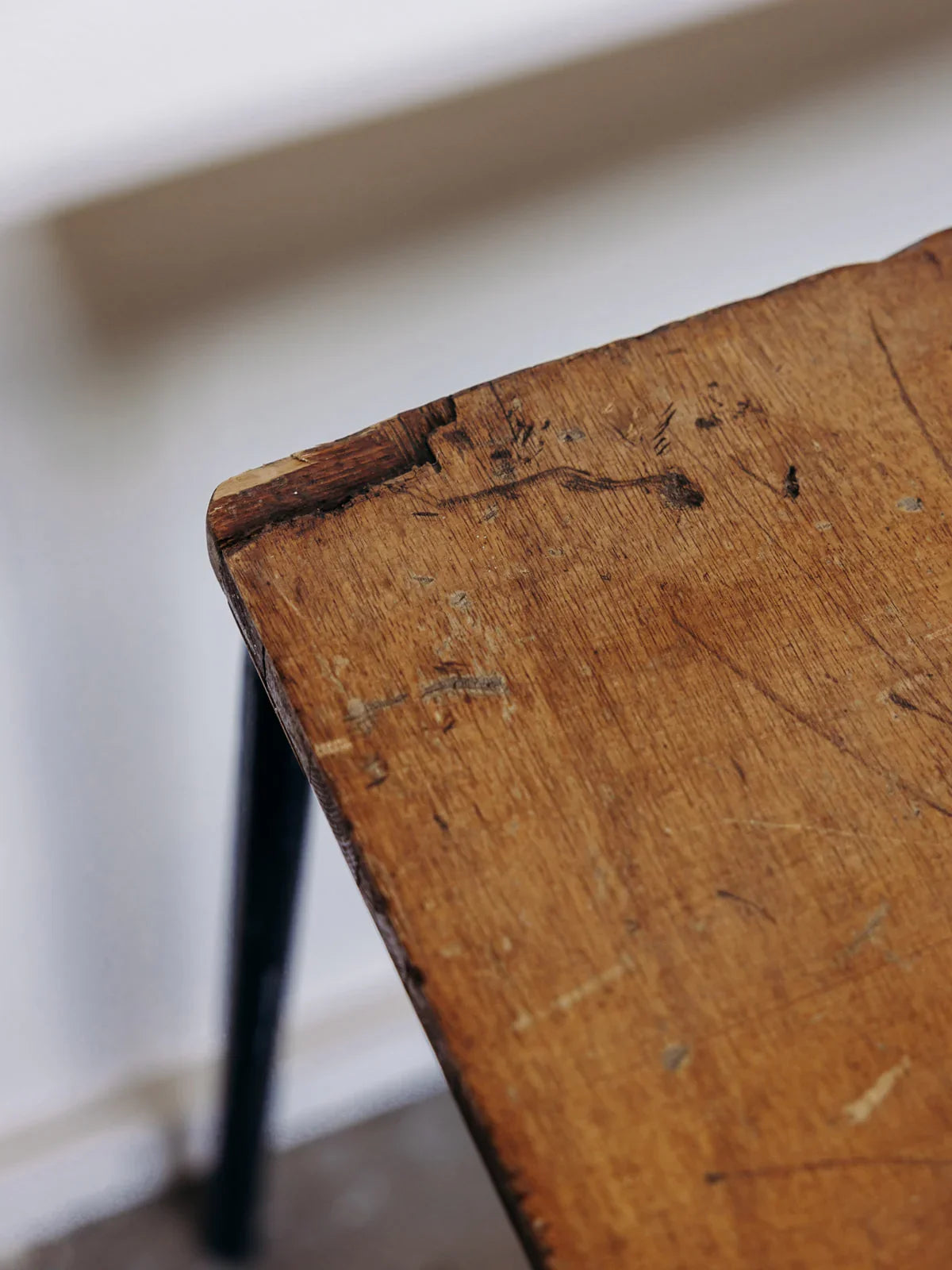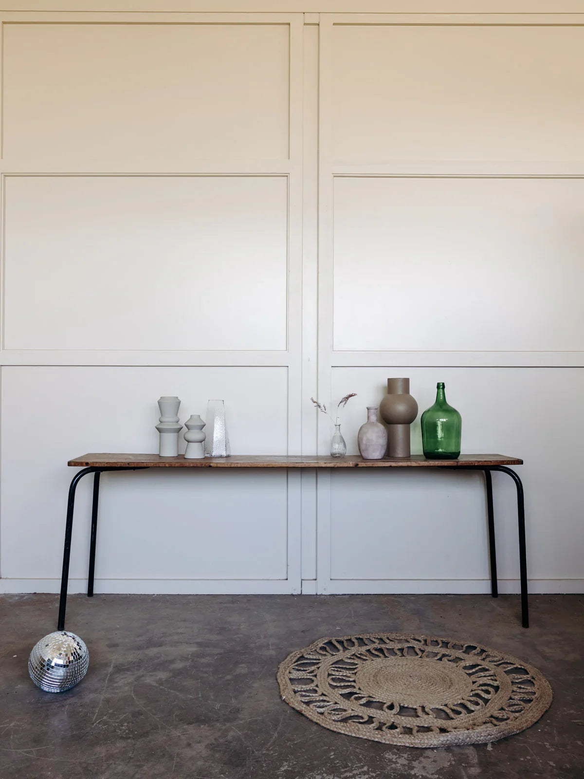 Add an industrial touch with this console table featuring a distressed, authentic look. Its black metal tube legs contrast beautifully with the plywood top. The distressed paint gives it a raw, characterful appearance. It can be used as a side table, desk, or entryway table. We have 5 similar models available.