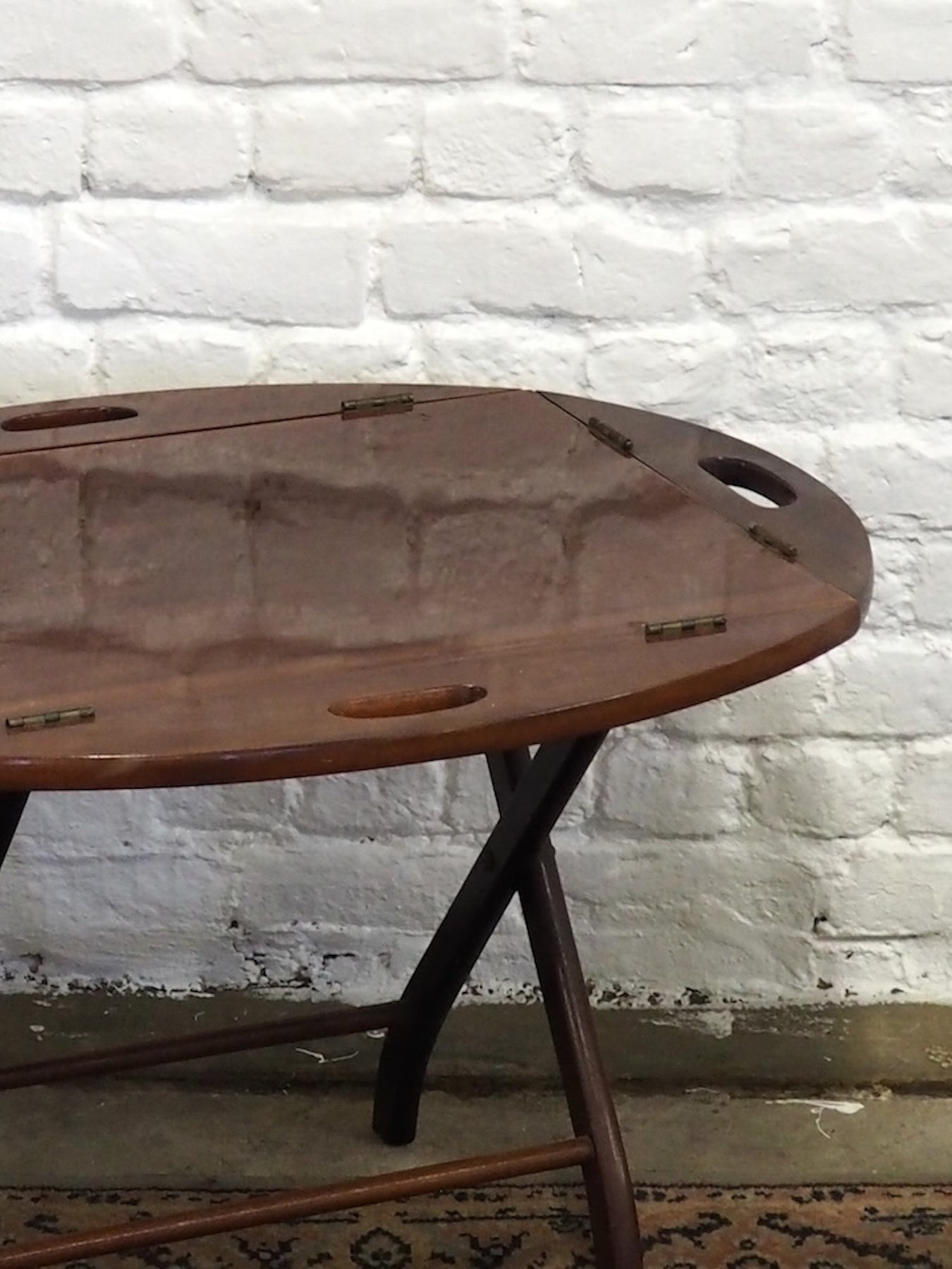 Discover this varnished mahogany butler tray, resting on its original folding base, which combines practicality and elegance. The generously sized tray is perfect for serving breakfast, presenting drinks, or unfolding into a small table to hold a lamp and decorative objects, while the folding base makes storage and portability easy. Its satin finish highlights the warmth of the wood and brings a classic and refined atmosphere to any interior.