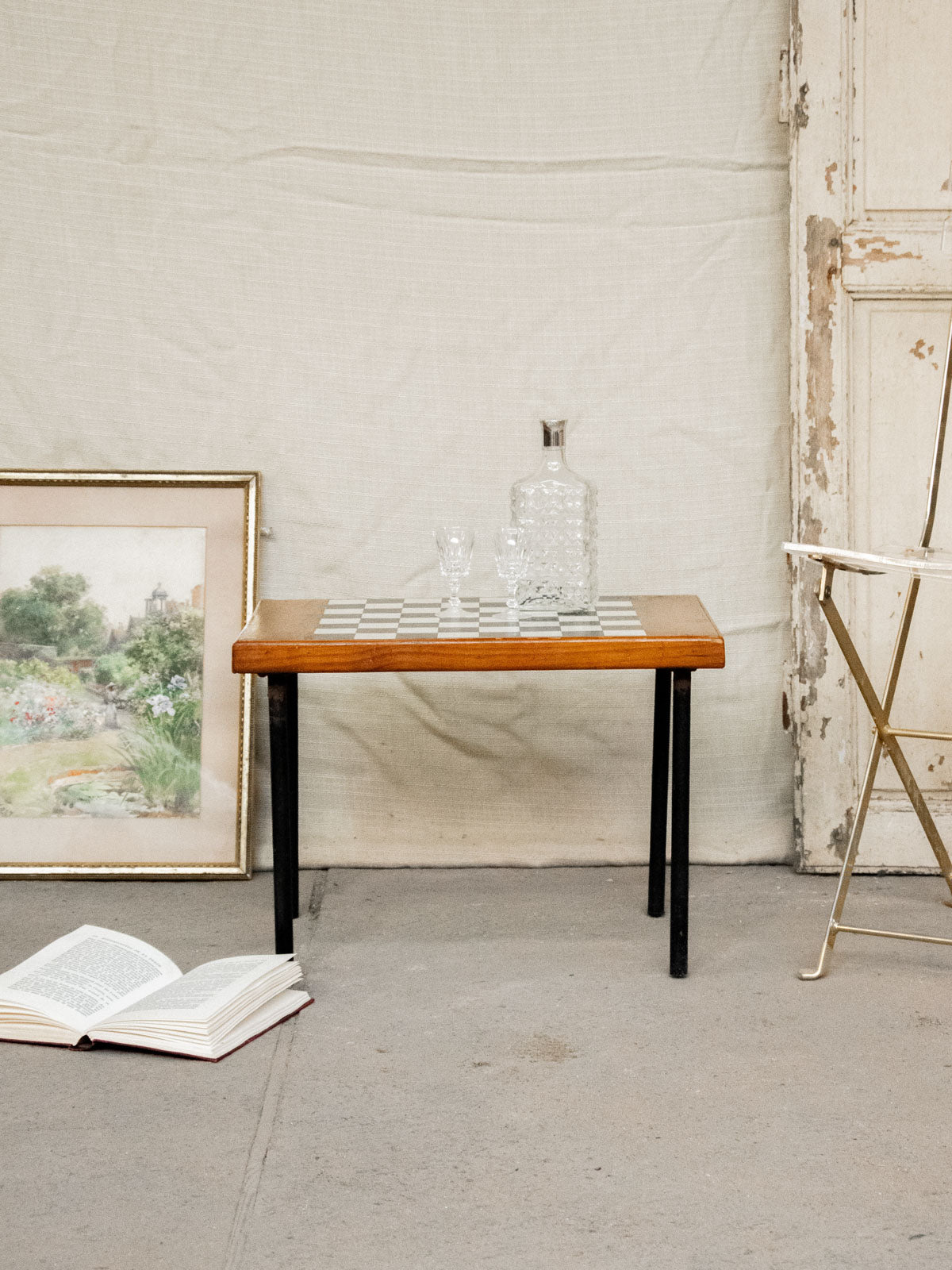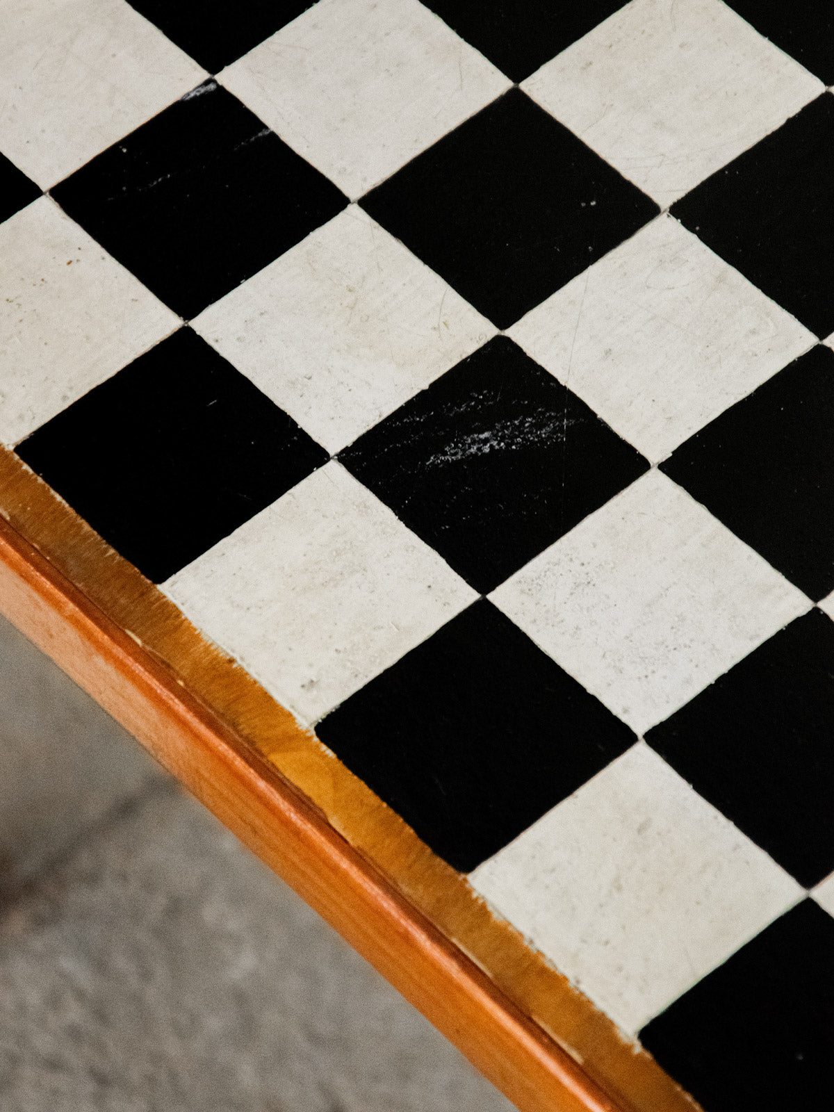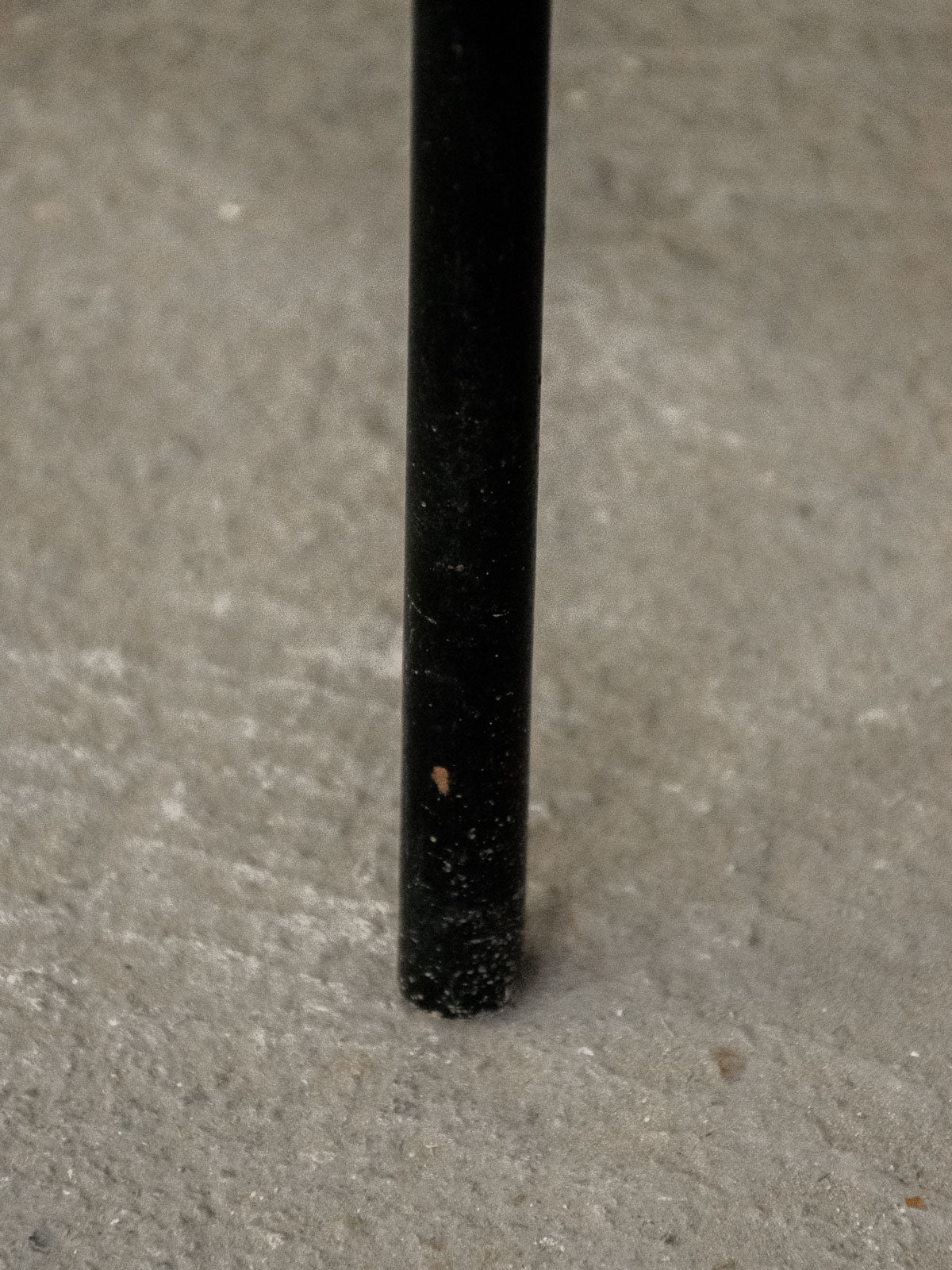 Invite this games table into your home with its industrial and inviting charm: its warm-grained wooden top, encircled by a molding, offers ideal proportions for game nights or creative workshops, while its black metal legs, marked by time, with rust spots and a slight twist, yet still stable, lend it character. Designed to last despite its patina, it creates a simple and inspiring atmosphere in a contemporary or bohemian interior. A few signs of wear that only add to its authenticity.