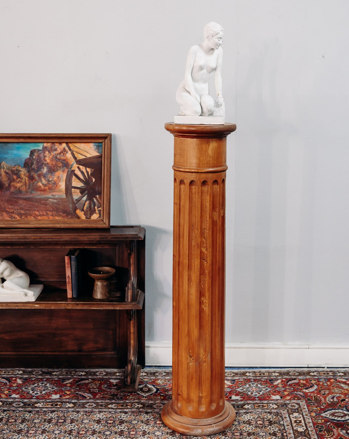 Discover this elegant orange wooden column, set on a round base and topped with a circular shelf, ideal for displaying a plant, sculpture, or lamp. Its warm hue and natural finish bring a cozy, contemporary touch to any interior, while its height creates a subtle yet striking visual focal point. The engraved DM monogram near the top adds a refined, handcrafted detail.