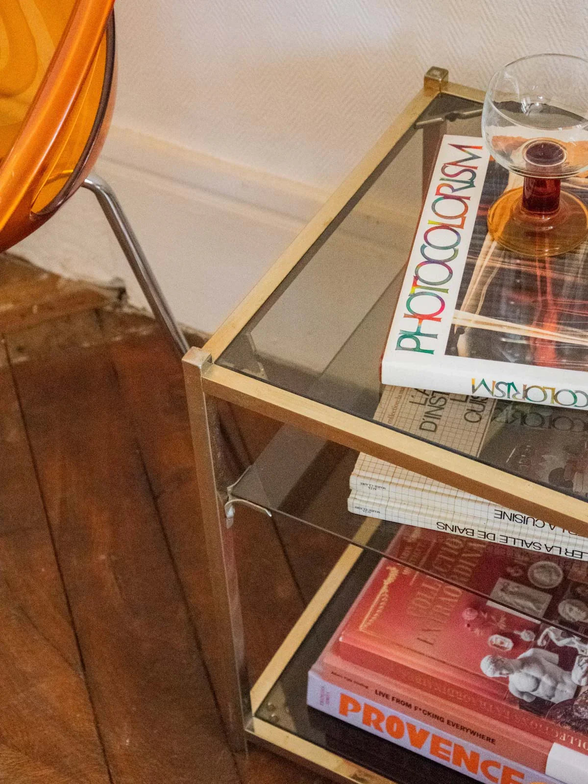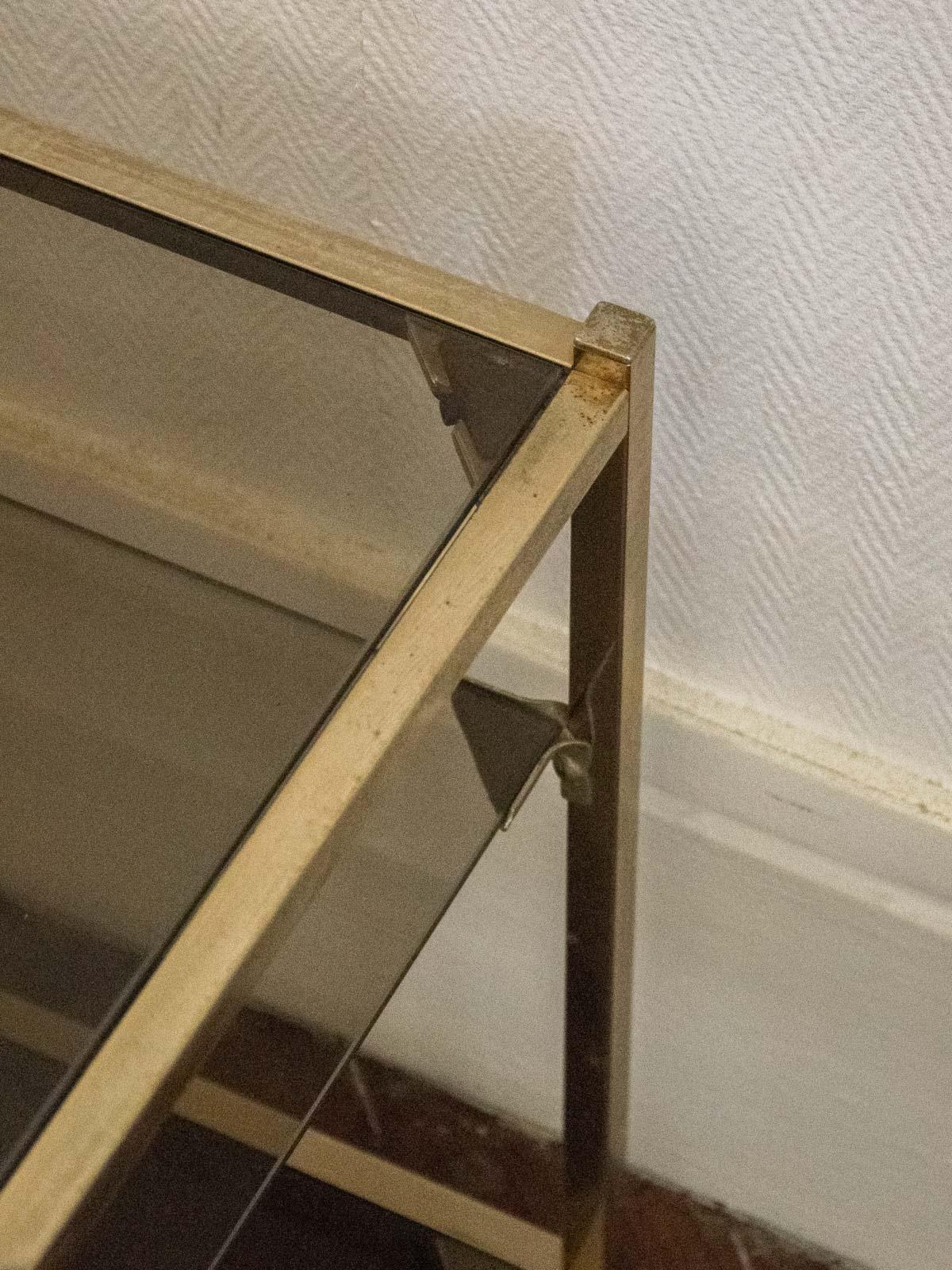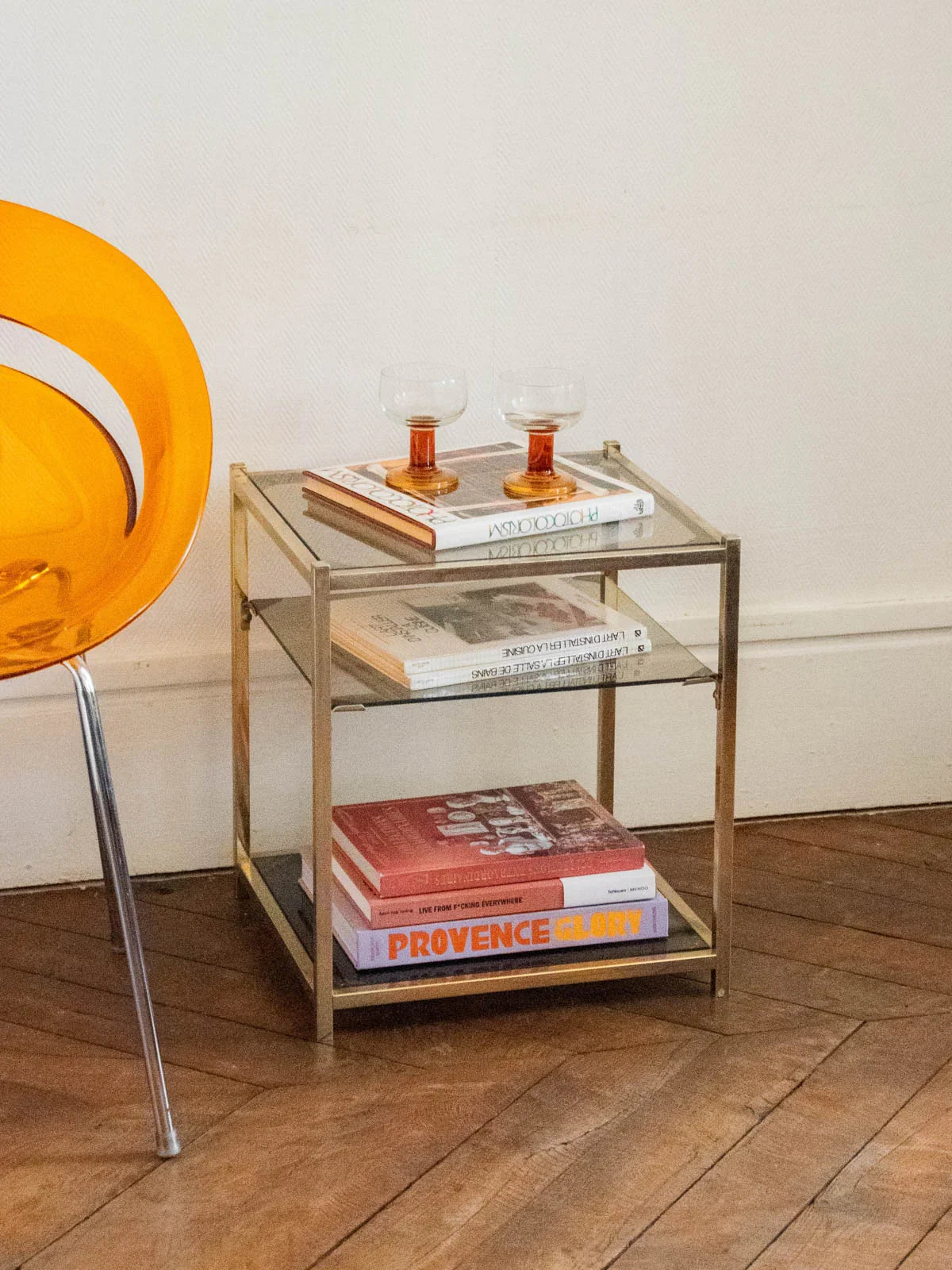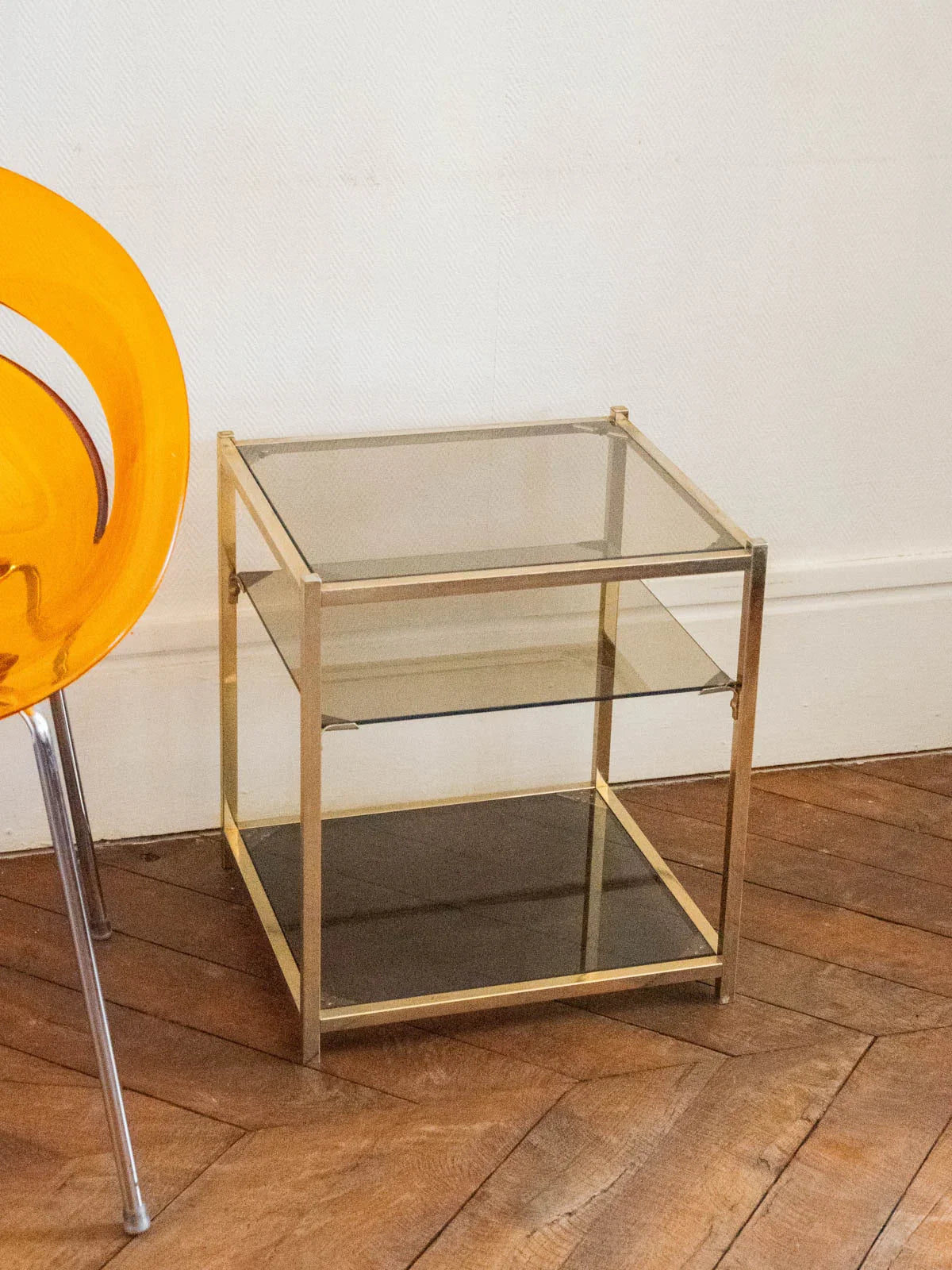 Add a contemporary touch to your living room with this side table, which combines a bright chrome frame with a smoked glass top. Its compact size and separate shelves offer organized storage for a lamp, books, and small everyday items, while maintaining an airy silhouette. The contrast of polished chrome and tinted glass creates a refined and modern atmosphere, ideal for a clean and inviting living space.