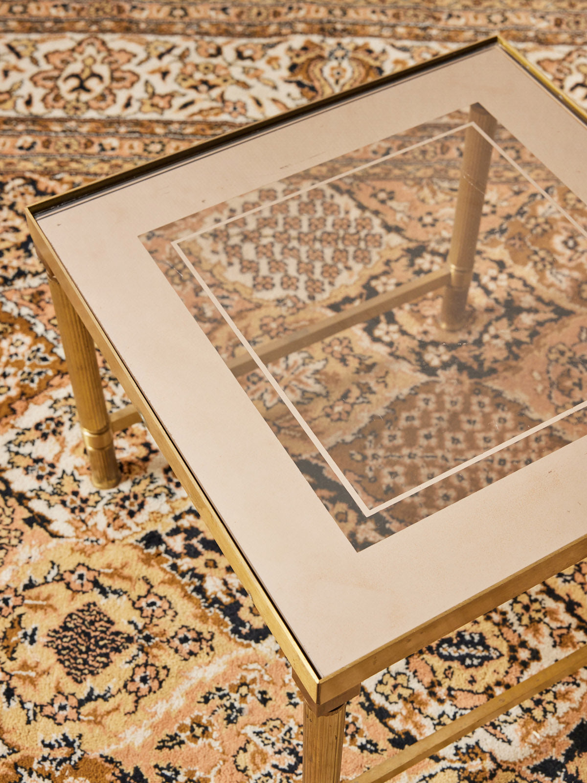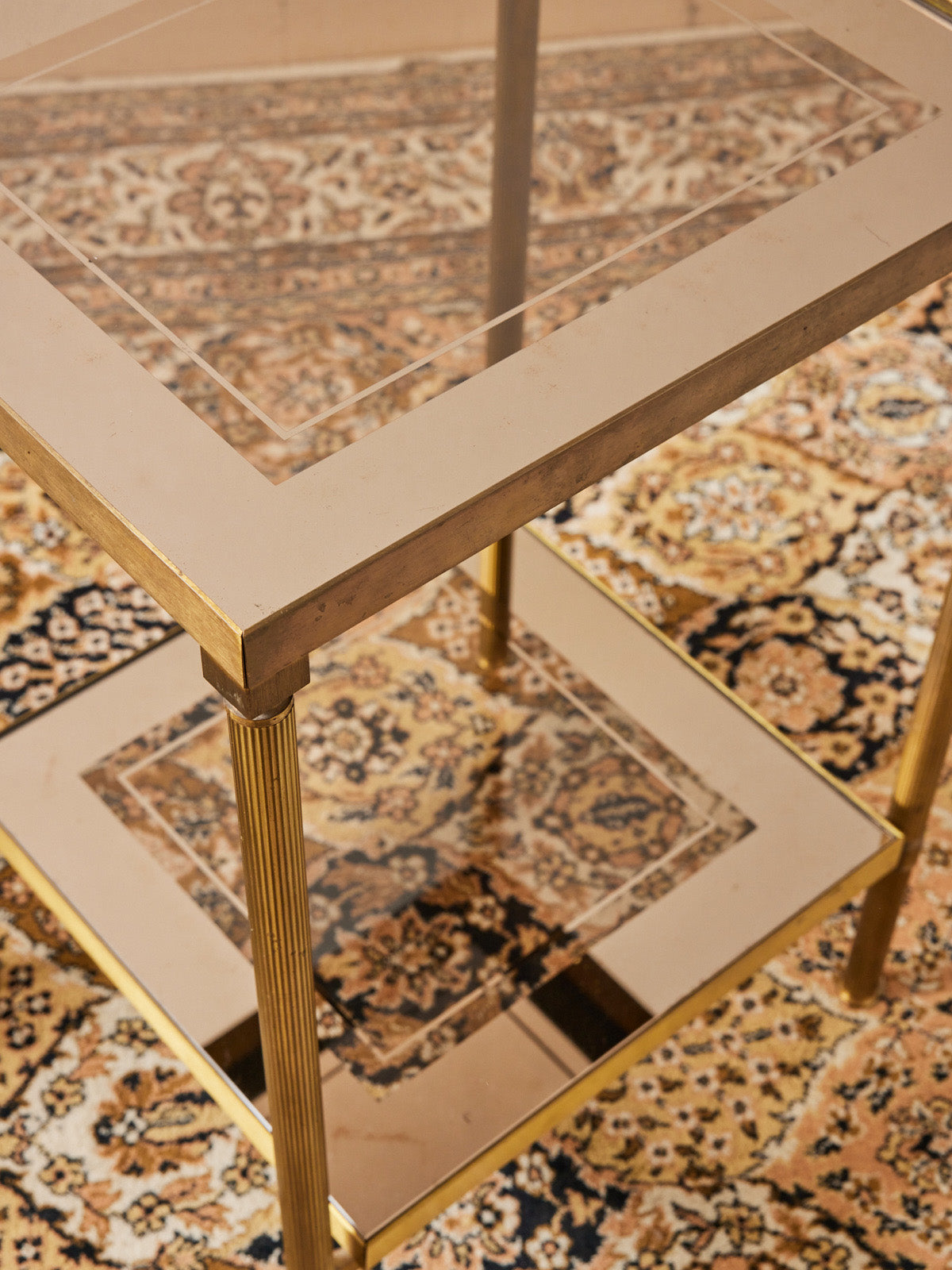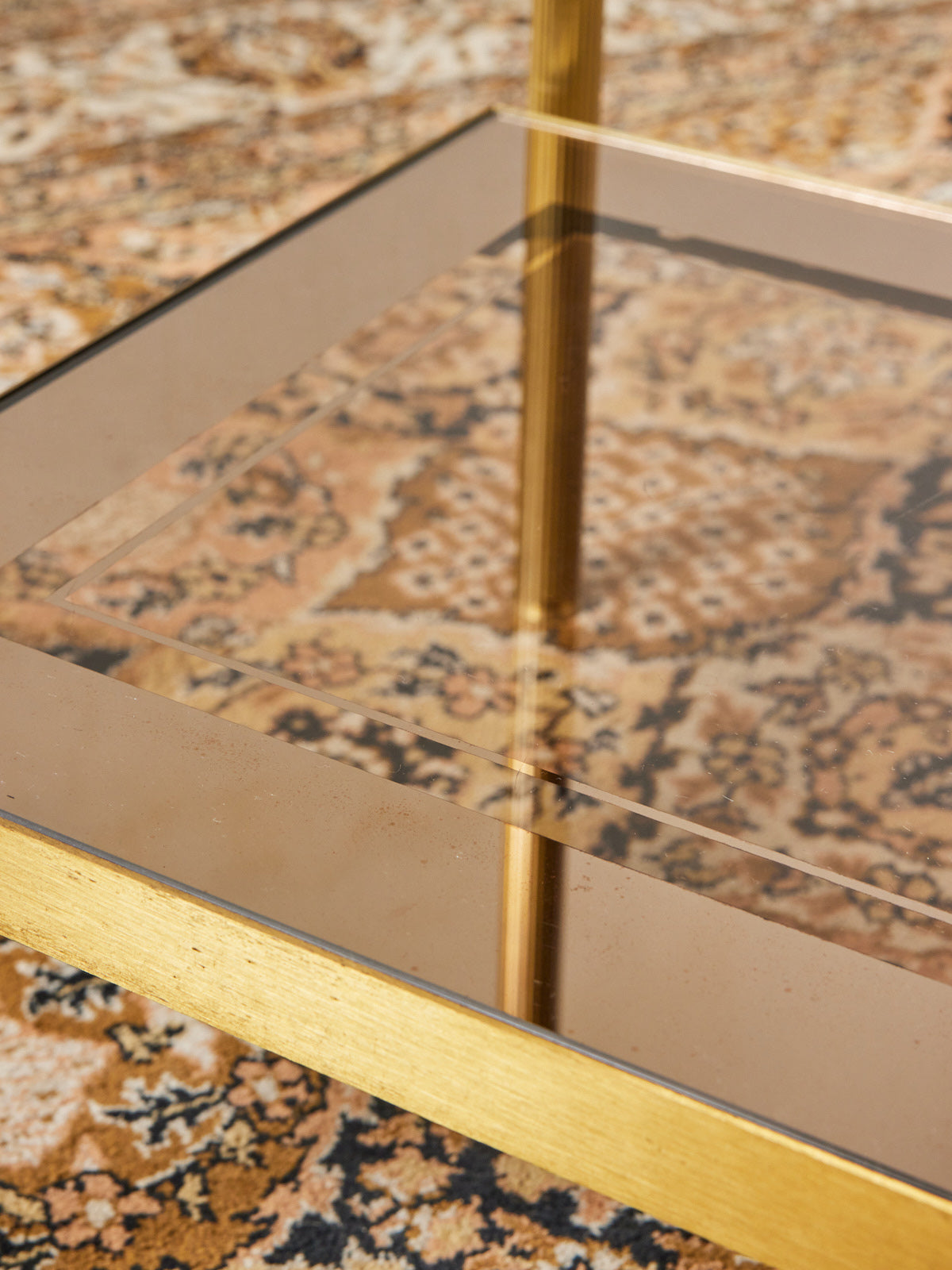 Choose a trio of polished brass side tables, consisting of one rectangular table and two smaller square models with smoked glass tops. The combination of warm metal and frosted glass creates a subtle interplay of reflections that structures the space without overwhelming it. Modular, they can be arranged together as a central piece or separated into bedside tables and end tables as needed, bringing a contemporary and sophisticated look to the living room. Their presence establishes a bright and refined atmosphere.
