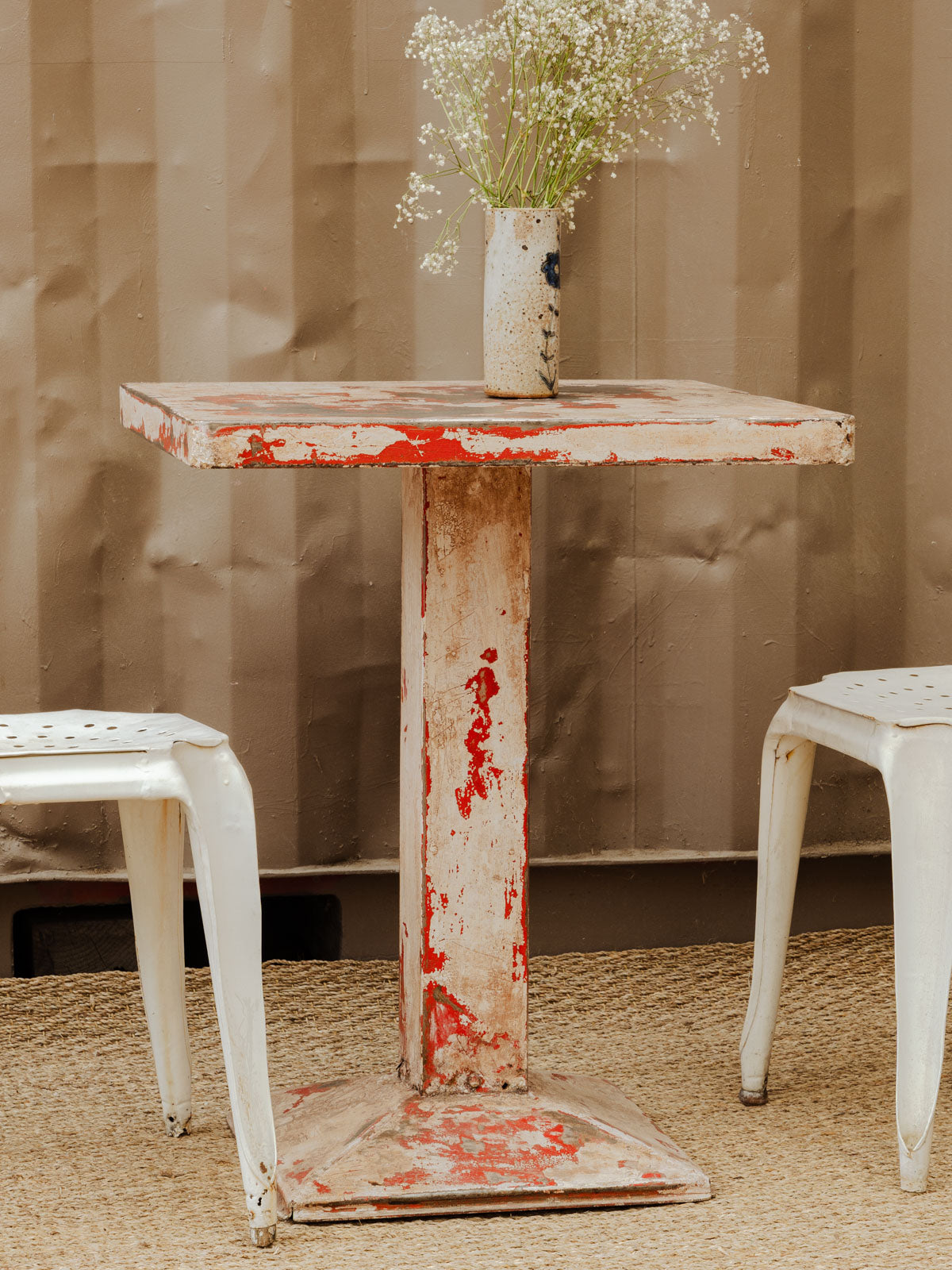 Discover this vintage Tolix table with a patinated finish, its industrial charm warmed by a red and white color scheme. The painted steel frame, with its patinated finish, offers a comfortable tabletop for 2 to 4 people, perfect for convivial meals or creating a lively coffee corner. Its clean lines and balanced proportions allow it to blend seamlessly into both contemporary and more rustic interiors. The interplay of paint and patina adds character and authenticity. Subtle signs of age only enhance its charm.