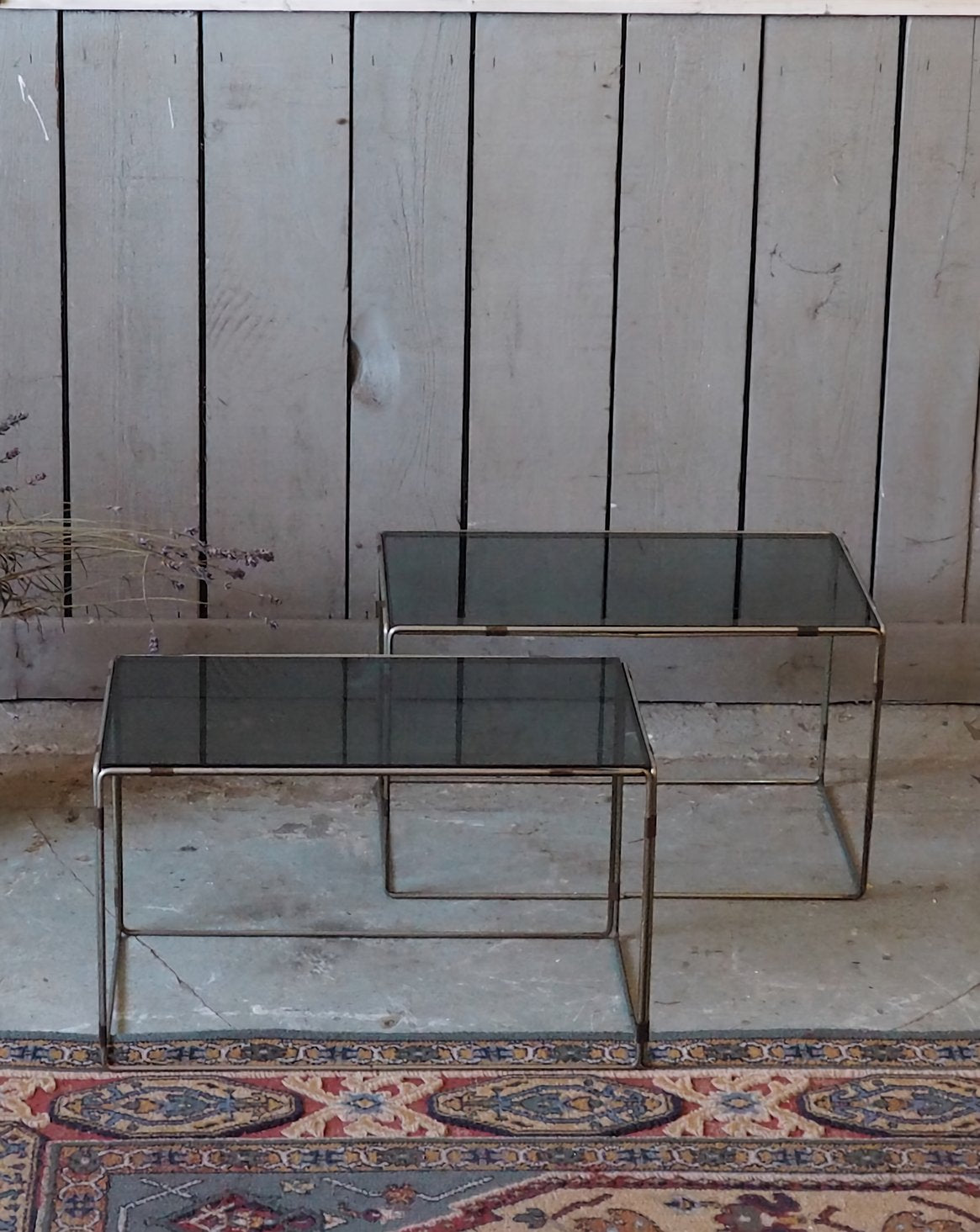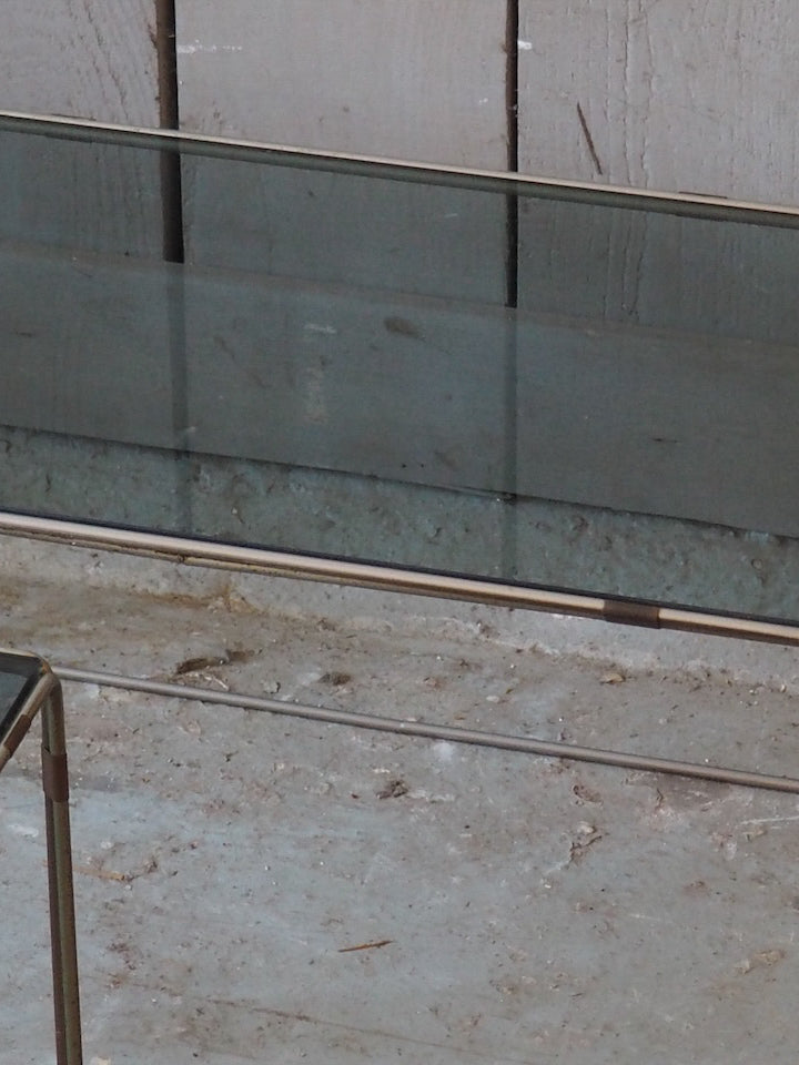 Discover this pair of blue smoked glass side tables, with a clean design that brings a contemporary and luminous touch to your living room. Their low, compact size creates a modular set, perfect for displaying magazines, lamps, and decorative objects while maintaining an elegant visual lightness. The tinted glass enhances reflections and subtly structures the space, suitable for both minimalist interiors and more intimate settings. One table has an oxidized section and a loose joint.