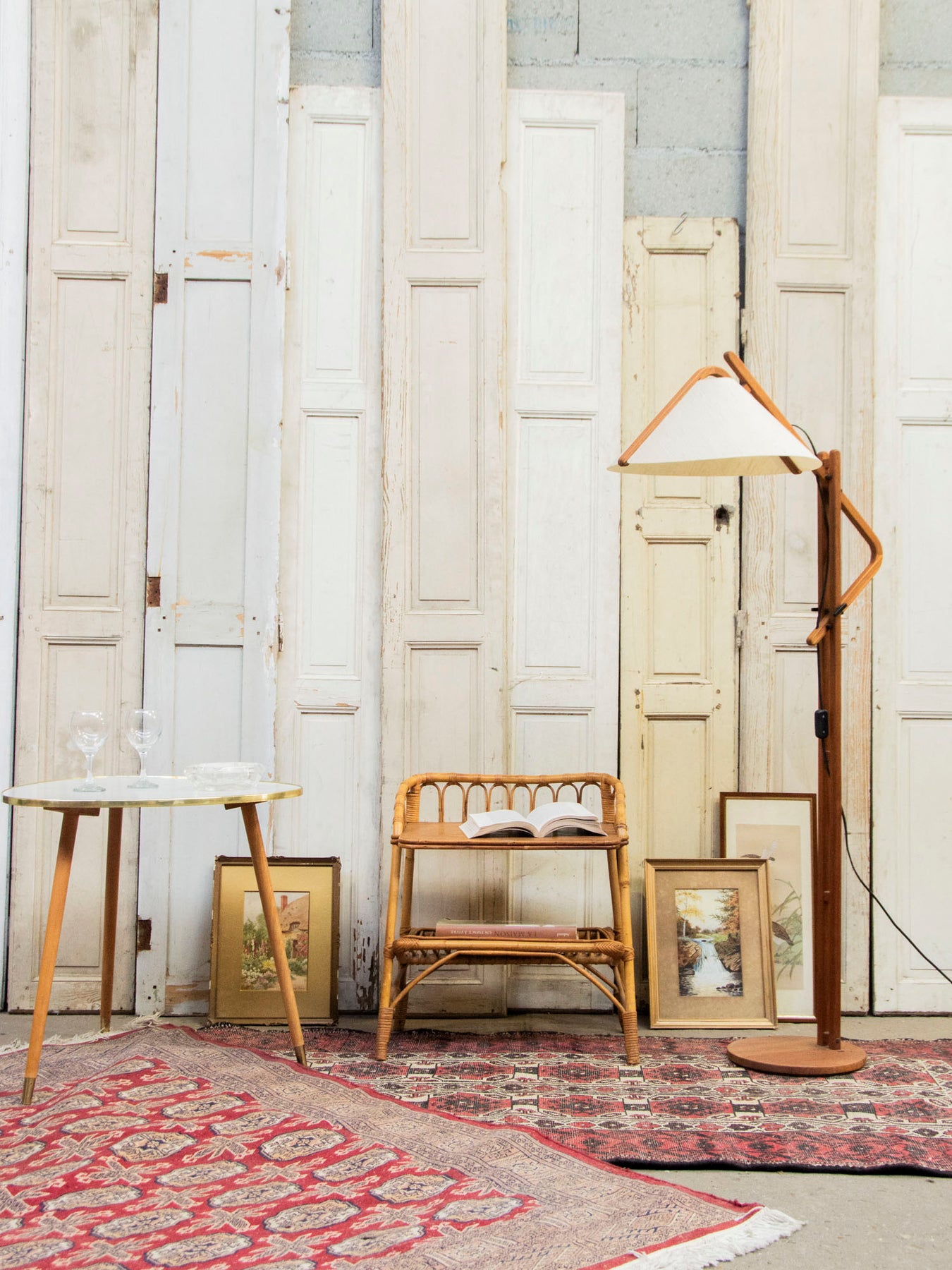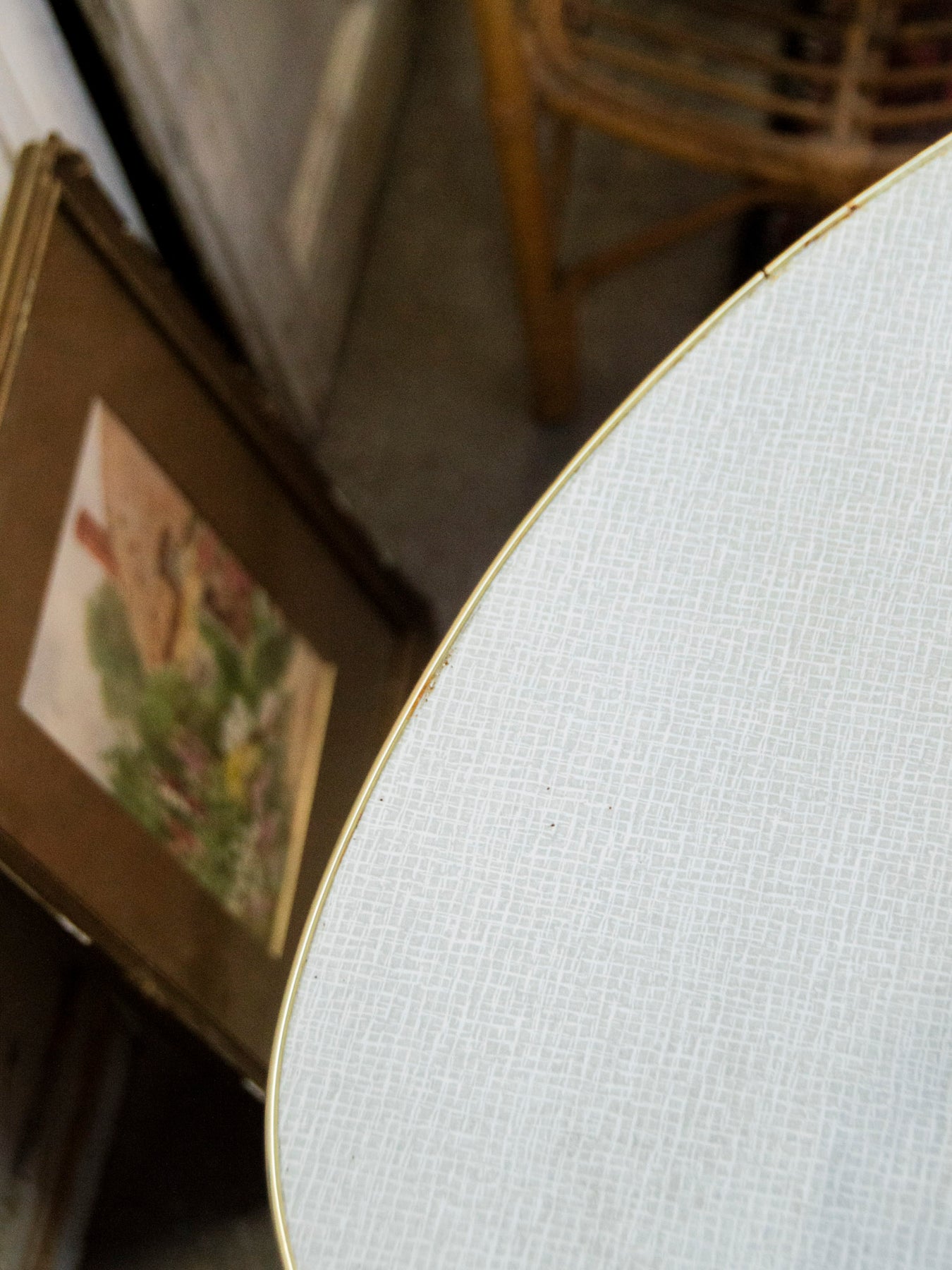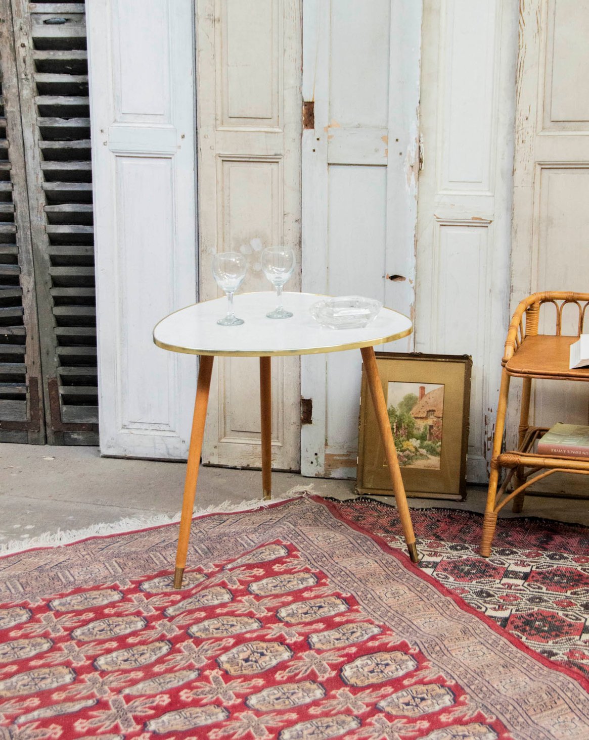 Sublimez votre intérieur avec cette table d'appoint triangulaire vintage des années 50/60, au plateau blanc en forme libre souligné d'un liseré doré qui capte la lumière. Ses trois pieds compas en bois clair, ponctués d'embouts laiton, lui offrent une silhouette aérienne et stable, idéale pour un salon, un coin lecture ou comme table de bout de canapé. Son format compact apporte une note mid-century chaleureuse et graphique, parfaite pour compléter une décoration sobre et inspirée.